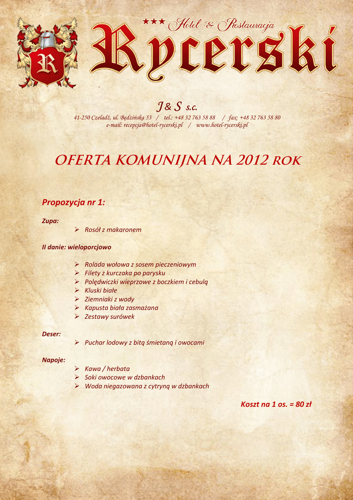 J&S s.c. 41-250 Czeladź, ul. Będzińska 53 / tel.: +48 32 763 58 88 / fax: +48 32 763 58 80 e-mail: [email protected] / www.hotel-rycerski.pl OFERTA KOMUNIJNA NA 2012 rok Propozycja nr 1: Zupa: Rosół z makaronem II danie: wieloporcjowo Rolada wołowa z sosem pieczeniowym Filety z kurczaka po parysku Polędwiczki wieprzowe z boczkiem i cebulą Kluski białe Ziemniaki z wody Kapusta biała zasmażana Zestawy surówek Deser: Puchar lodowy z bitą śmietaną i owocami Napoje: Kawa / herbata Soki owocowe w dzbankach Woda niegazowana z cytryną w dzbankach Koszt na 1 os. = 80 zł Propozycja nr 2: Zupa: Rosół z makaronem II danie: wieloporcjowo Rolada wieprzowa w sosie pieczeniowym Schab z pieczarkami i serem Kotlet de volaille Kluski białe Ziemniaki zasmażane Kapusta czerwona na gorąco z boczkiem i rodzynkami Zestaw surówek Deser: Lody waniliowe w owocowym sosie Napoje: Kawa / herbata Soki owocowe w dzbankach Woda niegazowana z cytryną w dzbankach Koszt na 1 os. = 75 zł Propozycja nr 3: Zupa: Rosół z makaronem II danie: wieloporcjowo Rolada wołowa w sosie pieczeniowym Schab panierowany Filet z kurczaka z pieczarkami, serem, pomidorem i bazylią Kluski białe Ziemniaki z wody Kapusta czerwona na gorąco z boczkiem i rodzynkami Zestaw surówek Kapusta biała zasmażana Deser: Lody Cassatte z bitą śmietaną i owocami Napoje: Kawa / herbata Soki owocowe w dzbankach Woda niegazowana z cytryną w dzbankach Koszt na 1 os. = 75 zł Propozycja nr 4: Zupa: Rosół z makaronem II danie: wieloporcjowo Rolada wołowa z sosem pieczeniowym Filety z kurczaka po parysku Polędwiczki wieprzowe z boczkiem i cebulą Kluski białe Ziemniaki z wody Kapusta biała zasmażana Zestawy surówek Deser: Puchar lodowy z bitą śmietaną i owocami Napoje: Kawa / herbata Soki owocowe w dzbankach Woda niegazowana z cytryną w dzbankach Zimna płyta: Półmisek mięs pieczonych Decha serów Półmisek wędlin Roladki szynkowe z musem chrzanowym w galarecie Śledzie w śmietanie Jaja faszerowane Sałatka jarzynowa Sałatka Rycerska Pieczywo Masło smakowe Koszt na 1 os. = 130 zł Propozycja nr 5: Zupa: Rosół z makaronem II danie: wieloporcjowo Rolada wieprzowa w sosie pieczeniowym Schab z pieczarkami i serem Kotlet de volaille Kluski białe Ziemniaki zasmażane Kapusta czerwona na gorąco z boczkiem i rodzynkami Zestaw surówek Deser: Lody waniliowe w owocowym sosie Napoje: Kawa / herbata Soki owocowe w dzbankach Woda niegazowana z cytryną w dzbankach Zimna płyta: Półmisek mięs pieczonych Decha serów Półmisek wędlin Roladki szynkowe z musem chrzanowym w galarecie Śledzie w śmietanie Jaja faszerowane Sałatka jarzynowa Sałatka Rycerska Pieczywo Masło smakowe Koszt na 1 os. = 125 zł Propozycja nr 6: Zupa: Rosół z makaronem II danie: wieloporcjowo Rolada wołowa w sosie pieczeniowym Schab panierowany Filet z kurczaka z pieczarkami, serem, pomidorem i bazylią Kluski białe Ziemniaki z wody Kapusta czerwona na gorąco z boczkiem i rodzynkami Zestaw surówek Kapusta biała zasmażana Deser: Lody Cassatte z bitą śmietaną i owocami Napoje: Kawa / herbata Soki owocowe w dzbankach Woda niegazowana z cytryną w dzbankach Zimna płyta: Półmisek mięs pieczonych Decha serów Półmisek wędlin Roladki szynkowe z musem chrzanowym w galarecie Śledzie w śmietanie Jaja faszerowane Sałatka jarzynowa Sałatka Rycerska Pieczywo Masło smakowe Koszt na 1 os. = 125 zł Propozycja nr 7: Zupa: Rosół z makaronem II danie: wieloporcjowo Rolada wołowa z sosem pieczeniowym Filety z kurczaka po parysku Polędwiczki wieprzowe z boczkiem i cebulą Kluski białe Ziemniaki z wody Kapusta biała zasmażana Zestawy surówek Deser: Puchar lodowy z bitą śmietaną i owocami Napoje: Kawa / herbata Soki owocowe w dzbankach Woda niegazowana z cytryną w dzbankach Zimna płyta: Półmisek mięs pieczonych Decha serów Półmisek wędlin Roladki szynkowe z musem chrzanowym w galarecie Śledzie w śmietanie Jaja faszerowane Sałatka jarzynowa Sałatka Rycerska Pieczywo Masło smakowe Kolacja: Barszcz z uszkami Koszt na 1 os. = 140 zł Propozycja nr 8: Zupa: Rosół z makaronem II danie: wieloporcjowo Rolada wieprzowa w sosie pieczeniowym Schab z pieczarkami i serem Kotlet de volaille Kluski białe Ziemniaki zasmażane Kapusta czerwona na gorąco z boczkiem i rodzynkami Zestaw surówek Deser: Lody waniliowe w owocowym sosie Napoje: Kawa / herbata Soki owocowe w dzbankach Woda niegazowana z cytryną w dzbankach Zimna płyta: Półmisek mięs pieczonych Decha serów Półmisek wędlin Roladki szynkowe z musem chrzanowym w galarecie Śledzie w śmietanie Jaja faszerowane Sałatka jarzynowa Sałatka Rycerska Pieczywo Masło smakowe Kolacja: Krem pieczarkowy z groszkiem ptysiowym Koszt na 1 os. = 135 zł Propozycja nr 9: Zupa: Rosół z makaronem II danie: wieloporcjowo Rolada wołowa w sosie pieczeniowym Schab panierowany Filet z kurczaka z pieczarkami, serem, pomidorem i bazylią Kluski białe Ziemniaki z wody Kapusta czerwona na gorąco z boczkiem i rodzynkami Zestaw surówek Kapusta biała zasmażana Deser: Lody Cassatte z bitą śmietaną i owocami Napoje: Kawa / herbata Soki owocowe w dzbankach Woda niegazowana z cytryną w dzbankach Zimna płyta: Półmisek mięs pieczonych Decha serów Półmisek wędlin Roladki szynkowe z musem chrzanowym w galarecie Śledzie w śmietanie Jaja faszerowane Sałatka jarzynowa Sałatka Rycerska Pieczywo Masło smakowe Kolacja: Żurek do picia Koszt na 1 os. = 130 zł Zapraszamy do skorzystania z naszej oferty! Rezerwacja terminów pod numerami: 500 073 477 Edyta Gos - Szurdyga 500 073 478 Magdalena Klos – Trimino www.hotel-rycerski.pl