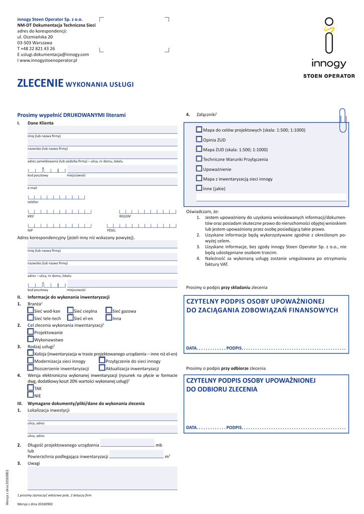 innogy Stoen Operator Sp. z o.o. NM-DT Dokumentacja Techniczna Sieci adres do korespondencji: ul. Oszmiańska 20 03-503 Warszawa T +48 22 821 43 26 E [email protected] I www.innogystoenoperator.pl ZLECENIE WYKONANIA USŁUGI Prosimy wypełnić DRUKOWANYMI literami I. 4. Dane Klienta Mapa do celów projektowych (skala: 1:500; 1:1000) Opinia ZUD nazwisko (lub nazwa firmy) Mapa ZUD (skala: 1:500; 1:1000) adres zameldowania (lub siedziba firmy) – ulica, nr domu, lokalu Techniczne Warunki Przyłączenia Upoważnienie Mapa z inwentaryzacją sieci innogy e-mail Inne (jakie) telefon imię (lub nazwa firmy) kod pocztowy miejscowość Oświadczam, że: 1. Jestem upoważniony do uzyskania wnioskowanych informacji/dokumentów oraz posiadam skuteczne prawo do nieruchomości objętej wnioskiem lub jestem upoważniony przez osobę posiadającą takie prawo. 2. Uzyskane informacje będą wykorzystywane zgodnie z określonym powyżej celem. 3. Uzyskane informacje, bez zgody innogy Stoen Operator Sp. z o.o., nie będą udostępniane osobom trzecim. 4. Należność za wykonaną usługę zostanie uregulowana po otrzymaniu faktury VAT. KRS2REGON2 NIP PESEL Adres korespondencyjny (jeżeli inny niż wskazany powyżej). imię (lub nazwa firmy) nazwisko (lub nazwa firmy) adres – ulica, nr domu, lokalu Prosimy o podpis przy składaniu zlecenia kod pocztowy II. 1. 2. 3. 4. Informacje do wykonania inwentaryzacji Branża1 Sieć wod-kan Sieć cieplna Sieć gazowa Sieć tele-tech Sieć el-en Inna Cel zlecenia wykonania inwentaryzacji1 Projektowanie Wykonawstwo Rodzaj usługi1 Kolizja (inwentaryzacja w trasie projektowanego urządzenia – inne niż el-en) Modernizacja sieci innogy Przyłączenie do sieci innogy Rozszerzenie inwentaryzacji Aktualizacja inwentaryzacji Wersja elektroniczna wykonanej inwentaryzacji (rysunek na płycie w formacie dwg, dodatkowy koszt 20% wartości wykonanej usługi)1 TAK NIE Załączniki1 miejscowość CZYTELNY PODPIS OSOBY UPOWAŻNIONEJ DO ZACIĄGANIA ZOBOWIĄZAŃ FINANSOWYCH DATA. . . . . . . . . . . . . PODPIS. . . . . . . . . . . . . . . . . . . . . . . . . . . . . . . . . . . . . . . . . . . . . . Prosimy o podpis przy odbiorze zlecenia CZYTELNY PODPIS OSOBY UPOWAŻNIONEJ DO ODBIORU ZLECENIA III. Wymagane dokumenty/pliki/dane do wykonania zlecenia 1. Lokalizacja inwestycji Wersja z dnia 20160902 ulica, adres ulica, adres 2. 3. Długość projektowanego urządzenia lub Powierzchnia podlegająca inwentaryzacji Uwagi 1 prosimy zaznaczyć właściwe pole, 2 dotyczy firm Wersja z dnia 20160902 DATA. . . . . . . . . . . . . PODPIS. . . . . . . . . . . . . . . . . . . . . . . . . . . . . . . . . . . . . . . . . . . . . . mb m2