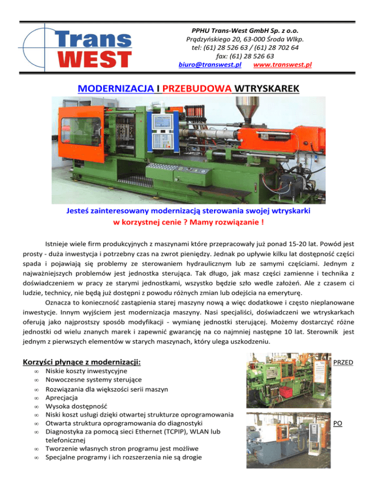 PPHU Trans-West GmbH Sp. z o.o. Prądzyńskiego 20, 63-000 Środa Wlkp. tel: (61) 28 526 63 / (61) 28 702 64 fax: (61) 28 526 63 [email protected] www.transwest.pl MODERNIZACJA I PRZEBUDOWA WTRYSKAREK Jesteś zainteresowany modernizacją sterowania swojej wtryskarki w korzystnej cenie ? Mamy rozwiązanie ! Istnieje wiele firm produkcyjnych z maszynami które przepracowały już ponad 15-20 lat. Powód jest prosty - duża inwestycja i potrzebny czas na zwrot pieniędzy. Jednak po upływie kilku lat dostępność części spada i pojawiają się problemy ze sterowaniem hydraulicznym lub ze samymi częściami. Jednym z najważniejszych problemów jest jednostka sterująca. Tak długo, jak masz części zamienne i technika z doświadczeniem w pracy ze starymi jednostkami, wszystko będzie szło wedle założeń. Ale z czasem ci ludzie, technicy, nie będą już dostępni z powodu różnych zmian lub odejścia na emeryturę. Oznacza to konieczność zastąpienia starej maszyny nową a więc dodatkowe i często nieplanowane inwestycje. Innym wyjściem jest modernizacja maszyny. Nasi specjaliści, doświadczeni we wtryskarkach oferują jako najprostszy sposób modyfikacji - wymianę jednostki sterującej. Możemy dostarczyć różne jednostki od wielu znanych marek i zapewnić gwarancję na co najmniej następne 10 lat. Sterownik jest jednym z pierwszych elementów w starych maszynach, który ulega uszkodzeniu. Korzyści płynące z modernizacji: • • • • • • • • • • Niskie koszty inwestycyjne Nowoczesne systemy sterujące Rozwiązania dla większości serii maszyn Aprecjacja Wysoka dostępność Niski koszt usługi dzięki otwartej strukturze oprogramowania Otwarta struktura oprogramowania do diagnostyki Diagnostyka za pomocą sieci Ethernet (TCPIP), WLAN lub telefonicznej Tworzenie własnych stron programu jest możliwe Specjalne programy i ich rozszerzenia nie są drogie PRZED PO W ciągu ostatnich 20 lat zostało sprzedanych kilka tysięcy wtryskarek. Ze względu na ciągły rozwój rynku i oczekiwań klienta co do jakości, w tym okresie w jednej fabryce występowało już 6 generacji sterowników. Natomiast sama technologia i mechanika urządzeń nie zmieniła się zbytnio w tym czasie. Są to maszyny typu dwu- i trzy- płytowe, plungery (wyciskowe) oraz wszelkiego rodzaju starsze maszyny z klamrami i zaciskami. Żywotność wtryskarek jest znacznie większa niż żywotność jednostek sterujących. Do dziś można znaleźć maszyny w zakładzie produkcyjnym, dla których czas pracy jest już dłuższy niż 20 lat. Oznacza to, że urządzenia działają dobrze, dopóki sterowanie pracuje odpowiednio. Planowanie produkcji na starych maszynach jest bardzo trudne ze względu na bardzo niską dostępność części i wiele innych ograniczeń. Zmodernizowaliśmy już maszyny serii: Battenfeld, Bodini, Bucher, Cincinatti Milacron, Demag, Haitian, Krauss-Maffei , Multiplas , NPM, REMU, Sandretto, TMC, Van Dorn, Welltec, Werner+Pfleiderer, Windsor itd. Sterownik Siemens S7 Przykładowy sterownik: Siemens MP377 15″ TOUCH, WINAC - Kolorowy ekran 15" TFT + odporna klawiatura - Zapisywanie do 99 programów / ustawień wtrysku - Do 64 stref ogrzewania wtrysku - Języki niemiecki / angielski - Hasło - 9 kroków - Przełączniki SI - Euromap 12/67 - 8 rdzeni z ustawieniem kolejności priorytetów - 4 zawory powietrzne - Programy wtrysku i programy czyszczące - Kontrola produkcji z tolerancjami min - max - Możliwe automatyczne zatrzymanie maszyny - Tabela jakości 16 x 200 z modyfikacją tolerancji - 8 baryłkowych stref grzewczych samouczących - 8 stref wtrysku grzania / chłodzenia samouczących - Kontrola otwierania, zamykania, wtryskiwania, dozowania , obsługa wyrzutnika - Strony diagnostyczne na ekranie - Wyświetlania alarmów na wszystkich stronach ekranu - Cykl maszyny widoczny na ekranie - Interfejsy USB do drukarki i myszki - USB do zapoznania się z serwisem maszyny i danymi wtrysku - Połączenie Ethernet dla serwisu i sieci wewnętrznej W CELU ZAPOZNANIA SIĘ Z PEŁNYM ASORTYMENTEM SERDECZNIE ZAPRASZAMY NA NASZĄ STRONĘ INTERNETOWĄ: www.transwest.pl ZAPYTANIA OFERTOWE PROSIMY KIEROWAĆ NA: [email protected]