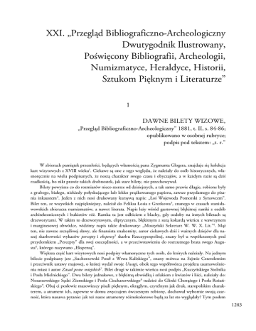 XXI. „Przegląd Bibliograficzno-Archeologiczny Dwutygodnik Ilustrowany, Poświęcony Bibliografii, Archeologii, Numizmatyce, Heraldyce, Historii, Sztukom Pięknym i Literaturze” 1 DAWNE BILETY WIZOWE, „Przegląd Bibliograficzno-Archeologiczny” 1881, t. II, s. 84-86; opublikowano w osobnej rubryce; podpis pod tekstem: „t. r.” W zbiorach pamiątek przeszłości, będących własnością pana Zygmunta Glogera, znajduje się kolekcja kart wizytowych z XVIII wieku1. Ciekawe są one z tego względu, że należały do osób historycznych, własnoręcznie na wielu podpisanych, że noszą charakter swego czasu i obyczajów, a w każdym razie są dziś rzadkością, bo nikt prawie takich drobnostek, jak stare bilety, nie przechowywał. Bilety powyższe co do rozmiarów nieco szersze od dzisiejszych, a tak samo prawie długie, robione były z grubego, białego, niekiedy połyskującego lub lekko prążkowanego papieru, zawsze przydatnego do pisania inkaustem 2. Jeden z nich nosi drukowany kursywą napis: „Łoś Wojewoda Pomorski z Synowcem”. Bilet ten, ze wszystkich najpiękniejszy, należał do Feliksa Łosia z Grotkowa 3, znanego w czasach stanisławowskich zbieracza numizmatów, a nawet literata. Napis leży wśród gustownej błękitnej ramki z ozdób architektonicznych i bukietów róż. Ramka ta jest odbiciem z blachy, gdy ozdoby na innych biletach są drzeworytami. W takim to drzeworytowym, eliptycznym, błękitnym z sutą kokardą wieńcu z wawrzynem i marginesowej obwódce, widzimy napis także drukowany: „Moszyński Sekretarz W. W. X. Lit.”4. Mąż ten, nie zawsze szczęśliwej sławy, ale finansista znakomity, autor ciekawych dziś i ważnych dziejów dla naszej skarbowości wykazów percepty i ekspensy5 skarbu Rzeczypospolitej, znany był u współczesnych pod przydomkiem „Percepty” dla swej oszczędności, a w przeciwstawieniu do rozrzutnego brata swego Augusta 6, którego nazywano „Ekspensą”. Większa część kart wizytowych nosi podpisy własnoręczne tych osób, do których należały. Na jednym bilecie podpisany jest „Suchorzewski Poseł z Wtwa Kaliskiego”, znany mówca na Sejmie Czteroletnim i przeciwnik ustawy majowej, o której wydał swoje Uwagi, obok tego współtwórca projektu usamowolnienia miast i autor Zasad praw miejskich 7. Bilet drugi w takimże wieńcu nosi podpis „Kuczyńskiego Stolnika i Posła Mielnickiego”. Dwa bilety jednakowe, z błękitną obwódką i szlakiem z kwiatów i liści, należały do: Nosarzewskiego Sędzi Ziemskiego i Posła Ciechanowskiego 8 tudzież do Glinki Chorążego i Posła Rożańskiego 9. Obaj ci posłowie mazowieccy pisali pięknym, okrągłym, czytelnym jak druk, staropolskim charakterem, a atrament ich, zapewne w domu zwyczajem ówczesnym robiony, dochował wybornie swoją czarność, która nasuwa pytanie: jak też nasze atramenty różnokolorowe będą za lat sto wyglądały? Tym posłem 1283 Dawne bilety wizowe różańskim, czyli ziemi różańskiej, był Mikołaj Glinka, jeden z cenniejszych posłów Wielkiego Sejmu, później kasztelan i gorliwy opiekun oświaty ludowej, a dziad dzisiejszego właściciela słynnej owczarni i wzorowego gospodarstwa w Szczawinie10. „Zabłocki, Cześnik Poznański, Poseł” i „Bniński Poseł Poznański”11 mieli bilety jednakowe, niewielkie, o szerokich błękitnych szlakach, pisali zaś nieczytelnie. Równie krzywo podpisał się „Mikorski Pisarz Z., Poseł Kaliski”12, na bilecie z ramką prążkową błękitną i girlandami. Na bilecie z wąskim szlakiem podpisany jest „Matuszewicz”13, a na odwrotnej jego stronie „Potocki”14. Obaj razem kogoś odwiedzali, ale Potocki widocznie nie miał przy sobie biletu i podpisał się na karcie Matuszewicza. Ów Matuszewicz był to syn kasztelana brzeskiego, autora niedawno wydanych przez profesora Pawińskiego 15 czterotomowych pamiętników, sam poseł brzeski i słynny mówca na Sejmie Czteroletnim, dawny przeciwnik podskarbiego Tyzenhauza16, a późniejsza za Księstwa Warszawskiego minister skarbu. Na bilecie o wiśniowych ramkach, zapewne z pośpiechem źle obróconym, podpisał się „Oborski Podstoli i Poseł Ziemi Liwskiej”17, notując na odwrotnej stronie cyfrę 20 czerwonych złotych. W czarnej znowu strzępkowej ramce na cienkim papierze wydrukować kazał swoje nazwisko „Hrabia Tarnowski” 18. Inny bilet, nieco większy od wszystkich, z ozdobami dobrego rysunku epoki Ludwika XVI19, odbitymi kolorem czarnym z miedziorytu20, widocznie zagraniczny, francuski, na papierze grubym, ale bibulastym, mniej pięknym od biletów polskich, wydrukowany ma napis: „Le Prince Louis de Rohan Ambassadeur Exstraordinaire de France21”. Jeden bilet wyróżnia się pomiędzy wszystkimi: Oto „X. Marcinkowski z powinszowaniem Imienin”22 podpisał się na karcie ozdobionej ramką bardzo umiejętnie narysowaną od ręki piórem i atramentem. Bilet Kościuszki23 ozdobiony jest sztychowaną armaturą i nosi podpis własnoręczny. Piękne są bilety z suchymi wyciskami bez kolorowych szlaków: na jednym z takich orzeł z rozwiniętymi skrzydły, trzyma w szponach rozwianą wstęgę, na której podpisał się „Zabiełło, Poseł Inflancki”24. Na innym z bardzo grubego papieru wśród wypukłych palm i festonów25 nakreślił niezgrabny podpis: „Grzymała, Deputat Podolski z wizytą”26. Wyżółkł ze szczętem podpis tej ciekawej postaci pana Wincentego, o której pisze Julian Bartoszewicz27: „Kontuszowiec i elegant swojego czasu, nosił włosy pudrowane, fryzurę i tupet markizów francuskich, później przebrał się do reszty po cudzoziemsku”. Na małym, grubym, prawie kwadratowym bilecie z wyciskami narzędzi muzycznych, kazała wydrukować nazwisko „Krasicka Posłowa Czerniechowska” 28. Bilety bez żadnych ozdób połyskujące, z nazwiskami drukowanymi, najpodobniejsze więc do dzisiejszych, mieli dygnitarze litewscy: „Xiąże Massalski Biskup Wileński”29 i „Grabowski Generał Insp