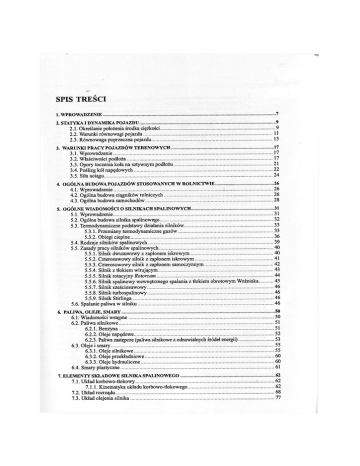 SPIS TREŚCI 1. WPROWADZENIE 7 2. STATYKA I DYNAMIKA POJAZDU 2.1. Określanie położenia środka ciężkości 2.2. Warunki równowagi pojazdu 2.3. Równowaga poprzeczna pojazdu 9 9 11 13 3. WARUNKI PRACY POJAZDÓW TERENOWYCH 3.1. Wprowadzenie 3.2. Właściwości podłoża 3.3. Opory toczenia koła na sztywnym podłożu 3.4. Poślizg kół napędowych 3.5. Siłauciągu 17 17 17 21 22 24 4. OGÓLNA BUDOWA POJAZDÓW STOSOWANYCH W ROLNICTWIE 4.1. Wprowadzenie 4.2. Ogólna budowa ciągników rolniczych 4.3. Ogólna budowa samochodów 26 26 26 28 5. OGÓLNE WIADOMOŚCI O SILNIKACH SPALINOWYCH 5.1. Wprowadzenie 5.2. Ogólna budowa silnika spalinowego 5.3. Termodynamiczne podstawy działania silników. 5.3.1. Przemiany termodynamiczne gazów 5.3.2. Obiegi cieplne 5.4. Rodzaje silników spalinowych 5.5. Zasady pracy silników spalinowych 5.5.1. Silnik dwusuwowy z zapłonem iskrowym 5.5.2. Czterosuwowy silnik z zapłonem iskrowym 5.5.3. Czterosuwowy silnik z zapłonem samoczynnym 5.5.4. Silnik z tłokiem wirującym 5.5.5. Silnik rotacyjny Rotorcam 5.5.6. Silnik spalinowy wewnętrznego spalania z tłokiem obrotowym Woźniaka 5.5.7. Silnik sześciosuwowy 5.5.8. Silnik turbospalinowy 5.5.9. Silnik Stirlinga 5.6. Spalanie paliwa w silniku 31 31 32 33 33 36 39 40 40 41 42 43 44 45 46 46 46 46 6. PALIWA, OLEJE, SMARY 6.1. Wiadomości wstępne 6.2. Paliwa silnikowe 6.2.1. Benzyna 6.2.2. Oleje napędowe 6.2.3. Paliwa zastępcze (paliwa silnikowe z odnawialnych źródeł energii) 6.3. Oleje i smary 6.3.1. Oleje silnikowe 6.3.2. Oleje przekładniowe 6.3.3. Oleje hydrauliczne 6.4. Smary plastyczne 50 50 51 51 52 53 55 55 60 60 61 7. ELEMENTY SKŁADOWE SILNIKA SPALINOWEGO 7.1. Układ korbowo-tłokowy 7.1.1. Kinematyka układu korbowo-tłokowego 7.2. Układ rozrządu 7.3. Układ olejenia silnika 62 62 62 68 77 4 7.3.1. Podstawowe wiadomości o tarciu 7.3.2. Warunki pracy oleju silnikowego 7.3.3. Układ olejenia silnika 7.3.4. Filtry oleju 7.3.5. Obsługa układu smarowania silnika 7.4. Układ dolotowy i wylotowy silnika 7.4.1. Układ dolotowy silnika 7.4.2. Doładowanie silników 7.4.3. Układ wydechowy 7.4.4. Układy redukcji emisji spalin 7.5. Gaźnikowy układ zasilania 7.5.1. Zasada działania gaźnika 7.5.2. Podstawowe zasady obsługi gaźnika 7.6. Układ zasilania silników Diesla 7.6.1. Ogólna budowa 7.6.2. Pompy zasilające 7.6.3. Filtry paliwa 7.6.4. Pompa wtryskowa sekcyjna tłoczkowa 7.6.5. Pompa wtryskowa rozdzielaczowa 7.6.6. Pompowtryskiwacze 7.6.7. Układ Common Raił. 7.6.8. Wtryskiwacze i komory spalania 7.6.9. Regulatory prędkości obrotowej i regulator początku wtrysku paliwa 7.6.10. Podstawowe zasady obsługi wtryskowego układu zasilania 7.7. Układ chłodzenia silnika 7.7.1. Bilans cieplny silnika 7.7.2. Rodzaje układów chłodzenia 7.7.3. Elementy pośredniego układu chłodzenia 7.7.4. Obsługa układu chłodzenia 77 78 79 82 85 87 87 90 98 100 107 107 110 111 112 113 115 116 118 121 122 123 129 133 134 134 135 138 141 8. MECHANIZMY PRZENOSZĄCE NAPĘD 8.1. Ogólna budowa układu przenoszenia napędu 8.2. Sprzęgła główne 8.3. Skrzynie przekładniowe 8.4. Przekładnie stopniowe przełączalne pod obciążeniem (Power Shift) 8.5. Przekładnia nawrotna (Shuttle) 8.6. Przekładnie bezstopniowe - CVT. 8.6. Most napędowy 8.7. Wałek odbioru mocy 8.8. Wały napędowe i przeguby 8.9. Napęd elektryczny (quasi-hybrydowy) 143 143 144 148 151 154 155 161 167 170 173 9. MECHANIZMY NOŚNE I JEZDNE POJAZDÓW. 9.1. Wstęp 9.2. Układ zawieszenia 9.3. Kołowe mechanizmy jezdne 9.4. Gąsienicowy układ jezdny 175 175 176 184 190 10. MECHANIZMY PROWADZENIA POJAZDÓW KOŁOWYCH 10.1. Układ kierowniczy 10.2. Układy hamulcowe 193 193 199 U. URZĄDZENIA ELEKTRYCZNE I ELEKTRONICZNE W POJAZDACH 11.1. Źródła prądu 11.1.1. Akumulator 11.1.2. Prądnice - 209 209 209 211 5 11.2. Urządzenia rozruchowe 11.3. Instalacja zapłonowa 11.3.1. Bateryjny układ zapłonowy 11.3.2. Iskrownikowy układ zapłonowy 11.3.3. Elektroniczne układy zapłonowe 11.4. Instalacja oświetleniowa 11.5. Urządzenia sygnalizacyjne 11.6. Urządzenia elektroniczne 11.6.1. Systemy przesyłania danych w ciągnikach rolniczych (ISO-BUS) 11.6.2. CAN-BUS 11.6.3. Sieć ISO 11.6.4. Systemy określania pozycji pojazdu 11.6.5. Systemy prowadzenia pojazdów 11.6.6. Układy prowadzenia narzędzi 11.6.7. Układy analizy obrazu 212 215 215 220 221 223 225 227 228 229 229 232 235 238 239 12. MECHANIZMY HYDRAULICZNE I ZACZEPOWE 12.1. Podnośnik hydrauliczny. 12.2. Hydrauliczne urządzenia zewnętrzne 12.2.1. Elementy decydujące o wydajności hydrauliki siłowej 12.2.2. Pompy zębate 12.2.3. Pompy tłoczkowe 12.2.4. Układy dwupompowe 12.2.5. Układy otwarte i zamknięte 12.3. Zaczepy 241 241 253 255 255 258 259 260 265 13. NADWOZIA POJAZDÓW I WARUNKI PRACY KIEROWCY 13.1. Nadwozia pojazdów 13.2. Hałas 13.3. Drgania 13.4. Widoczność z kabiny kierowcy. 13.5. Temperatura 268 268 269 271 273 274 14. WLAŚCIOWOŚCI EKSPLOATACYJNE POJAZDÓW ROLNICZYCH 14.1. Charakterystyki silników spalinowych 14.1.1. Charakterystyka prędkościowa 14.1.2. Charakterystyka obciążeniowa 14.1.3. Charakterystyka uniwersalna 14.2. Właściwości jezdne ciągnika 14.3. Badania atestacyjne ciągników rolniczych i leśnych 276 276 276 277 280 282 288 15. OBSŁUGA TECHNICZNA POJAZDÓW. 15.1. Zadania obsługi technicznej 15.2. Obsługa codzienna 15.3. Obsługi okresowe 293 293 293 293 16. PARAMETRY TECHNICZNE CIĄGNIKÓW I PRZYCZEP ROLNICZYCH 298 17. CIĄGNIKI W ROLNICTWIE 17.1. Motoryzacj a rolnictwa 17.2. Potencjał mocy ciągników 17.3. Klasyfikacja ciągników rolniczych 17.4. Zasady doboru ciągników LITERATURA 305 -305 306 307 308 310