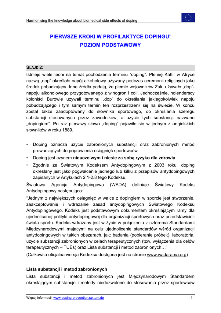 Harmonising the knowledge about biomedical side effects of doping PIERWSZE KROKI W PROFILAKTYCE DOPINGU! POZIOM PODSTAWOWY SLAJD 2: Istnieje wiele teorii na temat pochodzenia terminu “doping”. Plemię Kaffir w Afryce nazwą „dop” określało napój alkoholowy używany podczas ceremonii religijnych jako środek pobudzający. Inne źródła podają, że plemię wojowników Zulu używało „dop”napoju alkoholowego przygotowanego z winogron i coli. Jednocześnie, holenderscy koloniści Burowie używali terminu „dop” do określania jakiegokolwiek napoju pobudzającego i tym samym termin ten rozprzestrzenił się na świecie. W końcu został także zaadoptowany do słownika sportowego, do określania szeregu substancji stosowanych przez zawodników, a użycie tych substancji nazwano „dopingiem”. Po raz pierwszy słowo „doping” pojawiło się w jednym z angielskich słowników w roku 1889. • Doping oznacza użycie zabronionych substancji oraz zabronionych metod prowadzących do poprawienia osiągnięć sportowców • Doping jest czynem nieuczciwym i niesie za sobą ryzyko dla zdrowia • Zgodnie ze Światowym Kodeksem Antydopingowym z 2003 roku, doping określany jest jako pogwałcenie jednego lub kilku z przepisów antydopingowych zapisanych w Artykułach 2.1-2.8 tego Kodeksu. Światowa Agencja Antydopingowa Antydopingowy następująco: (WADA) definiuje Światowy Kodeks “Jednym z największych osiągnięć w walce z dopingiem w sporcie jest stworzenie, zaakceptowanie i wdrażanie zasad antydopingowych Światowego Kodeksu Antydopingowego. Kodeks jest podstawowym dokumentem określającym ramy dla ujednoliconej polityki antydopingowej dla organizacji sportowych oraz przedstawicieli świata sportu. Kodeks wdrażany jest w życie w połączeniu z czterema Standardami Międzynarodowymi mającymi na celu ujednolicenie standardów wśród organizacji antydopingowych w takich obszarach, jak: badania (pobieranie próbek), laboratoria, użycie substancji zabronionych w celach terapeutycznych (tzw. wyłączenia dla celów terapeutycznych – TUEs) oraz Lista substancji i metod zabronionych…” (Całkowita oficjalna wersja Kodeksu dostępna jest na stronie www.wada-ama.org) Lista substancji i metod zabronionych Lista substancji i metod zabronionych jest Międzynarodowym Standardem określającym substancje i metody niedozwolone do stosowania przez sportowców Więcej informacji: www.doping-prevention.sp.tum.de -1- podczas zawodów, poza zawodami, oraz w konkretnych sportach. Po raz pierwszy listę opublikował Międzynarodowy Komitet Olimpijski w 1963 roku. Od 2004 roku odpowiedzialną za przygotowanie i publikację listy jest WADA. Lista jest uaktualniania i publikowana corocznie. Aktualna lista dostępna jest na stronach Światowej Agencji Antydopingowej pod adresem: www.wada-ama.org/en/dynamic.ch2?pageCategory.id=370. SLAJD 3: W starożytności, w czasach Olimpiad Greckich, specjaliści przepisywali sportowcom różne składniki odżywcze w celu polepszenia ich formy fizycznej. Było to uważane za niezbędne, a osoby polecające wówczas takie sposoby mogą być porównane do dzisiejszych lekarzy medycyny sportowej. Ponadto istnieją zapiski informujące o tym, że sportowcy tuż przed zawodami – chcąc poprawić swoją siłę – spożywali różne rodzaje mięsa lub krew. Z czasów starożytnych oraz średniowiecza pochodzą także zapiski o używaniu ziół, grzybów i jąder byka w celach polepszania formy podczas rywalizacji. 1896: Pierwszy zanotowany przypadek śmierci w wyniku zażycia środków dopingujących. Brytyjski kolarz Arthur Linton zmarł w wyniku zażycia strychniny podczas wyścigu Paryż-Bordeaux. 1904: W maratonie olimpijskim w St. Louis, zwycięzca Thomas Hicks tuż po ukończeniu wyścigu dostał zapaści. Lekarze stwierdzili, że było to spowodowane zażyciem strychniny i koniaku przed wyścigiem. Zawodnik prawie zmarł w wyniku zastosowania mieszanki alkoholu ze środkiem pobudzającym. 1939-1945 Jest powszechnie wiadome, że lotnicy podczas II Wojny Światowej zażywali stymulanty. SLAJD 4: 1960: W latach sześćdziesiątych rozpoczął się dramatyczny wzrost stosowania anabolików przez sportowców. Wierzono wówczas, że są to substancje pomagające w osiągnięciu niemal wszystkiego. 1980: Wraz z rozwojem farmacji na rynku zaczęły być dostępne złożone substancje endogenne, wspomagające siłę i wytrzymałość. Wśród nich hormon erytropoetyna (EPO), który pobudza formowanie się czerwonych krwinek. Hormon ten stał się „popularny” w sportach wytrzymałościowych. Więcej informacji: www.doping-prevention.com -2- 2003: odkrycie steroidu anabolicznego tetrahydrogestrinonu (THG). Informacje o tym środku pojawiły się publicznie po tym jak anonimowy trener lekkiej atletyki podrzucił strzykawkę z tą substancją do biura Amerykańskiej Agencji Antydopingowej (USADA). 2007: wiele skandali i spekulacji dotyczących dopingu wśród kolarzy uczestniczących w Tour de France (doping krwią, EPO itp.) SLAJD 5: Pierwsze kroki w walce z dopingiem zostały podjęte w roku 1960, gdy Rada Europy zaprezentowała rozwiązania prawne przeciwko używaniu dopingu w sporcie. Wydaje się wręcz, że pierwsze przypadki śmiertelne były konieczne, by władze zajęły się w końcu tym problemem. Pierwsze prawo antydopingowe pojawiło się we Francji w 1963 roku, następnie w Belgi w 1965. W 1967 Międzynarodowy Komitet Olimpijski (MKOl) ustanowił odrębną Komisję Medyczną. 1968: w 1968 roku wprowadzono testy antydopingowe podczas igrzysk olimpijskich w Grenoble i w Meksyku. MKOl ustanowił listę niedozwolonych substancji i metod, mimo że sprzęt techniczny oraz procedury testowania wciąż nie były adekwatne do potrzeb. 1988: w Niemczech wprowadzono testy poza zawodami 1999: w związku z kolejnym wielkim skandalem podczas Tour de France w 1998 roku, MKOl zwołał Światową Konferencję na temat Dopingu w Sporcie (Lozanna, 1999). Głó
