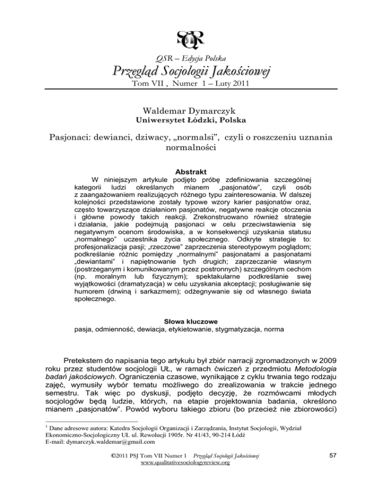QSR – Edycja Polska Przegląd Socjologii Jakościowej Tom VII , Numer 1 – Luty 2011 Waldemar Dymarczyk1 Uniwersytet Łódzki, Polska Pasjonaci: dewianci, dziwacy, „normalsi”, czyli o roszczeniu uznania normalności Abstrakt W niniejszym artykule podjęto próbę zdefiniowania szczególnej kategorii ludzi określanych mianem „pasjonatów”, czyli osób z zaangażowaniem realizujących różnego typu zainteresowania. W dalszej kolejności przedstawione zostały typowe wzory karier pasjonatów oraz, często towarzyszące działaniom pasjonatów, negatywne reakcje otoczenia i główne powody takich reakcji. Zrekonstruowano również strategie i działania, jakie podejmują pasjonaci w celu przeciwstawienia się negatywnym ocenom środowiska, a w konsekwencji uzyskania statusu „normalnego” uczestnika życia społecznego. Odkryte strategie to: profesjonalizacja pasji; „rzeczowe” zaprzeczenia stereotypowym poglądom; podkreślanie różnic pomiędzy „normalnymi” pasjonatami a pasjonatami „dewiantami” i napiętnowanie tych drugich; zaprzeczanie własnym (postrzeganym i komunikowanym przez postronnych) szczególnym cechom (np. moralnym lub fizycznym); spektakularne podkreślanie swej wyjątkowości (dramatyzacja) w celu uzyskania akceptacji; posługiwanie się humorem (drwiną i sarkazmem); odżegnywanie się od własnego świata społecznego. Słowa kluczowe pasja, odmienność, dewiacja, etykietowanie, stygmatyzacja, norma Pretekstem do napisania tego artykułu był zbiór narracji zgromadzonych w 2009 roku przez studentów socjologii UŁ, w ramach ćwiczeń z przedmiotu Metodologia badań jakościowych. Ograniczenia czasowe, wynikające z cyklu trwania tego rodzaju zajęć, wymusiły wybór tematu możliwego do zrealizowania w trakcie jednego semestru. Tak więc po dyskusji, podjęto decyzję, że rozmówcami młodych socjologów będą ludzie, których, na etapie projektowania badania, określono mianem „pasjonatów”. Powód wyboru takiego zbioru (bo przecież nie zbiorowości) 1 Dane adresowe autora: Katedra Socjologii Organizacji i Zarządzania, Instytut Socjologii, Wydział Ekonomiczno-Socjologiczny UŁ ul. Rewolucji 1905r. Nr 41/43, 90-214 Łódź E-mail: [email protected] ©2011 PSJ Tom VII Numer 1 Przegląd Socjologii Jakościowej www.qualitativesociologyreview.org 57 był nader prozaiczny - względna łatwość znalezienia osób, które chętnie opowiedzą o swoich zainteresowaniach. Niebawem okazało się, że obszar badań, wyłoniony na podstawie przesłanek stricte oportunistycznych (z punktu widzenia prowadzącego zajęcia), potrafi być oryginalny i atrakcyjny poznawczo. Pierwotnie celem badania było opracowanie definicji fenomenu określanego mianem „człowieka z pasją”. Po wtóre, zebrany materiał miał umożliwić zrekonstruowanie typowych trajektorii karier pasjonatów. Jednakże, bardzo szybko, zaczął wyłaniać się jeszcze inny wątek, który w znaczący sposób wpłynął na treść niniejszego artykułu. Mianowicie problem przystawalności do oczekiwań i akceptacji działań i postaw pasjonatów przez innych, często bliskich towarzyszy ich życia; rodzinę, przyjaciół i znajomych. Okazało się, że krytyczna ocena, ze strony środowiska, nierzadko spotyka się z bardzo charakterystycznymi reakcjami naszych rozmówców. Chodzi tu zazwyczaj o działania, którą określiliśmy jako „roszczenie uznania normalności” tychże działań. Dane Analizowany materiał to trzydzieści sześć wywiadów. We wstępnej fazie badania realizowane były wywiady narracyjne, natomiast w kolejnych etapach, gdy wiedza na temat zjawiska pozwalała na formułowanie konkretnych pytań, wywiady swobodne. Rozmówcami były osoby w różnym wieku (od 17 do ponad 60 lat) i z różnym „stażem” realizowania własnej pasji. O swoich zainteresowaniach opowiadali: strażacy, wędkarze, muzealnik-kronikarz-pszczelarz, trenerzy karate, muzycy, piosenkarz, podróżnicy, free-runner, wspinacz, turysta-muzyk, rowerzystamuzyk, rowerzysta (pasjonat bicykli), myśliwy, kolekcjonerzy płyt winylowych, tancerze, miłośnicy motoryzacji, architekt, tancerka-siatkarka, fotograficy, jeźdźcy konni, „replikant” uzbrojenia, pokerzysta, gracz internetowy, działkowiec-konstruktor mebli, radiowiec, modelarz, przewodnik górski, kolekcjoner etykiet wyrobów alkoholowych, tancerka-modelka, aktor teatru ognia. Oprócz transkrypcji wypowiedzi i narracji, analizowane były materiały ikonograficzne. Niektórzy rozmówcy dostarczyli bowiem zdjęcia ilustrujące ich zainteresowania. We wszystkich przypadkach (narracje, opowieści i zdjęcia) zastosowano procedury metodologii teorii ugruntowanej (MTU) (Glaser, Strauss 1967; Glaser 1978; Strauss 1987; Strauss, Corbin 1998; Konecki 2000; Gorzko 2008). Definicja fenomenu Na etapie przygotowywania badania przyjęto robocze założenie, że niemal każdy, zwłaszcza młody człowiek, ma znajomych, którzy, dzięki specyfice i/lub intensywności realizowanych działań, wyróżniają się z otoczenia. To założenie jest jednocześnie częścią prowizorycznej definicji „osoby z pasją”. Stajemy tu bowiem przed istotną kwestią: jak zdefiniować „pasjonata”? Czy jest to właśnie problem intensywności i trwałości realizacji własnych zainteresowań, czy też wystarczy by były to wyjątkowe, na tle środowiska, zainteresowania? Czy siła zaangażowania pasjonata musi oznaczać koszty emocjonalne i społeczne oraz towarzyszące temu strategie przystosowawcze i obronne, czy też mianem pasjonata można określić osobę realizującą swoje hobby w wolnych chwilach? Odpowiedzi na tego typu ©2011 PSJ Tom VII Numer 1 Przegląd Socjologii Jakościowej www.qualitativesociologyreview.org 58 pytania opierają się zazwyczaj na naszym własnym doświadczeniu w kontaktach z innymi. Intuicje te są ważnym składnikiem wiedzy o świecie, a co więcej, są też, zazwyczaj dość dobrym, sposobem nadawania porządku uniwersum.