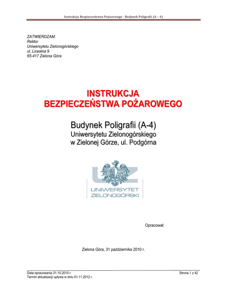 Instrukcja Bezpieczeństwa Pożarowego - Budynek Poligrafii (A – 4) ZATWIERDZAM: Rektor Uniwersytetu Zielonogórskiego ul. Licealna 9 65-417 Zielona Góra INSTRUKCJA BEZPIECZEŃSTWA POŻAROWEGO Budynek Poligrafii (A-4) Uniwersytetu Zielonogórskiego w Zielonej Górze, ul. Podgórna Opracował: Zielona Góra, 31 października 2010 r. Data opracowania 31.10.2010 r. Termin aktualizacji upływa w dniu 01.11.2012 r. Strona 1 z 42 Instrukcja Bezpieczeństwa Pożarowego - Budynek Poligrafii (A – 4) I. PRZEDMIOT I ZAKRES OPRACOWANIA. 4 II. CHARAKTERYSTYKA OBIEKTU. 5 1. Usytuowanie obiektu z uwagi na bezpieczeństwo pożarowe, oraz możliwość dojazdu pożarowego i poboru wody do zewnętrznego gaszenia pożaru. 5 2. Charakterystyka techniczno-budowlana budynku. 5 2.1 Powierzchnia, wysokość i liczba kondygnacji; 5 2.2 Odległość od obiektów sąsiadujących; 5 2.3 Parametry pożarowe występujących substancji palnych; 6 2.4 Przewidywana gęstość obciążenia ogniowego; 6 2.5 Kategoria zagrożenia ludzi, przewidywana liczba osób na każdej kondygnacji i w pomieszczeniach, w których przebywać mogą jednocześnie większe grupy ludzi; 7 2.6 Ocena zagrożenia wybuchem pomieszczeń oraz przestrzeni zewnętrznych; 7 2.7 Klasa odporności pożarowej budynku oraz klasa odporności ogniowej i stopień rozprzestrzeniania ognia przez elementy budowlane; 7 2.8 Podział obiektu na strefy pożarowe; 8 III. CHARAKTERYSTYCZNE, POTENCJALNE ŹRÓDŁA POWSTANIA POŻARU, DROGI JEGO ROZPRZESTRZENIANIA ORAZ ZASADY ZAPOBIEGANIA POWSTANIA POŻARU. 9 1. Charakterystyka zagrożeń. 9 2. Potencjalnie (najczęstsze) przyczyny powstania pożaru: 9 3. Czynniki wpływające na rozprzestrzenianie się pożaru. 10 4. Charakterystyka rozwoju pożaru w budynku. 11 5. Obowiązki Zarządcy obiektu w zakresie ochrony przeciwpożarowej 14 6. Obowiązki pracowników i innych stałych użytkowników budynku w zakresie ochrony przeciwpożarowej. 15 7. Obowiązki pracowników wyznaczonych do udzielania pierwszej pomocy, wykonywania działań w zakresie zwalczania pożarów i ewakuacji pracowników. 18 8. Wskazania przeciwpożarowe. 16 18 IV. WYMAGANIA DOTYCZĄCE INSTALACJI UŻYTKOWYCH. 1. Instalacja elektryczna: 18 2. Instalacja odgromowa (piorunochronna): 18 3. Przewody kominowe (wentylacji grawitacyjnej i spalinowe): 18 4. Instalacja wodociągowa, kanalizacyjna i ogrzewcza: 18 V. ZASADY ZABEZPIECZENIA PRAC NIEBEZPIECZNYCH POD WZGLĘDEM POŻAROWYM. 20 VI. ZASADY ROZMIESZCZANIA I EKSPLOATACJI GAŚNIC PRZENOŚNYCH. 23 VII. SPOSOBY PODDAWANIA PRZEGLĄDOM TECHNICZNYM I CZYNNOŚCIOM KONSERWACYJNYM STOSOWANYCH URZĄDZEŃ PRZECIWPOŻAROWYCH I GAŚNIC. 26 Gaśnice 26 Hydranty wewnętrzne 27 Data opracowania 31.10.2010 r. Termin aktualizacji upływa w dniu 01.11.2012 r. Strona 2 z 42 Instrukcja Bezpieczeństwa Pożarowego - Budynek Poligrafii (A – 4) 29 VIII. ORGANIZACJA I WARUNKI EWAKUACJI. 1. Zapewnienie właściwych warunków ewakuacji (w zakresie technicznobudowlanym) w budynku polega w szczególności na: 29 2. Środki i sposoby ogłaszania alarmu o niebezpieczeństwie. 30 3. Siły do przeprowadzenia ewakuacji. 30 4. Środki do przeprowadzenia ewakuacji. 31 5. Zasady postępowania podczas ewakuacji. 31 6. Sposób przeprowadzenia ewakuacji. 31 7. Oświetlenie ewakuacyjne i znaki bezpieczeństwa. 32 8. Praktyczne sprawdzenie organizacji i warunków ewakuacji. 33 34 IX. ZASADY POSTĘPOWANIA NA WYPADEK POWSTANIA POŻARU. 1. Zasady alarmowania w przypadku powstania pożaru. 34 2. Zasady postępowania pracowników i innych stałych użytkowników budynku w przypadku powstania pożaru, do czasu przybycia jednostek ratowniczo-gaśniczych oraz współdziałania z kierującym akcją ratowniczą: 34 X. ORGANIZACJA I ZASADY ZAZNAJAMIANIA PRACOWNIKÓW I INNYCH STAŁYCH UŻYTKOWNIKÓW BUDYNKU Z PRZEPISAMI PRZECIWPOŻAROWYMI ORAZ TREŚCIĄ NINIEJSZEJ INSTRUKCJI . 38 1. Cele szkolenia przeciwpożarowego i ratowniczego. 38 2. Organizacja szkolenia przeciwpożarowego dotyczy. 38 3. Zakres szkolenia przeciwpożarowego. 38 4. Sposoby zaznajamiania pracowników oraz stałych użytkowników budynku z treścią niniejszej instrukcji. 39 5. Szkolenie osób nie będących pracownikami lub stałymi użytkownikami budynku. 39 XI. WYKAZ DOKUMENTÓW DOTYCZĄCY OCHRONY PRZECIWPOZAROWEJ I MIEJSCE ICH PRZECHOWYWANIA. 40 XII. POSTANOWIENIA KOŃCOWE. 41 1. Aktualizacja 41 2. Zakres stosowania 41 3. Obowiązek opracowania 41 Data opracowania 31.10.2010 r. Termin aktualizacji upływa w dniu 01.11.2012 r. Strona 3 z 42 Instrukcja Bezpieczeństwa Pożarowego - Budynek Poligrafii (A – 4) I. PRZEDMIOT I ZAKRES OPRACOWANIA. Przedmiotem opracowania jest Instrukcja Bezpieczeństwa Pożarowego, zawierająca ogólne i szczegółowe wymagania przeciwpożarowe dla Budynku Poligrafii (A-4) Uniwersytetu Zielonogórskiego w Zielonej Górze, ul. Podgórna. Podstawa opracowania: § 6 rozporządzenia Ministra Spraw Wewnętrznych i Administracji z dnia 21 kwietnia 2006 r. w sprawie ochrony przeciwpożarowej budynków, innych obiektów budowlanych i terenów (Dz. U. Nr 80, poz. 563). Zakresem opracowania objęto: 1) warunki ochrony przeciwpożarowej, wynikające z przeznaczenia obiektu, sposobu użytkowania, prowadzonego procesu technologicznego, magazynowania (składowania) i warunków technicznych obiektu, w tym zagrożenia wybuchem; 2) wyposażenie w urządzenia przeciwpożarowe i gaśnice oraz sposoby poddawania przeglądom technicznym i czynnościom konserwacyjnym stosowanych w obiekcie urządzeń przeciwpożarowych i gaśnic; 3) sposoby postępowania na wypadek pożaru i innego zagrożenia; 4) sposoby zabezpieczenia prac niebezpiecznych pod względem pożarowym, jeżeli takie prace są przewidywane; 5) warunki i organizację ewakuacji ludzi oraz praktyczne sposoby ich sprawdzania; 6) sposoby zapoznania użytkowników obiektu, w tym zatrudnionych pracowników, z treścią przedmiotowej instrukcji oraz z przepisami przeciwpożarowymi; 7) plany obiektu obejmujące: a) warunk