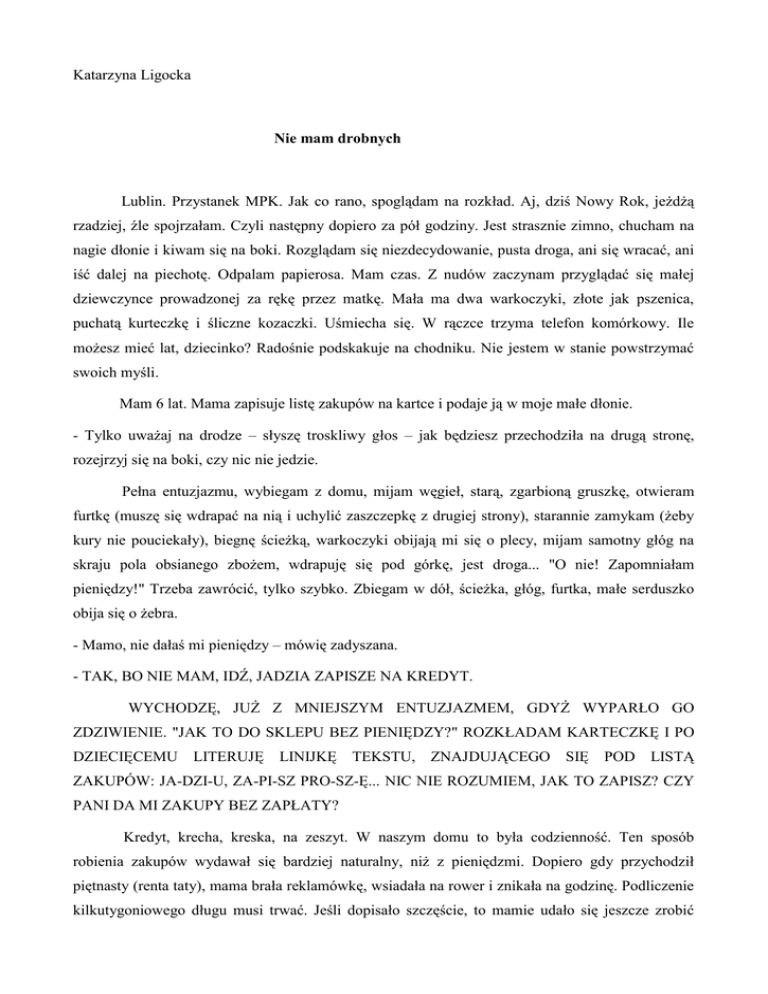 Katarzyna Ligocka Nie mam drobnych Lublin. Przystanek MPK. Jak co rano, spoglądam na rozkład. Aj, dziś Nowy Rok, jeżdżą rzadziej, źle spojrzałam. Czyli następny dopiero za pół godziny. Jest strasznie zimno, chucham na nagie dłonie i kiwam się na boki. Rozglądam się niezdecydowanie, pusta droga, ani się wracać, ani iść dalej na piechotę. Odpalam papierosa. Mam czas. Z nudów zaczynam przyglądać się małej dziewczynce prowadzonej za rękę przez matkę. Mała ma dwa warkoczyki, złote jak pszenica, puchatą kurteczkę i śliczne kozaczki. Uśmiecha się. W rączce trzyma telefon komórkowy. Ile możesz mieć lat, dziecinko? Radośnie podskakuje na chodniku. Nie jestem w stanie powstrzymać swoich myśli. Mam 6 lat. Mama zapisuje listę zakupów na kartce i podaje ją w moje małe dłonie. - Tylko uważaj na drodze – słyszę troskliwy głos – jak będziesz przechodziła na drugą stronę, rozejrzyj się na boki, czy nic nie jedzie. Pełna entuzjazmu, wybiegam z domu, mijam węgieł, starą, zgarbioną gruszkę, otwieram furtkę (muszę się wdrapać na nią i uchylić zaszczepkę z drugiej strony), starannie zamykam (żeby kury nie pouciekały), biegnę ścieżką, warkoczyki obijają mi się o plecy, mijam samotny głóg na skraju pola obsianego zbożem, wdrapuję się pod górkę, jest droga... "O nie! Zapomniałam pieniędzy!" Trzeba zawrócić, tylko szybko. Zbiegam w dół, ścieżka, głóg, furtka, małe serduszko obija się o żebra. - Mamo, nie dałaś mi pieniędzy – mówię zadyszana. - TAK, BO NIE MAM, IDŹ, JADZIA ZAPISZE NA KREDYT. WYCHODZĘ, JUŻ Z MNIEJSZYM ENTUZJAZMEM, GDYŻ WYPARŁO GO ZDZIWIENIE. "JAK TO DO SKLEPU BEZ PIENIĘDZY?" ROZKŁADAM KARTECZKĘ I PO DZIECIĘCEMU LITERUJĘ LINIJKĘ TEKSTU, ZNAJDUJĄCEGO SIĘ POD LISTĄ ZAKUPÓW: JA-DZI-U, ZA-PI-SZ PRO-SZ-Ę... NIC NIE ROZUMIEM, JAK TO ZAPISZ? CZY PANI DA MI ZAKUPY BEZ ZAPŁATY? Kredyt, krecha, kreska, na zeszyt. W naszym domu to była codzienność. Ten sposób robienia zakupów wydawał się bardziej naturalny, niż z pieniędzmi. Dopiero gdy przychodził piętnasty (renta taty), mama brała reklamówkę, wsiadała na rower i znikała na godzinę. Podliczenie kilkutygoniowego długu musi trwać. Jeśli dopisało szczęście, to mamie udało się jeszcze zrobić bieżące zakupy, płacąc. Wówczas pojawiała się w domu jakaś wędlina albo nawet i żółty ser. Zawsze czegoś brakowało, to masła, to oleju, ale trzeba przyznać, że mama zawsze kupowała też dla nas coś dobrego. Podzielnego oczywiście, bo było nas siedmioro – na przykład Flipsy albo pomarańczę. Bywało i tak, że 7 lizaków-serduszek. Zielone lubiłam najbardziej. Papieros dogasł, parząc mnie w palce. Tsss, odrzucam peta i dmucham na pęcherzyk. Niech to szlag! A jednak przez kilka sekund ogrzał mi skórę. Spoglądam na zegarek. Trolejbus będzie za 20 minut. Wtem kącikiem oka zauważam coś czerwonego. To witryna sklepu kosmetycznego. Ozdobiona światełkami, Mikołajem i tym cholernym reniferem Rudolfem. Dzięki Bogu, już po świętach... Zapatrzam się na migocące iskierki lampek. Wspominam, krzywiąc się do wspomnień, moją pierwszą... no... nie pracę, a próbę samodzielnego zdobycia pieniędzy. Święta. Nie pamiętam, ile miałam wtedy lat... Ale jak dziś jawi mi się obraz sprzed kilkunastu zim. Ja – przebrana za świętego Józefa, a Justyna za aniołka. Zimno, mróz... i te dwie nieszczęsne dziewczynki, pokonujące zaspy, jedna z brodą z włóczki, druga z papierowymi skrzydłami. W jednym z domów przywitano nas gromkim śmiechem. Żartowali, że jakoby ja to Osama bin Laden, wówczas temat numer jeden, a Justyna niefortunnie zaczepiła wtedy o klamkę skrzydłem i porwało się na strzępy. Dla nas klęska, niepowodzenie, śmieją się, zamiast słuchać przygotowanych przez nas kolęd. Dramat, bo strój do wyrzucenia. A na dworze ten śnieg tak skrzył! Czyżby z zimna pociekły mi wtedy łzy, zabarwiające świat na perłowo? Ten zachwyt, gdy ktoś rzucił 5 zł, ta gorycz, gdy tylko poczęstowano ciastkiem, to upokorzenie, gdy nie wpuścili za próg: ''Gospodarzu, czy możemy kolędować?'', drzwi kłap przed czerwonym nosem... Ha, więc to właśnie przez kolędowanie w dzieciństwie tak bardzo nienawidzę świąt Bożego Narodzenia. Przepych choinek, okna ozdobione sztucznym śniegiem i światełkami, śnieżnobiały obrus, stół uginający się pod ciężarem (z pewnością więcej niż dwunastu) potraw, radość, ciepło rodzinne, w radiu kolędy – w każdym domu, tylko nie w moim. I wchodziło się w ten cudzy rodzinny krąg, z tym zawstydzeniem, zasmarkanym nosem, brakiem rękawiczek na czerwonych od mrozu dłoniach. W tym obcym cieple zakłócało się przez kilka chwil uroczysty nastrój cichym i nieśmiałym: ''...bo uboga była, rąbek z głowy zdjęła''. Czym do cholery jest rąbek? - myślałam śpiewając. Zatopiona we wspomnieniach, nie zauważam, kiedy stanął przede mną. -Przeprrrraszam paaaanią najuprzeeeejmiej, czy ma paaaani może 50gr. Cholera, jak ja ich nienawidzę! Jest ósma rano, a on już nawalony. Gdybyś ty, stary obdartusie, wiedział, co ja muszę znosić, by zarobić te 50 gr. - Nie mam drobnych – odpowiadam odruchowo. I wspomnienie uderza mnie w tył głowy jak seria z karabinu maszynowego. PIERWSZY ROK STUDIÓW. GŁÓD PORAZ KOLEJNY ZAJRZAŁ MI W OCZY (MARYŚ, ZNOWU SCHUDŁAŚ, JAK TY TO ROBISZ!). MUSZĘ ZNALEŹĆ PRACĘ! ROZSYŁANE CV NIE DAŁO ŻADNEGO SKUTKU... BO I JAKI MIAŁA DAĆ SKUTEK NIEMAL PUSTA KARTKA? Z DRAŻNIĄCYM PRACODAWCÓW WYZNANIEM: STUDENTKA STUDIÓW STACJONARNYCH, BEZ PRAWA JAZDY, ZAMELDOWANIE TYMCZASOWE, BEZ DOŚWIADCZENIA ZAWODOWEGO. Z CZYM DO LUDZI?! PODCZAS JEDNEGO Z WIECZORNYCH SPACERÓW ZAUWAŻAM KARTKĘ NA SŁUPIE: "POSZUKIWANA POMOC DOMOWA". DZWONIĘ. PRZYJĘLI MNIE. Ich dom już od progu, co ja mówię, już od wycieraczki, onieśmielił mnie wielkością, przepychem i pięknem. Tam nawet powietrze jest in
