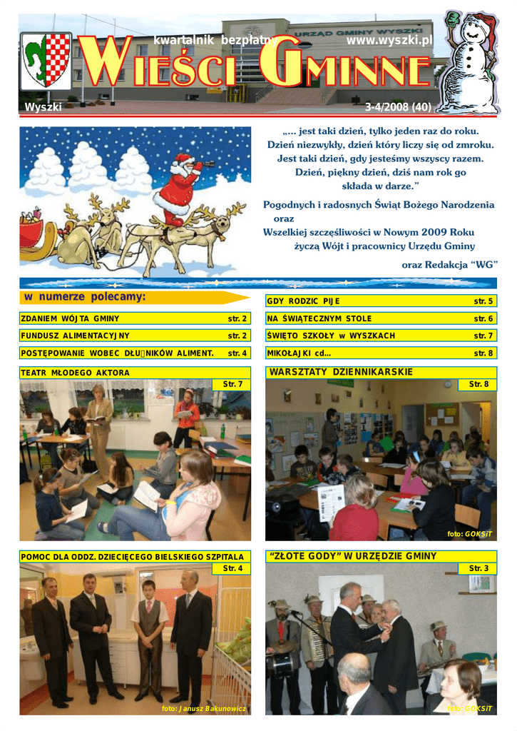 WIEŚCI GMINNE kwartalnik bezpłatny Wyszki www.wyszki.pl 3-4/2008 (40) „... jest taki dzień, tylko jeden raz do roku. Dzień niezwykły, dzień który liczy się od zmroku. Jest taki dzień, gdy jesteśmy wszyscy razem. Dzień, piękny dzień, dziś nam rok go składa w darze.” Pogodnych i radosnych Świąt Bożego Narodzenia oraz Wszelkiej szczęśliwości w Nowym 2009 Roku życzą Wójt i pracownicy Urzędu Gminy oraz Redakcja “WG” w numerze polecamy: GDY RODZIC PIJE str. 5 ZDANIEM WÓJTA GMINY str. 2 NA ŚWIĄTECZNYM STOLE str. 6 FUNDUSZ ALIMENTACYJNY str. 2 ŚWIĘTO SZKOŁY w WYSZKACH str. 7 POSTĘPOWANIE WOBEC DŁUŻNIKÓW ALIMENT. str. 4 MIKOŁAJKI cd... str. 8 WARSZTATY DZIENNIKARSKIE TEATR MŁODEGO AKTORA Str. 8 Str. 7 foto: GOKSiT POMOC DLA ODDZ. DZIECIĘCEGO BIELSKIEGO SZPITALA Str. 4 foto: Janusz Bakunowicz “ZŁOTE GODY” W URZĘDZIE GMINY Str. 3 foto: GOKSiT ZDANIEM WÓJTA GMINY. Dlaczego jest tyle nienawiści? Medialne ataki na ludzi głównie ze sfer politycznych, ale nie tylko, stały się ostatnio prawie normą. Dziennikarze prześcigają się w demaskowaniu różnych czasami mało istotnych ze społecznego punktu widzenia, wpadek polityków i innych ludzi życia publicznego. Niejednokrotnie temat zostaje rozdmuchany do rozmiarów nijak mających się do faktycznej winy. Media powinny dostarczać rzetelnej bezstronnej informacji. Powinny ujawniać wszelkie zauważone nieprawidłowości we wszystkich dziedzinach życia publicznego. Powinny jednak też ponosić odpowiedzialność za swoją działalność. Każda afera, zdarzenie, informacja przed nadaniem jej rozgłosu powinna być bardzo solidnie sprawdzona. Nie może być tak, że po zniszczeniu publicznym człowieka, po roku albo i jeszcze później na którejś stronie gazety ukaże się drobnym drukiem sprostowanie. Podobny problem dotyczy również służb powołanych do ścigania przestępstw. Szczególnie było to widoczne w poprzedniej ekipie rządzącej. Cd na str. 3 NOWY WÓZ w NIEWINIE BOROWYM. TELEFON ZAUFANIA DLA DZIECI I MŁODZIEŻY Opracowała: Marzanna Olszewska Masz problem? Zadzwoń 116 111 Fundacja Dzieci Niczyje uruchomiła Telefon Zaufania Dla Dzieci i Młodzieży 116 111. Z tego specjalnego numeru telefonu mogą skorzystać dzieci oraz młodzi ludzie, którzy znajdują się w trudnych sytuacjach i potrzebują wsparcia i ochrony. Mogą oni liczyć na profesjonalną poradę, pomoc i interwencję w sytuacjach kryzysowych. Obsługujący telefon psycholodzy i pedagodzy współpracują z ogólnopolską siecią instytucji i organizacji z doświadczeniem w pracy z osobami w trudnych sytuacjach życiowych i potrzebującymi pomocy. Telefon Zaufania Dla Dzieci i Młodzieży 116 111 należy do grupy ogólnoeuropejskich bezpłatnych linii telefonicznych. Dzieci i młodzież mogą bezpłatnie i anonimowo porozmawiać o swoich problemach. Ponadto uruchomiona została strona internetowa www.116111.pl, gdzie można zadawać pytania konsultantom, rozmawiać na forum z rówieśnikami oraz skorzystać ze "Strefy wiedzy". (Opracowano na podstawie komunikatu Fundacji “Dzieci Niczyje”) NASZE DROGI Przybyły kolejne odcinki dróg. W bieżącym roku mimo braku pieniędzy unijnych udało się ze środków własnych wybudować kilka odcinków dróg gminnych będących w najgorszym stanie. Przebudowane zostały drogi: Mierzwin Mały - Olszewo dł.0,6 km. Górskie - Bogusze dł.1,6 km. Stacewicze - Warpechy Nowe dł. 1,0km. Ponadto wspólnie z powiatem wybudowany został odcinek drogi Strabla Samułki Duże długości 3,2km. Łącznie przybyło w tym roku prawie 6,5 km. dróg asfaltowych. W roku 2009 planowane jest wybudowanie kolejnych ok. 10 km. W miesiącu październiku 2008r. OSP Niewino Borowe otrzymało nowy samochód pożarniczy lekki. Zakup został sfinansowany ze środków Wojewódzkiego Funduszu Ochrony Środowiska i Gospodarki Wodnej oraz własnych Gminy Wyszki. Jest to wóz z dużymi możliwościami bojowymi. Posiada zbiornik na wodę o pojemności 1000 l., szybkie natarcie oraz kabinę dla 9 strażaków. Zastąpi on dotychczasowego, wysłużonego Żuka. (Na zdjęciu podczas odbioru wozu zakupionego w firmie PROMETEUSZ, od lewej: Naczelnik OSP Niewino B. Edward Niewiński, kierowca Norbert Malinowski, Wójt Ryszard Perkowski, właściciel firmy PROMETEUSZ Bogdan Utrata, Sekretarz Zarządu Gminnego OSP Andrzej Niewiński) FUNDUSZ ALIMENTACYJNY Osobą uprawnioną do świadczeń z FA jest dziecko, które ma zasądzone od rodzica alimenty, a ich egzekucja jest bezskuteczna. Świadczenia przysługują na dziecko: - do ukończenia 18 roku życia, -do ukończenia 25 lat pod warunkiem, że uczy się w szkole lub w szkole wyższej, -bez względu na wiek, jeżeli posiada orzeczenie o znacznym stopniu niepełnosprawności. Egzekucja jest bezskuteczna, jeżeli w okresie 2 miesięcy przed złożeniem wniosku o świadczenie z FA komornik nie wyegzekwował pełnej należności z tytułu zaległych i bieżących alimentów. Bezskuteczność egzekucji komornik potwierdza odpowiednim zaświadczeniem, które może uzyskać sama osoba zainteresowana lub organ właściwy wierzyciela. Organ właściwy wierzyciela - urząd gminy lub ośrodek pomocy społecznej, w którym osoba ubiega się o świadczenia z FA. Prawo do świadczenia z FA przysługuje, jeżeli przeciętny miesięczny dochód netto na osobę w rodzinie w roku poprzedzającym okres świadczeniowy nie przekracza 725 zł. Ustalając prawo do świadczeń na str. 2 Budowa drogi Górskie - Bogusze okres od 1 października 2008r. do 30 września 2009r. bierze się pod uwagę dochód uzyskany przez członków rodziny w 2007r. W przypadku, gdy rodzina posiada gospodarstwo rolne, dochód oblicza się na podstawie liczby hektarów przeliczeniowych znajdujących się w jej posiadaniu w roku kalendarzowym poprzedzającym okres zasiłkowy Miesięczna wartość dochodu z 1 ha przeliczeniowego została określona na poziomie 1/12 dochodu ogłaszanego corocznie w drodze obwiesz