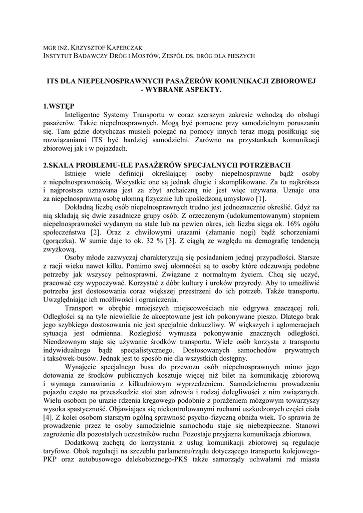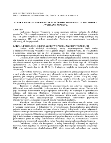 MGR INŻ. KRZYSZTOF KAPERCZAK INSTYTUT BADAWCZY DRÓG I MOSTÓW, ZESPÓŁ DS. DRÓG DLA PIESZYCH ITS DLA NIEPEŁNOSPRAWNYCH PASAŻERÓW KOMUNIKACJI ZBIOROWEJ - WYBRANE ASPEKTY. 1.WSTĘP Inteligentne Systemy Transportu w coraz szerszym zakresie wchodzą do obsługi pasażerów. Także niepełnosprawnych. Mogą być pomocne przy samodzielnym poruszaniu się. Tam gdzie dotychczas musieli polegać na pomocy innych teraz mogą posiłkując się rozwiązaniami ITS być bardziej samodzielni. Zarówno na przystankach komunikacji zbiorowej jak i w pojazdach. 2.SKALA PROBLEMU-ILE PASAŻERÓW SPECJALNYCH POTRZEBACH Istnieje wiele definicji określającej osoby niepełnosprawne bądź osoby z niepełnosprawnością. Wszystkie one są jednak długie i skomplikowane. Za to najkrótsza i najprostsza uznawana jest za zbyt archaiczną nie jest więc używana. Uznaje ona za niepełnosprawną osobę ułomną fizycznie lub upośledzoną umysłowo [1]. Dokładną liczbę osób niepełnosprawnych trudno jest jednoznacznie określić. Gdyż na nią składają się dwie zasadnicze grupy osób. Z orzeczonym (udokumentowanym) stopniem niepełnosprawności wydanym na stałe lub na pewien okres, ich liczba sięga ok. 16% ogółu społeczeństwa [2]. Oraz z chwilowymi urazami (złamanie nogi) bądź schorzeniami (gorączka). W sumie daje to ok. 32 % [3]. Z ciągłą ze względu na demografię tendencją zwyżkową. Osoby młode zazwyczaj charakteryzują się posiadaniem jednej przypadłości. Starsze z racji wieku nawet kilku. Pomimo swej ułomności są to osoby które odczuwają podobne potrzeby jak wszyscy pełnosprawni. Związane z normalnym życiem. Chcą się uczyć, pracować czy wypoczywać. Korzystać z dóbr kultury i uroków przyrody. Aby to umożliwić potrzeba jest dostosowania coraz większej przestrzeni do ich potrzeb. Także transportu. Uwzględniając ich możliwości i ograniczenia. Transport w obrębie mniejszych miejscowościach nie odgrywa znaczącej roli. Odległości są na tyle niewielkie że akceptowane jest ich pokonywane pieszo. Dlatego brak jego szybkiego dostosowania nie jest specjalnie dokuczliwy. W większych i aglomeracjach sytuacja jest odmienna. Rozległość wymusza pokonywanie znacznych odległości. Nieodzownym staje się używanie środków transportu. Wiele osób korzysta z transportu indywidualnego bądź specjalistycznego. Dostosowanych samochodów prywatnych i taksówek-busów. Jednak jest to sposób nie dla wszystkich dostępny. Wynajęcie specjalnego busa do przewozu osób niepełnosprawnych mimo jego dotowania ze środków publicznych kosztuje więcej niż bilet na komunikację zbiorową i wymaga zamawiania z kilkudniowym wyprzedzeniem. Samodzielnemu prowadzeniu pojazdu często na przeszkodzie stoi stan zdrowia i rodzaj dolegliwości z nim związanych. Wielu osobom po urazie rdzenia kręgowego podobnie z porażeniem mózgowym towarzyszy wysoka spastyczność. Objawiająca się niekontrolowanymi ruchami uszkodzonych części ciała [4]. Z kolei osobom starszym ogólną sprawność psycho-fizyczną obniża wiek. To sprawia że prowadzenie przez te osoby samodzielnie samochodu staje się niebezpieczne. Stanowi zagrożenie dla pozostałych uczestników ruchu. Pozostaje przyjazna komunikacja zbiorowa. Dodatkową zachętą do korzystania z usług komunikacji zbiorowej są regulacje taryfowe. Obok regulacji na szczeblu parlamentu/rządu dotyczącego transportu kolejowegoPKP oraz autobusowego dalekobieżnego-PKS także samorządy uchwałami rad miasta uwzględniły potrzebę wsparcia tych osób. W zakresie transportu, w obrębie miast. Dzięki temu osoby niepełnosprawne z orzeczonym stopniem niepełnosprawności wraz z opiekunami bądź asystentami mogą podróżować bezpłatnie lub ze zniżkami. Podobnie starsi. Przykładowo w Warszawie osoby powyżej 70 lat jeżdżą bezpłatne [5]. Warunkiem jednak podstawowym jest jej w maksymalnym stopniu dostosowanie dla pasażerów o różnych potrzebach i możliwościach. 3.PRZYSTANEK KOMUNIKACJI 3.1.Kupienie biletu Jak wspomniano w większości miast w Polsce osoby z orzeczonym stopniem niepełnosprawności podróżują wraz z opiekunem-asystentem bezpłatnie lub ze zniżką. Muszą jednak każdorazowo posiadać powyższe orzeczenie i okazywać je podczas kontroli. Honorowany jest tylko dokument krajowy-polski. Zagraniczny nie jest uznawany. Analogicznie jest zresztą w krajach europejskich gdzie polskie orzeczenie nie uprawnia do zniżek. Dlatego w Warszawie przy zakupie automatów sprzedających bilety pojawił się problem. Czy powinny być one dostosowane do potrzeb osób niepełnosprawnych na wózkach inwalidzkich i niewidomych którzy przecież nie muszą kupować biletów? A co zrobić jeśli tacy się pojawią ale jako obywatele innych państw? Czy zatem warto tylko z myślą o nich dostosowywać? Ponosząc przecież dodatkowe koszty związane z obniżeniem ekranu i przycisków sterujących (wysokość przycisków 80-120cm), obrajlowieniem przycisków, czy dodaniem opisu głosowego [6]? Czy ilość tych obywateli poruszających się samodzielnie bez asysty osoby sprawnej będzie uzasadniała poniesione nakłady? Czy zatem nie byłaby to sztuka dla sztuki, przystosowania wszystkiego nawet tam gdzie nie będzie bądź będzie to śladowo wykorzystywane? Przyjęto rozwiązanie kompromisowe. Przyciski oraz ekrany dostosowano wysokościowo do potrzeb osób na wózkach, bądź niskiego wzrostu lecz nie niewidomych i niedowidzących (fot. nr 1 IMG_1688). Ekrany bowiem są dotykowe a przyciski nie posiadają oznakowań pismem brajla. Nie ma też możliwości odsłuchania komend jak w przypadku niektórych bankomatów. 3.2.Informacja Na starych bądź mniej uczęszczanych przystankach wciąż utrzymuje się tradycyjny sposób informowania pasażera. Poprzez papierowe rozkłady jazdy. Nie są one dogodne dla osób niepełnosprawnych. Zazwyczaj dość wysoko umieszczane np. w Białymstoku ok. 150cm do najniższego wiersza są czytelne tyl