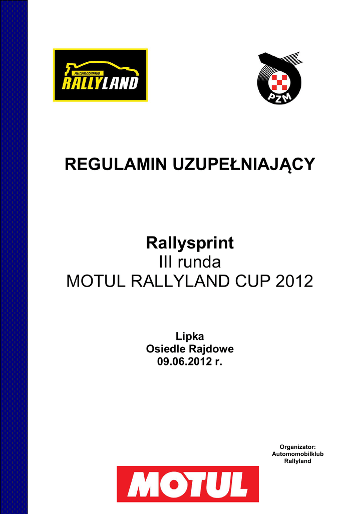 REGULAMIN UZUPEŁNIAJĄCY Rallysprint III runda MOTUL RALLYLAND CUP 2012 Lipka Osiedle Rajdowe 09.06.2012 r. Organizator: Automomobilklub Rallyland WSTĘP Rallysprint zostanie przeprowadzony zgodnie z postanowieniami: Międzynarodowego Kodeksu Sportowego, w części nie dotyczącej sportu kwalifikowanego Regulaminu Ramowego Konkursowej Jazdy Samochodowej na rok 2012, Ustawy „Prawo o Ruchu Drogowym RP” i niniejszego regulaminu uzupełniającego. Modyfikacje, zmiany i/lub uzupełnienia do niniejszego Regulaminu Uzupełniającego będą publikowane wyłącznie w numerowanych i datowanych komunikatach ogłaszanych przez organzatora. PROGRAM IMPREZY Otwarcie listy zgłoszeń 28.05.2012 Zamknięcie listy zgłoszeń 06.06.2012 godz. 15.00 lub wcześniej po zapełnieniu listy startowej Otwarcie Parku Serwisowego 09.06.2012 godz. 7.30 Badanie kontrolne BK 09.06.2012 godz. 7.30 – 8.40 Odbiór administracyjny 09.06.2012 godz. 8.00 – 9.00 Pierwsze posiedzenie ZSS 09.06.2012 godz. 9.00 Publikacja listy załóg dopuszczonych do startu 09.06.2012 godz. 9.10 Odprawa uczestników 09.06.2012 godz. 9.15 Zapoznanie z trasą 09.06.2012 godz. 9.30 – 10.15 Start 09.06.2012 godz. 10.30 Meta 09.06.2012 godz. 15.30 Posiedzenie ZSS 09.06.2012 godz. 15.45 Opublikowanie końcowej klasyfikacji prowizorycznej 09.06.2012 godz. 16.15 Rozdanie nagród 09.06.2012 godz. 16.45 1. USTALENIA OGÓLNE 1.1. Miejsce i termin imprezy Impreza odbędzie się dnia 09.06.2012 Start – godz. 10.30 Osiedle Rajdowe RALLYLAND (Lipka) Meta – godz. 16.30 Osiedle Rajdowe RAL LYLAND (Lipka) 1.2 Nazwa i ranga imprezy MOTUL RALLYLAND CUP 2012 – Rallysprint – III runda III runda Rajdowych Samochodowych Mistrzostw Okręgu Gdańskiego 1.3 Numer wizy ZO PZM 01/06/OKSSGD/2012 wydana1 czerwca 2012 r. 1.4 Lokalizacja Biura Biuro znajdować się będzie dnia 09.06.2012 od godz. 08.00 Osiedle Rajdowe RAL LYLAND (Lipka) 1.5 Lokalizacja startu, mety i parku zamkniętego Start – Osiedle Rajdowe RALLYLAND (Lipka) Meta – Osiedle Rajdowe RALLYLAND (Lipka) Park zamknięty - nie przewiduje się 1.6 Charakterystyka Impreza zostanie przeprowadzona w ciągu jednego dnia i składać się będzie z 3 etapów. Na trasie zlokalizowanych będzie 9 prób sprawnościowych (3 próby przejeżdżane 3-rokrotnie). Nawierzchnia trasy i prób: asfalt, beton, szuter. Łączna długość prób sprawnościowych: 22 km Długość poszczególnych prób do 2,5 km. Trasa imprezy i kolejność pokonywania prób są obowiązkowe. 2. ORGANIZACJA 2.1 Nazwa organizatora Automobilklub Rallyland 2.2 Adres Nieżychowice 91, 89-620 Chojnice 2.3 Władze 2.3.1 Zespół Sędziów Sportowych Przewodniczący Członek Członek 2.3.3 Osoby oficjalne Dyrektor Imprezy Asystent Dyrektora ds. sportowych Asystent Dyrektora ds. bezpieczeństwa Asystent Dyrektora ds. sędziów Kierownik Biura Kierownik Komisji Obliczeń Kierownik Badań Kontrolnych Kierownicy Prób Maciej Chmielarz Maciej Szmyt Marzanna Korycka Ireneusz Korycki Karol Zygmunt Błażej Chamier Ciemiński Wojciech Domek Sławomira Wilczyńska Paweł Lewandowski Tomasz Michalski Krzysztof Muszyński, Leszek Stachowiak, Sebastian Stopa, 3. ZGŁOSZENIA 3.1 Załoga 3.1.1 Załogę stanowią wyłącznie dwie osoby, określani jako kierowca i pilot. Kierowca musi mieć prawo jazdy, a pilot ukończone 17 lat. 3.1.2 Kierowca nie może posiadać jakiejkolwiek licencji kierowcy sportu samochodowego w rozumieniu przepisów Polskiego Związku Motorowego za wyjątkiem zawodników posiadających licencję, wymienionych w punkcie 1. Regulaminu ramowego KJS. 3.1.3 Pilot nie może prowadzić samochodu podczas imprezy. W przypadku stwierdzenia prowadzenia samochodu przez pilota, załoga zostanie wykluczona. 3.2 Obowiązki załogi 3.2.1 Obecność na odprawie uczestników. 3.2.2 Przejazd trasy imprezy w podanej przez organizatora kolejności i kierunku. 3.2.3 Umieszczenie karty identyfikacyjnej widocznej przez prawa tylną szybę. 3.2.4 Odbycie wszystkich prób zręcznościowych w zapiętych pasach bezpieczeństwa, zapiętych kaskach ochronnych, z włączonymi światłami mijania i zamkniętymi szybami. Nieprzestrzeganie powyższych przepisów pociągnie za sobą karę do wykluczenia włącznie. 3.3 Procedura zgłoszeń 3.3.1 Zgłoszenia będą przyjmowane poprzez witrynę internetową od 28.05.2012 do 06.06.2012 do godz. 15.00 lub do zapełnienia listy. Wypełnione zgłoszenie musi być podpisane przez obydwu członków załogi i przesłane na adres e-mail: [email protected] lub w dniu imprezy złożone w biurze zawodów. 3.3.2 Jeżeli zgłoszenie jest wysłane pocztą e-mail, oryginał musi dotrzeć do organizatora najpóźniej w dniu odbioru administracyjnego. Oryginał zgłoszenia musi być czytelny i podpisany przez obydwu członków załogi. 3.3.3 Zgłoszenie zostanie przyjęte tylko w przypadku, gdy towarzyszyć mu będzie pokwitowanie wpłaty pełnej kwoty wpisowego. 3.3.4 Przez fakt podpisania zgłoszenia załoga przyjmuje do wiadomości, że startuje w imprezie na własną odpowiedzialność i zrzeka się wszelkich praw do odszkodowań za straty wynikłe podczas imprezy. Zrzeczenie to dotyczy FIA, PZM, Organizatora, osób oficjalnych występujących w imprezie i innych uczestników. 3.3.5 Organizator ma prawo nie przyjęcia zgłoszenia bez podania przyczyny. 3.4 Maksymalna liczba uczestników 3.4.1 Maksymalna liczba startujących załóg : 80 3.4.2 W przypadku zgłoszenia więcej niż 80 załóg o przyjęciu decydować będzie kolejność wpływu zgłoszeń. Zgłoszenia bez wpłaty wpisowego nie będą przyjmowane. 3.5 Pojazdy dopuszczone Wszystkie samochody zgłoszone do imprezy muszą posiadać ważne dokumenty uprawniające do poruszania się po drogach publicznych i spełniają wymogi regulaminowe KJS, tj.: do udziału w imprezie dopuszcza się wyłącznie samochody osobowe w rozumieniu Prawa o Ruchu Drogowym lub osobowo – towarowe na bazie podwozia samochodu osobowego, ze sztywnym, zamkniętym dachem. 3.6 Podział na klasy P