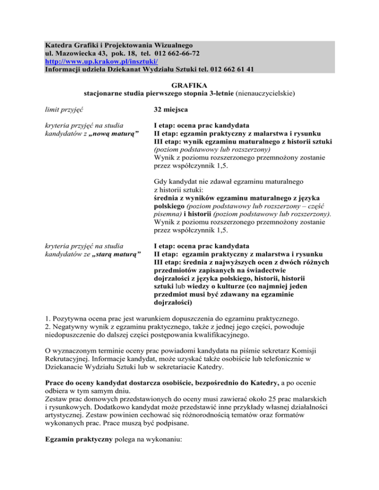 Katedra Grafiki i Projektowania Wizualnego ul. Mazowiecka 43, pok. 18, tel. 012 662-66-72 http://www.up.krakow.pl/insztuki/ Informacji udziela Dziekanat Wydziału Sztuki tel. 012 662 61 41 GRAFIKA stacjonarne studia pierwszego stopnia 3-letnie (nienauczycielskie) limit przyjęć 32 miejsca kryteria przyjęć na studia kandydatów z „nową maturą” I etap: ocena prac kandydata II etap: egzamin praktyczny z malarstwa i rysunku III etap: wynik egzaminu maturalnego z historii sztuki (poziom podstawowy lub rozszerzony) Wynik z poziomu rozszerzonego przemnoŜony zostanie przez współczynnik 1,5. Gdy kandydat nie zdawał egzaminu maturalnego z historii sztuki: średnia z wyników egzaminu maturalnego z języka polskiego (poziom podstawowy lub rozszerzony – część pisemna) i historii (poziom podstawowy lub rozszerzony). Wynik z poziomu rozszerzonego przemnoŜony zostanie przez współczynnik 1,5. kryteria przyjęć na studia kandydatów ze „starą maturą” I etap: ocena prac kandydata II etap: egzamin praktyczny z malarstwa i rysunku III etap: średnia z najwyŜszych ocen z dwóch róŜnych przedmiotów zapisanych na świadectwie dojrzałości z języka polskiego, historii, historii sztuki lub wiedzy o kulturze (co najmniej jeden przedmiot musi być zdawany na egzaminie dojrzałości) 1. Pozytywna ocena prac jest warunkiem dopuszczenia do egzaminu praktycznego. 2. Negatywny wynik z egzaminu praktycznego, takŜe z jednej jego części, powoduje niedopuszczenie do dalszej części postępowania kwalifikacyjnego. O wyznaczonym terminie oceny prac powiadomi kandydata na piśmie sekretarz Komisji Rekrutacyjnej. Informacje kandydat, moŜe uzyskać takŜe osobiście lub telefonicznie w Dziekanacie Wydziału Sztuki lub w sekretariacie Katedry. Prace do oceny kandydat dostarcza osobiście, bezpośrednio do Katedry, a po ocenie odbiera w tym samym dniu. Zestaw prac domowych przedstawionych do oceny musi zawierać około 25 prac malarskich i rysunkowych. Dodatkowo kandydat moŜe przedstawić inne przykłady własnej działalności artystycznej. Zestaw powinien cechować się róŜnorodnością tematów oraz formatów wykonanych prac. Prace muszą być podpisane. Egzamin praktyczny polega na wykonaniu: - malarstwa – martwa natura (technika do wyboru: olejna, akrylowa, temperowa, gwaszowa; dowolne podobrazie), - rysunku postaci (technika do wyboru: ołówek, węgiel), format 100 x 70 cm. Prace wykonane w czasie egzaminu pozostają własnością Uczelni. Czas trwania egzaminu: po 4 godziny zegarowe. Kandydat przynosi na egzamin własne materiały. Absolwenci roku 2008/2009 składają podania bez załączonych kserokopii świadectw dojrzałości, które zobowiązani są dostarczyć w dniu egzaminu praktycznego. Brak kserokopii świadectwa spowoduje niedopuszczenie kandydata do egzaminu. Konsultacje dla kandydatów – w poniedziałki i czwartki od godz. 13.00 do 15.00 sala 07 ul. Mazowiecka 43 – do 10 czerwca br. termin i miejsce składania dokumentów termin przeprowadzenia oceny prac egzaminu praktycznego 15 – 26 czerwca 2009 r. w Dziekanacie Wydziału Sztuki ul. PodchorąŜych 2, pok. 179 29, 30 czerwca 2009 r. 3, 4 lipca 2009 r. termin ogłoszenia listy przyjętych na studia 10 lipca 2009 r. termin dokonania wpisu na studia do 17 lipca 2009 r. termin ogłoszenia listy przyjętych z listy rezerwowej 20 lipca 2009 r. termin dokonania wpisu na studia z listy rezerwowej do 24 lipca 2009 r. Katedra Grafiki i Projektowania Wizualnego ul. Mazowiecka 43, pok. 18, tel. 012 662-66-72 http://www.up.krakow.pl/insztuki/ Informacji udziela Dziekanat Wydziału Sztuki tel. 012 662 61 41 GRAFIKA stacjonarne studia drugiego stopnia 2-letnie (nienauczycielskie) dla absolwentów studiów wyŜszych z dyplomem co najmniej licencjata. Rekrutacja uzupełniająca od 10.09 do 22.09.2009 r. limit przyjęć 32 miejsca kryteria przyjęć na studia I etap: ocena prac kandydata II etap: konkurs dyplomów Zestaw prac domowych przedstawionych do oceny musi zawierać około 25 prac malarskich i rysunkowych. Dodatkowo kandydat moŜe przedstawić inne przykłady własnej działalności artystycznej. Zestaw powinien cechować się róŜnorodnością tematów oraz formatów wykonanych prac. Prace muszą być podpisane. Konsultacje dla kandydatów – w poniedziałki i czwartki od godz. 13.00 do 15.00 sala 07 ul. Mazowiecka 43 – do 10 czerwca br. termin i miejsce składania dokumentów ocena prac 1 – 10 września 2009 r. w Dziekanacie Wydziału Sztuki ul. PodchorąŜych 2, pok. 179 Rekrutacja uzupełniająca od 10.09 do 22.09.2009 r. 18 września 2009 r. 23.09.2009 r. termin ogłoszenia listy przyjętych na studia 21 września 2009 r. 24.09.2009 r. termin dokonania wpisu na studia do 25 września 2009 r. od 25.09 do 29.09 2009 r. termin ogłoszenia listy przyjętych z listy rezerwowej 28 września 2009 r. termin dokonania wpisu na studia z listy rezerwowej wg ustaleń Katedry Katedra Grafiki i Projektowania Wizualnego ul. Mazowiecka 43, pok. 18, tel. 012 662-66-72 http://www.up.krakow.pl/insztuki/ Informacji udziela Dziekanat Wydziału Sztuki tel. 012 662 61 41 GRAFIKA niestacjonarne studia pierwszego stopnia 3-letnie (nienauczycielskie) Rekrutacja uzupełniająca od 10.09 do 22.09.2009 r. limit przyjęć 32 miejsca kryteria przyjęć na studia kandydatów z „nową maturą” I etap: egzamin praktyczny z malarstwa i rysunku II etap: wynik egzaminu maturalnego z historii sztuki (poziom podstawowy lub rozszerzony) Wynik z poziomu rozszerzonego przemnoŜony zostanie przez współczynnik 1,5. Gdy kandydat nie zdawał egzaminu maturalnego z historii sztuki: średnia z wyników egzaminu maturalnego z języka polskiego (poziom podstawowy lub rozszerzony – część pisemna) i historii (poziom podstawowy lub rozszerzony). Wynik z poziomu rozszerzonego przemnoŜony zostanie przez współczynnik 1,5. kryteria przyjęć na studia kandydatów ze „starą maturą” I etap: egzamin praktyczny z malarstwa i rysunku II etap: średni