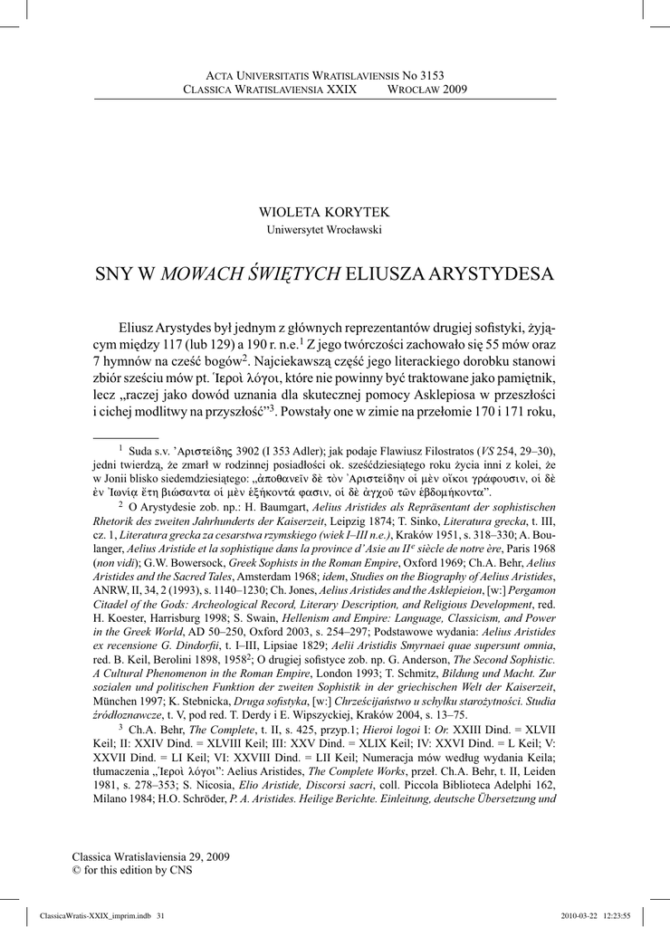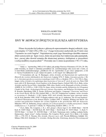 ACTA UNIVERSITATIS WRATISLAVIENSIS No 3153 CLASSICA WRATISLAVIENSIA XXIX WROCŁAW 2009 WIOLETA KORYTEK Uniwersytet Wrocławski SNY W MOWACH ŚWIĘTYCH ELIUSZA ARYSTYDESA Eliusz Arystydes był jednym z głównych reprezentantów drugiej sofistyki, żyjącym między 117 (lub 129) a 190 r. n.e.1 Z jego twórczości zachowało się 55 mów oraz 7 hymnów na cześć bogów2. Najciekawszą część jego literackiego dorobku stanowi zbiór sześciu mów pt. `Ieroˆ lÒgoi, które nie powinny być traktowane jako pamiętnik, lecz „raczej jako dowód uznania dla skutecznej pomocy Asklepiosa w przeszłości i cichej modlitwy na przyszłość”3. Powstały one w zimie na przełomie 170 i 171 roku, 1 Suda s.v. ’Ariste…dhj 3902 (I 353 Adler); jak podaje Flawiusz Filostratos (VS 254, 29–30), jedni twierdzą, że zmarł w rodzinnej posiadłości ok. sześćdziesiątego roku życia inni z kolei, że w Jonii blisko siedemdziesiątego: „¢poqaneῖn d tÕn 'Ariste…dhn oƒ mn o‡koi gr£fousin, oƒ d ™n 'Iwn…v œth bièsanta oƒ mn ˜x»kont£ fasin, oƒ d ¢gcoῦ tῶn ˜bdom»konta”. 2 O Arystydesie zob. np.: H. Baumgart, Aelius Aristides als Repräsentant der sophistischen Rhetorik des zweiten Jahrhunderts der Kaiserzeit, Leipzig 1874; T. Sinko, Literatura grecka, t. III, cz. 1, Literatura grecka za cesarstwa rzymskiego (wiek I–III n.e.), Kraków 1951, s. 318–330; A. Boulanger, Aelius Aristide et la sophistique dans la province d’ Asie au II e siècle de notre ère, Paris 1968 (non vidi); G.W. Bowersock, Greek Sophists in the Roman Empire, Oxford 1969; Ch.A. Behr, Aelius Aristides and the Sacred Tales, Amsterdam 1968; idem, Studies on the Biography of Aelius Aristides, ANRW, II, 34, 2 (1993), s. 1140–1230; Ch. Jones, Aelius Aristides and the Asklepieion, [w:] Pergamon Citadel of the Gods: Archeological Record, Literary Description, and Religious Development, red. H. Koester, Harrisburg 1998; S. Swain, Hellenism and Empire: Language, Classicism, and Power in the Greek World, AD 50–250, Oxford 2003, s. 254–297; Podstawowe wydania: Aelius Aristides ex recensione G. Dindorfii, t. I–III, Lipsiae 1829; Aelii Aristidis Smyrnaei quae supersunt omnia, red. B. Keil, Berolini 1898, 19582; O drugiej sofistyce zob. np. G. Anderson, The Second Sophistic. A Cultural Phenomenon in the Roman Empire, London 1993; T. Schmitz, Bildung und Macht. Zur sozialen und politischen Funktion der zweiten Sophistik in der griechischen Welt der Kaiserzeit, München 1997; K. Stebnicka, Druga sofistyka, [w:] Chrześcijaństwo u schyłku starożytności. Studia źródłoznawcze, t. V, pod red. T. Derdy i E. Wipszyckiej, Kraków 2004, s. 13–75. 3 Ch.A. Behr, The Complete, t. II, s. 425, przyp.1; Hieroi logoi I: Or. XXIII Dind. = XLVII Keil; II: XXIV Dind. = XLVIII Keil; III: XXV Dind. = XLIX Keil; IV: XXVI Dind. = L Keil; V: XXVII Dind. = LI Keil; VI: XXVIII Dind. = LII Keil; Numeracja mów według wydania Keila; tłumaczenia „`Ieroˆ lÒgoi”: Aelius Aristides, The Complete Works, przeł. Ch.A. Behr, t. II, Leiden 1981, s. 278–353; S. Nicosia, Elio Aristide, Discorsi sacri, coll. Piccola Biblioteca Adelphi 162, Milano 1984; H.O. Schröder, P. A. Aristides. Heilige Berichte. Einleitung, deutsche Übersetzung und Classica Wratislaviensia 29, 2009 © for this edition by CNS ClassicaWratis-XXIX_imprim.indb 31 2010-03-22 12:23:55 32 WIOLETA KORYTEK pierwsza nieco wcześniej od pozostałych4. Opisywane wydarzenia zazwyczaj nie są uporządkowane chronologicznie5. Ich treść jest subiektywnym odzwierciedleniem osobistego doświadczenia siedemnastu lat spędzonych na kuracjach zalecanych przez Asklepiosa6. W ciągu dwóch z nich, tj. od 145 do 147 r. n.e. stale przebywał w świątyni tego boga w Pergamonie7. Okres ten nazwał kathedra 8. Otrzymywał wtedy rady Kommentar, Heidelberg 1986; A.J. Festugière, H.D. Saffrey, Aelius Aristide, Discours sacrés. Rêve, religion, médecine au II e s. après J.-C., introd. et trad. par A.J.F., notes par H.D.S., Paris 1986; Eliusz Arystydes, „Mowy święte” Eliusza Arystydesa, tłum. M. Szarmach, Studia Graeco-Latina II, Toruń 1991, s. 59–65 (jest to tłumaczenie IV mowy); jak stwierdził E.R. Dodds (Pogaństwo i chrześcijaństwo w epoce niepokoju. Niektóre aspekty doświadczenia religijnego od Marka Aureliusza do Konstantyna Wielkiego, Kraków 2004, s. 48) utwory te stanowią pierwszą i jedyną religijną autobiografię, jaką nam zostawił świat pogański; jak wskazał S. Nicosia (L’autobiografia onirica de Elio Aristide, [w:] Il sogno in Grecia, red. G. Guidorizzi, Roma-Bari 1988, s. 176). Mowy święte są rodzajem traumbiografii, w której rzeczywistość, wizje, marzenia się splatają, zob. przyp. 6 i 14. 4 Zob. Ch.A. Behr, Studies on the Biography..., s. 1160–1161; idem, The Complete..., s. 425, przyp. 1; ostatnia, szósta zachowana jedynie we fragmencie. Jak twierdzi bizantyjski scholiasta Nikephoros Gregoras, nie została ukończona z powodu śmierci sofisty: Schol. in Ptol. Harm. III 14; zob. Ch.A. Behr, Aelius Aristides..., s. 91, przyp. 1; S. Swain (op. cit., s. 261) podaje inną datację: pierwsza mowa miała powstać w 171/172 r. n.e., natomiast pozostałe mogły powstać po 175 r. n.e. Różnice w datowaniu wynikają (Ch.A. Behr, Studies on the Biography..., s. 1156) z trudności w identyfikacji Salwiusza (jak podaje Arystydes) ówczesnego konsula, który przyśnił się Zosimosowi podczas pierwszej nocy w asklepiejonie pergameńskim w 145 r. Imię to łączono z P. Sylwiuszem Julianusem, konsulem z 175 r. n.e. Ch.A. Behr natomiast utożsamia go z L. Oktawiuszem Korneliuszem Sylwiuszem Julianuszem Emilianusem, który był słynnym prawnikiem. Sprawował on funkcję consul ordinarius w 148 r. n.e. Tę różnicę w datacji tłumaczy błędem Arystydesa. Ch.A. Behr (Studies on the Biography..., s. 1160) na podstawie dwóch niezależnych wstępów (Or. XLVII i Or. XLVIII) stwierdza, że powstały one w dwóch etapach. Ostatnie wydarzenia