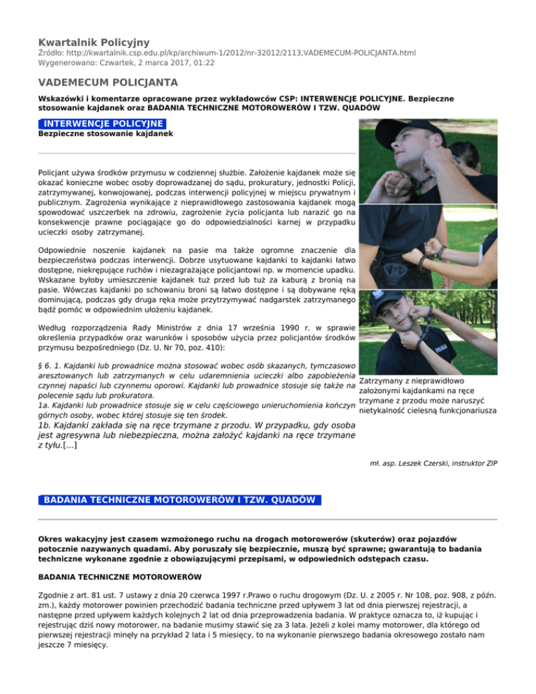Kwartalnik Policyjny Źródło: http://kwartalnik.csp.edu.pl/kp/archiwum-1/2012/nr-32012/2113,VADEMECUM-POLICJANTA.html Wygenerowano: Czwartek, 2 marca 2017, 01:22 VADEMECUM POLICJANTA Wskazówki i komentarze opracowane przez wykładowców CSP: INTERWENCJE POLICYJNE. Bezpieczne stosowanie kajdanek oraz BADANIA TECHNICZNE MOTOROWERÓW I TZW. QUADÓW INTERWENCJE POLICYJNE Bezpieczne stosowanie kajdanek Policjant używa środków przymusu w codziennej służbie. Założenie kajdanek może się okazać konieczne wobec osoby doprowadzanej do sądu, prokuratury, jednostki Policji, zatrzymywanej, konwojowanej, podczas interwencji policyjnej w miejscu prywatnym i publicznym. Zagrożenia wynikające z nieprawidłowego zastosowania kajdanek mogą spowodować uszczerbek na zdrowiu, zagrożenie życia policjanta lub narazić go na konsekwencje prawne pociągające go do odpowiedzialności karnej w przypadku ucieczki osoby zatrzymanej. Odpowiednie noszenie kajdanek na pasie ma także ogromne znaczenie dla bezpieczeństwa podczas interwencji. Dobrze usytuowane kajdanki to kajdanki łatwo dostępne, niekrępujące ruchów i niezagrażające policjantowi np. w momencie upadku. Wskazane byłoby umieszczenie kajdanek tuż przed lub tuż za kaburą z bronią na pasie. Wówczas kajdanki po schowaniu broni są łatwo dostępne i są dobywane ręką dominującą, podczas gdy druga ręka może przytrzymywać nadgarstek zatrzymanego bądź pomóc w odpowiednim ułożeniu kajdanek. Według rozporządzenia Rady Ministrów z dnia 17 września 1990 r. w sprawie określenia przypadków oraz warunków i sposobów użycia przez policjantów środków przymusu bezpośredniego (Dz. U. Nr 70, poz. 410): § 6. 1. Kajdanki lub prowadnice można stosować wobec osób skazanych, tymczasowo aresztowanych lub zatrzymanych w celu udaremnienia ucieczki albo zapobieżenia czynnej napaści lub czynnemu oporowi. Kajdanki lub prowadnice stosuje się także na polecenie sądu lub prokuratora. 1a. Kajdanki lub prowadnice stosuje się w celu częściowego unieruchomienia kończyn górnych osoby, wobec której stosuje się ten środek. Zatrzymany z nieprawidłowo założonymi kajdankami na ręce trzymane z przodu może naruszyć nietykalność cielesną funkcjonariusza 1b. Kajdanki zakłada się na ręce trzymane z przodu. W przypadku, gdy osoba jest agresywna lub niebezpieczna, można założyć kajdanki na ręce trzymane z tyłu.[...] mł. asp. Leszek Czerski, instruktor ZIP BADANIA TECHNICZNE MOTOROWERÓW I TZW. QUADÓW Okres wakacyjny jest czasem wzmożonego ruchu na drogach motorowerów (skuterów) oraz pojazdów potocznie nazywanych quadami. Aby poruszały się bezpiecznie, muszą być sprawne; gwarantują to badania techniczne wykonane zgodnie z obowiązującymi przepisami, w odpowiednich odstępach czasu. BADANIA TECHNICZNE MOTOROWERÓW Zgodnie z art. 81 ust. 7 ustawy z dnia 20 czerwca 1997 r.Prawo o ruchu drogowym (Dz. U. z 2005 r. Nr 108, poz. 908, z późn. zm.), każdy motorower powinien przechodzić badania techniczne przed upływem 3 lat od dnia pierwszej rejestracji, a następne przed upływem każdych kolejnych 2 lat od dnia przeprowadzenia badania. W praktyce oznacza to, iż kupując i rejestrując dziś nowy motorower, na badanie musimy stawić się za 3 lata. Jeżeli z kolei mamy motorower, dla którego od pierwszej rejestracji minęły na przykład 2 lata i 5 miesięcy, to na wykonanie pierwszego badania okresowego zostało nam jeszcze 7 miesięcy. Jeśli mamy do czynienia ze starszym motorowerem, art. 6 ust. 2 ustawy z dnia 22 maja 2009 r. o zmianie ustawy – Prawo o ruchu drogowym oraz niektórych innych ustaw (Dz. U. Nr 97, poz. 802) stanowi, iż właściciel motoroweru, dla którego od dnia pierwszej rejestracji minęło więcej niż 3 lata, obowiązany jest przedstawić go do badania technicznego w terminie roku od dnia wejścia w życie niniejszej ustawy. Według powszechnej interpretacji powyższych przepisów, posiadacze motorowerów z „dożywotnim” przeglądem technicznym zostali zobligowani do przeprowadzenia badania technicznego do dnia 22 września 2010 r. oraz wymiany dowodu rejestracyjnego na odpowiadający aktualnym przepisom. Właściciele motorowerów, którzy tego nie zrobili, muszą się liczyć z tym, że podczas kontroli drogowej zostanie im zatrzymany dowód rejestracyjny za pokwitowaniem. Oczywiście, powyższa sytuacja dotyczy także osób, które – co prawda – wymieniły dowód rejestracyjny i przeprowadziły przegląd, ale po okresie dwóch lat zapomniały o konieczności wykonania kolejnego badania technicznego. Jeżeli od dnia pierwszej rejestracji motoroweru nie minęły jeszcze 3 lata, nie ma obowiązku przedstawienia go do okresowego badania technicznego. Licząc wiek motoroweru od pierwszej rejestracji, chodzi oczywiście o pierwszą rejestrację pojazdu w ogóle, a nie tylko w Polsce. Liczenie względem daty rejestracji w naszym kraju nie miałoby sensu – dziesięcioletni pojazd sprowadzony z zagranicy, patrząc przez pryzmat stanu technicznego, trzeba by uznać za nowy. W dokumentach kupowanego pojazdu na pewno znajduje się wpis dotyczący takiej daty, gdyż jest to określone przepisami.[...] asp. Robert Szczech, wykładowca ZRD asp. Dariusz Szymanik, mł. wykładowca ZRD Pełna wersja artykułu w pliku PDF Załączniki do strony Vademecum policjanta.pdf 3.29 MB