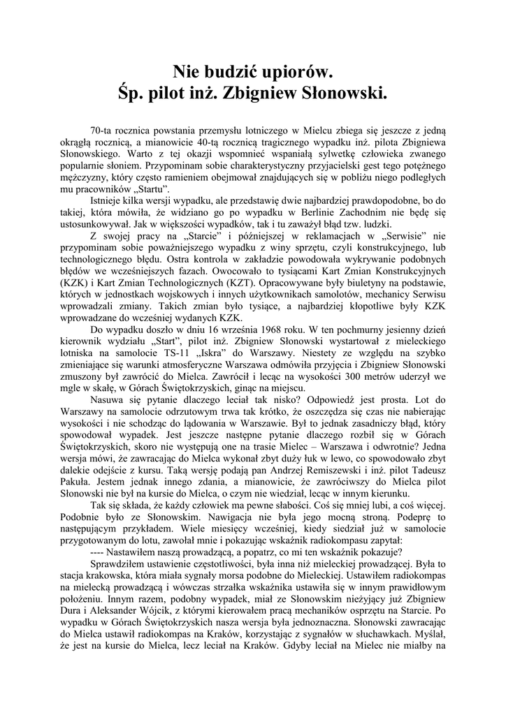 Nie budzić upiorów. Śp. pilot inż. Zbigniew Słonowski. 70-ta rocznica powstania przemysłu lotniczego w Mielcu zbiega się jeszcze z jedną okrągłą rocznicą, a mianowicie 40-tą rocznicą tragicznego wypadku inż. pilota Zbigniewa Słonowskiego. Warto z tej okazji wspomnieć wspaniałą sylwetkę człowieka zwanego popularnie słoniem. Przypominam sobie charakterystyczny przyjacielski gest tego potężnego mężczyzny, który często ramieniem obejmował znajdujących się w pobliżu niego podległych mu pracowników „Startu”. Istnieje kilka wersji wypadku, ale przedstawię dwie najbardziej prawdopodobne, bo do takiej, która mówiła, że widziano go po wypadku w Berlinie Zachodnim nie będę się ustosunkowywał. Jak w większości wypadków, tak i tu zaważył błąd tzw. ludzki. Z swojej pracy na „Starcie” i późniejszej w reklamacjach w „Serwisie” nie przypominam sobie poważniejszego wypadku z winy sprzętu, czyli konstrukcyjnego, lub technologicznego błędu. Ostra kontrola w zakładzie powodowała wykrywanie podobnych błędów we wcześniejszych fazach. Owocowało to tysiącami Kart Zmian Konstrukcyjnych (KZK) i Kart Zmian Technologicznych (KZT). Opracowywane były biuletyny na podstawie, których w jednostkach wojskowych i innych użytkownikach samolotów, mechanicy Serwisu wprowadzali zmiany. Takich zmian było tysiące, a najbardziej kłopotliwe były KZK wprowadzane do wcześniej wydanych KZK. Do wypadku doszło w dniu 16 września 1968 roku. W ten pochmurny jesienny dzień kierownik wydziału „Start”, pilot inż. Zbigniew Słonowski wystartował z mieleckiego lotniska na samolocie TS-11 „Iskra” do Warszawy. Niestety ze względu na szybko zmieniające się warunki atmosferyczne Warszawa odmówiła przyjęcia i Zbigniew Słonowski zmuszony był zawrócić do Mielca. Zawrócił i lecąc na wysokości 300 metrów uderzył we mgle w skałę, w Górach Świętokrzyskich, ginąc na miejscu. Nasuwa się pytanie dlaczego leciał tak nisko? Odpowiedź jest prosta. Lot do Warszawy na samolocie odrzutowym trwa tak krótko, że oszczędza się czas nie nabierając wysokości i nie schodząc do lądowania w Warszawie. Był to jednak zasadniczy błąd, który spowodował wypadek. Jest jeszcze następne pytanie dlaczego rozbił się w Górach Świętokrzyskich, skoro nie występują one na trasie Mielec – Warszawa i odwrotnie? Jedna wersja mówi, że zawracając do Mielca wykonał zbyt duży łuk w lewo, co spowodowało zbyt dalekie odejście z kursu. Taką wersję podają pan Andrzej Remiszewski i inż. pilot Tadeusz Pakuła. Jestem jednak innego zdania, a mianowicie, że zawróciwszy do Mielca pilot Słonowski nie był na kursie do Mielca, o czym nie wiedział, lecąc w innym kierunku. Tak się składa, że każdy człowiek ma pewne słabości. Coś się mniej lubi, a coś więcej. Podobnie było ze Słonowskim. Nawigacja nie była jego mocną stroną. Podeprę to następującym przykładem. Wiele miesięcy wcześniej, kiedy siedział już w samolocie przygotowanym do lotu, zawołał mnie i pokazując wskaźnik radiokompasu zapytał: ---- Nastawiłem naszą prowadzącą, a popatrz, co mi ten wskaźnik pokazuje? Sprawdziłem ustawienie częstotliwości, była inna niż mieleckiej prowadzącej. Była to stacja krakowska, która miała sygnały morsa podobne do Mieleckiej. Ustawiłem radiokompas na mielecką prowadzącą i wówczas strzałka wskaźnika ustawiła się w innym prawidłowym położeniu. Innym razem, podobny wypadek, miał ze Słonowskim nieżyjący już Zbigniew Dura i Aleksander Wójcik, z którymi kierowałem pracą mechaników osprzętu na Starcie. Po wypadku w Górach Świętokrzyskich nasza wersja była jednoznaczna. Słonowski zawracając do Mielca ustawił radiokompas na Kraków, korzystając z sygnałów w słuchawkach. Myślał, że jest na kursie do Mielca, lecz leciał na Kraków. Gdyby leciał na Mielec nie miałby na trasie Gór Świętokrzyskich. Miałby je z prawej strony. Lecąc na małej wysokości na Kraków, leciał prosto po śmierć, bo po trasie miał góry. Wyrżnął samolotem o skałę, jak jajem o ścianę, rozbryzgując szczątki samolotu na dużej przestrzeni. Taka jest wersja moja i pozostałych kierujących osprzętem na „Starcie”. Pracowałem tego feralnego dnia na drugiej zmianie, kiedy przyszła informacja od pana Andrzeja Remiszewskiego z wierzy kontrolnej, o braku kontaktu ze Słonowskim. Poinformowano odpowiednie służby, które zawiadomiły, że mieszkaniec wioski słyszał w górach huk. W powietrzu w tym czasie znajdował się Michał Skowroński z Wiktorem Białkiem, którzy także bezskutecznie wzywali w eterze Słonowskiego. Następny meldunek potwierdzał tragiczny wypadek. Natychmiast zmontowano ekipę, która pojechała na miejsce zdarzenia. Mechanik Lubliński będący w ekipie, po powrocie, przedstawił makabryczny obraz. Odnalezione szczątki samolotu można było w płachcie zmieścić. Na tym znajdowały się fragmenty jego ciała. Miał 39 lat. Szczątki samolotu zakopane zostały za hangarem. Istnieje taśma z nagraniem tego feralnego lotu. Zachował ją na pamiątkę pan Andrzej Remiszewski, żywa legenda tamtych czasów. Być może uda się odtworzyć akustyczny zapis z taśmy, ale nie będzie to proste, gdyż zapis jest na rolce taśmy. Technika poszła tak daleko, że nie ma już takich magnetofonów. Rzadkością są magnetowidy wypierane przez cyfrowe nagrywarki. Pan Andrzej przez 40 lat nie mógł się zdobyć na odsłuchanie taśmy z głosem swego bliskiego przyjaciela. A może nie należy budzić upiorów zawartych w taśmie? Teofil Lenartowicz.