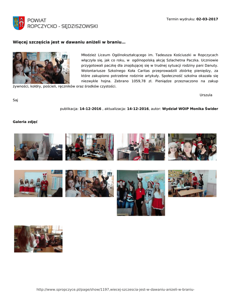 Termin wydruku: 02-03-2017 Więcej szczęścia jest w dawaniu aniżeli w braniu… Młodzież Liceum Ogólnokształcącego im. Tadeusza Kościuszki w Ropczycach włączyła się, jak co roku, w ogólnopolską akcję Szlachetna Paczka. Uczniowie przygotowali paczkę dla znajdującej się w trudnej sytuacji rodziny pani Danuty. Wolontariusze Szkolnego Koła Caritas przeprowadzili zbiórkę pieniędzy, za które zakupiono potrzebne rodzinie artykuły. Społeczność szkolna okazała się niezwykle hojna. Zebrano 1059,78 zł. Pieniądze przeznaczono na zakup żywności, kołdry, pościeli, ręczników oraz środków czystości. Urszula Saj publikacja: 14-12-2016 , aktualizacja: 14-12-2016, autor: Wydział WOiP Monika Świder Galeria zdjęć http://www.spropczyce.pl/page/show/1197,wiecej-szczescia-jest-w-dawaniu-anizeli-w-braniu-