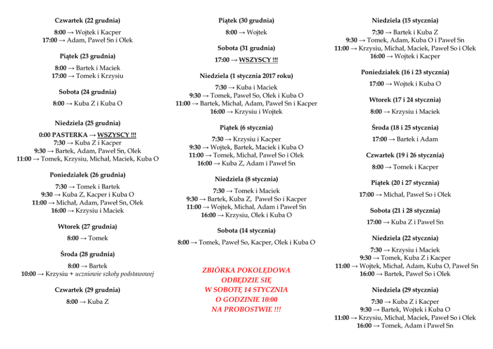 Czwartek (22 grudnia) Piątek (30 grudnia) Niedziela (15 stycznia) 8:00 → Wojtek i Kacper 17:00 → Adam, Paweł Sn i Olek 8:00 → Wojtek 7:30 → Bartek i Kuba Z 9:30 → Tomek, Adam, Kuba O i Paweł Sn 11:00 → Krzysiu, Michał, Maciek, Paweł So i Olek 16:00 → Wojtek i Kacper Sobota (31 grudnia) Piątek (23 grudnia) 8:00 → Bartek i Maciek 17:00 → Tomek i Krzysiu Sobota (24 grudnia) 8:00 → Kuba Z i Kuba O Niedziela (25 grudnia) 0:00 PASTERKA → WSZYSCY !!! 7:30 → Kuba Z i Kacper 9:30 → Bartek, Adam, Paweł Sn, Olek 11:00 → Tomek, Krzysiu, Michał, Maciek, Kuba O Poniedziałek (26 grudnia) 7:30 → Tomek i Bartek 9:30 → Kuba Z, Kacper i Kuba O 11:00 → Michał, Adam, Paweł Sn, Olek 16:00 → Krzysiu i Maciek Wtorek (27 grudnia) 8:00 → Tomek 17:00 → WSZYSCY !!! Niedziela (1 stycznia 2017 roku) Czwartek (29 grudnia) 8:00 → Kuba Z 17:00 → Wojtek i Kuba O 7:30 → Kuba i Maciek 9:30 → Tomek, Paweł So, Olek i Kuba O 11:00 → Bartek, Michał, Adam, Paweł Sn i Kacper 16:00 → Krzysiu i Wojtek Wtorek (17 i 24 stycznia) Piątek (6 stycznia) Środa (18 i 25 stycznia) 7:30 → Krzysiu i Kacper 9:30 → Wojtek, Bartek, Maciek i Kuba O 11:00 → Tomek, Michał, Paweł So i Olek 16:00 → Kuba Z, Adam i Paweł Sn 17:00 → Bartek i Adam Niedziela (8 stycznia) 7:30 → Tomek i Maciek 9:30 → Bartek, Kuba Z, Paweł So i Kacper 11:00 → Wojtek, Michał, Adam i Paweł Sn 16:00 → Krzysiu, Olek i Kuba O 8:00 → Krzysiu i Maciek Czwartek (19 i 26 stycznia) 8:00 → Tomek i Kacper Piątek (20 i 27 stycznia) 17:00 → Michał, Paweł So i Olek Sobota (21 i 28 stycznia) 17:00 → Kuba Z i Paweł Sn Sobota (14 stycznia) 8:00 → Tomek, Paweł So, Kacper, Olek i Kuba O Środa (28 grudnia) 8:00 → Bartek 10:00 → Krzysiu + uczniowie szkoły podstawowej Poniedziałek (16 i 23 stycznia) ZBIÓRKA POKOLĘDOWA ODBĘDZIE SIĘ W SOBOTĘ 14 STYCZNIA O GODZINIE 10:00 NA PROBOSTWIE !!! Niedziela (22 stycznia) 7:30 → Krzysiu i Maciek 9:30 → Tomek, Kuba Z i Kacper 11:00 → Wojtek, Michał, Adam, Kuba O, Paweł Sn 16:00 → Bartek, Paweł So i Olek Niedziela (29 stycznia) 7:30 → Kuba Z i Kacper 9:30 → Bartek, Wojtek i Kuba O 11:00 → Krzysiu, Michał, Maciek, Paweł So i Olek 16:00 → Tomek, Adam i Paweł Sn