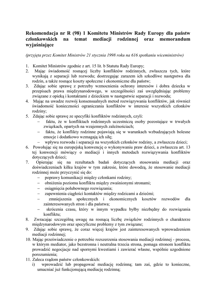 Rekomendacja nr R (98) 1 Komitetu Ministrów Rady Europy dla państw członkowskich na temat mediacji rodzinnej oraz memorandum wyjaśniające (przyjęta przez Komitet Ministrów 21 stycznia 1998 roku na 616 spotkaniu wiceministrów) 1. Komitet Ministrów zgodnie z art. 15 lit. b Statutu Rady Europy; 2. Mając świadomość rosnącej liczby konfliktów rodzinnych, zwłaszcza tych, które wynikają z separacji lub rozwodu; dostrzegając zarazem ich szkodliwe następstwa dla rodzin, a takŜe rosnące koszty społeczne i ekonomiczne dla państw; 3. Zdając sobie sprawę z potrzeby wzmocnienia ochrony interesów i dobra dziecka w przepisach prawa międzynarodowego, w szczególności zaś uwzględniając problemy związane z opieką i kontaktami z dzieckiem w następstwie separacji i rozwodu; 4. Mając na uwadze rozwój konsensualnych metod rozwiązywania konfliktów, jak równieŜ świadomość konieczności ograniczania konfliktów w interesie wszystkich członków rodziny; 5. Zdając sobie sprawę ze specyfiki konfliktów rodzinnych, czyli: − faktu, Ŝe w konfliktach rodzinnych uczestniczą osoby pozostające w trwałych związkach, opartych na wzajemnych zaleŜnościach; − faktu, Ŝe konflikty rodzinne pojawiają się w warunkach wzbudzających bolesne emocje i dodatkowo wzmagają ich siłę; − wpływu rozwodu i separacji na wszystkich członków rodziny, a zwłaszcza dzieci; 6. Powołując się na europejską konwencję o wykonywaniu praw dzieci, a zwłaszcza art. 13 tej konwencji mówiący o mediacji i innych metodach rozwiązywania konfliktów dotyczących dzieci; 7. Opierając się na rezultatach badań dotyczących stosowania mediacji oraz doświadczeniach kilku krajów w tym zakresie, które dowodzą, Ŝe stosowanie mediacji rodzinnej moŜe przyczynić się do: − poprawy komunikacji między członkami rodziny; − obniŜenia poziomu konfliktu między zwaśnionymi stronami; − osiągnięcia polubownego rozwiązania; − zapewnienia ciągłości kontaktów między rodzicami a dziećmi; − zmniejszenia społecznych i ekonomicznych kosztów rozwodów dla zainteresowanych stron i dla państwa; − skrócenia czasu, który w innym wypadku byłby niezbędny do rozwiązania konfliktu; 8. Zwracając szczególną uwagę na rosnącą liczbę związków rodzinnych o charakterze międzynarodowym oraz specyficzne problemy z tym związane; 9. Zdając sobie sprawę, Ŝe coraz więcej krajów jest zainteresowanych wprowadzeniem mediacji rodzinnej; 10. Mając przeświadczenie o potrzebie rozszerzenia stosowania mediacji rodzinnej - procesu, w którym mediator, jako bezstronna i neutralna trzecia strona, pomaga stronom konfliktu prowadzić negocjacje nad spornymi kwestiami i zawierać własne, wspólnie uzgodnione porozumienia; 11. Zaleca rządom państw członkowskich: i) wprowadzić lub propagować mediację rodzinną; tam zaś, gdzie to konieczne, umacniać juŜ funkcjonującą mediację rodzinną; ii) przedsięwziąć lub zintensyfikować wszelkie niezbędne środki dla wprowadzenia następujących załoŜeń związanych z propagowaniem i stosowaniem mediacji jako właściwej formy rozwiązywania konfliktów rodzinnych. ZASADY MEDIACJI RODZINNEJ I. Zakres mediacji a) Mediacja rodzinna moŜe być stosowana we wszystkich konfliktach między członkami tej samej rodziny, których łączą więzy pokrewieństwa bądź małŜeństwa, oraz osobami, które pozostawały lub pozostają w związkach rodzinnych zgodnie z definicją przyjętą w prawie wewnętrznym. b) Państwa mają jednak prawo określać zakres specyficznych problemów i spraw, w których mediacja rodzinna będzie stosowana. II. Organizacja mediacji a) Co do zasady, mediacja nie powinna być obowiązkowa. b) Państwa mają swobodę organizowania i świadczenia mediacji w sposób, jaki uznają za stosowny, za pośrednictwem sektora publicznego lub prywatnego. c) NiezaleŜnie od form organizowania i świadczenia mediacji państwa powinny podjąć odpowiednie kroki w celu stworzenia mechanizmów, które zagwarantują istnienie: − procedur wybierania, szkolenia i kwalifikacji mediatorów; − standardów, jakie powinni spełniać i zachowywać mediatorzy. III. Proces mediacji Państwa powinny zadbać o stworzenie odpowiednich mechanizmów, dzięki którym proces mediacji będzie przebiegał zgodnie z następującymi zasadami: i) mediator jest bezstronny; ii) mediator jest neutralny wobec wyniku procesu mediacji; iii) mediator szanuje punkt widzenia obu stron i dba o równość ich stanowisk; iv) mediator nie moŜe narzucać stronom Ŝadnych rozwiązań; v) mediacja rodzinna powinna odbywać się w warunkach gwarantujących ochronę prywatności; vi) rozmowy prowadzone w czasie mediacji są poufne i mogą być wykorzystane w innych okolicznościach jedynie za zgodą stron lub w wypadkach, gdy zezwala na to prawo wewnętrzne; vii) mediator powinien, gdy zachodzą odpowiednie okoliczności, informować strony o moŜliwości skorzystania z poradnictwa rodzinnego lub innych form poradnictwa, jako właściwego sposobu rozwiązywania problemów małŜeńskich lub rodzinnych; viii) mediator powinien mieć na uwadze dobro i interesy dziecka; jego obowiązkiem jest teŜ zachęcanie rodziców, by skoncentrowali się na potrzebach dziecka oraz przypominanie im o podstawowej odpowiedzialności związanej z dobrem dzieci oraz potrzebie informowania ich i konsultowania się z nimi; ix) mediator powinien zwrócić szczególną uwagę na ewentualne stosowanie przemocy w rodzinie w przeszłości i moŜliwość jej uŜycia w przyszłości, a takŜe wpływ, jaki x) moŜe to wywierać na stanowiska stron; powinien takŜe rozwaŜyć, czy mediacja w takich okolicznościach jest środkiem odpowiednim; mediator moŜe udzielać informacji prawnych, lecz nie powinien udzielać porad prawnych. W odpowiednich okolicznościach mediator powinien informować strony o moŜliwości skonsultowania się z prawnikiem lub innym ekspertem. IV. Status ugody mediacyjnej P