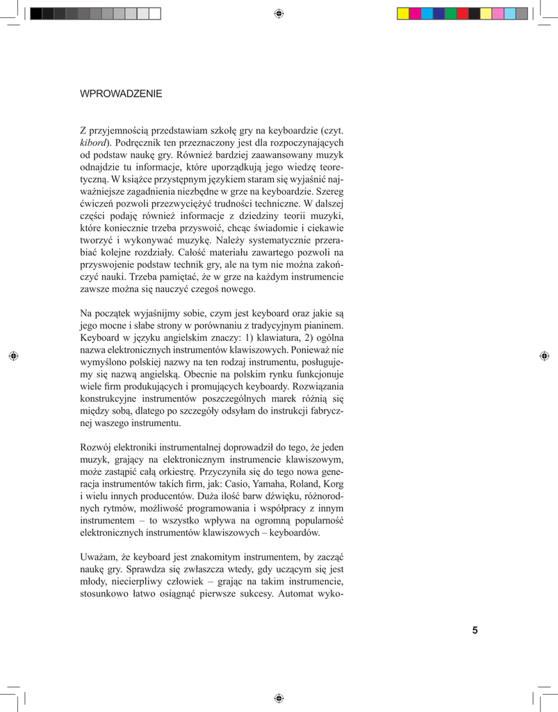 WPROWADZENIE Z przyjemnością przedstawiam szkołę gry na keyboardzie (czyt. kibord). Podręcznik ten przeznaczony jest dla rozpoczynających od podstaw naukę gry. Również bardziej zaawansowany muzyk odnajdzie tu informacje, które uporządkują jego wiedzę teoretyczną. W książce przystępnym językiem staram się wyjaśnić najważniejsze zagadnienia niezbędne w grze na keyboardzie. Szereg ćwiczeń pozwoli przezwyciężyć trudności techniczne. W dalszej części podaję również informacje z dziedziny teorii muzyki, które koniecznie trzeba przyswoić, chcąc świadomie i ciekawie tworzyć i wykonywać muzykę. Należy systematycznie przerabiać kolejne rozdziały. Całość materiału zawartego pozwoli na przyswojenie podstaw technik gry, ale na tym nie można zakończyć nauki. Trzeba pamiętać, że w grze na każdym instrumencie zawsze można się nauczyć czegoś nowego. Na początek wyjaśnijmy sobie, czym jest keyboard oraz jakie są jego mocne i słabe strony w porównaniu z tradycyjnym pianinem. Keyboard w języku angielskim znaczy: 1) klawiatura, 2) ogólna nazwa elektronicznych instrumentów klawiszowych. Ponieważ nie wymyślono polskiej nazwy na ten rodzaj instrumentu, posługujemy się nazwą angielską. Obecnie na polskim rynku funkcjonuje wiele firm produkujących i promujących keyboardy. Rozwiązania konstrukcyjne instrumentów poszczególnych marek różnią się między sobą, dlatego po szczegóły odsyłam do instrukcji fabrycznej waszego instrumentu. Rozwój elektroniki instrumentalnej doprowadził do tego, że jeden muzyk, grający na elektronicznym instrumencie klawiszowym, może zastąpić całą orkiestrę. Przyczyniła się do tego nowa generacja instrumentów takich firm, jak: Casio, Yamaha, Roland, Korg i wielu innych producentów. Duża ilość barw dźwięku, różnorodnych rytmów, możliwość programowania i współpracy z innym instrumentem – to wszystko wpływa na ogromną popularność elektronicznych instrumentów klawiszowych – keyboardów. Uważam, że keyboard jest znakomitym instrumentem, by zacząć naukę gry. Sprawdza się zwłaszcza wtedy, gdy uczącym się jest młody, niecierpliwy człowiek – grając na takim instrumencie, stosunkowo łatwo osiągnąć pierwsze sukcesy. Automat wyko 5 nuje za nas akompaniament, harmonizuje melodię. Z czasem ta funkcja keyboardu może stać się największym ograniczeniem. Być może za kilka lat, może miesięcy, zapragniesz sam tworzyć akompaniament, bez mechanicznej perkusji. Automaty, pomimo ciągłego rozwoju elektroniki, nie są w stanie zastąpić człowieka. Są coraz lepsze, bardziej elastyczne, jednakże w dalszym ciągu nie dają muzykowi pełnej swobody. Pod tym względem pianino daje więcej możliwości. Posiada również lepszą klawiaturę, umożliwiającą bardziej zróżnicowaną dynamicznie grę. Keyboard zwykle posiada tzw. dynamiczną klawiaturę (w zależności od siły nacisku na klawisz otrzymujemy różne głośności dźwięku), jednakże w praktyce trudno tu wykonać silne kontrasty dynamiczne, dlatego w zawartych w książce nutach w zasadzie zrezygnowałem z podawania wskazówek dynamicznych czy artykulacyjnych. Zrezygnowałem również z nauki klucza basowego, który w grze na keyboardzie jest zupełnie zbędny. Jeśli w przyszłości zdecydujesz się na grę na pianinie, będziesz musiał opanować czytanie tego klucza, gdyż w zapisie fortepianowym jest on powszechny. Wszystkie utwory, do których nuty zawarte są w książce, zostały nagrane na płycie. Nagrania służą do przedstawienia prawidłowej wersji kompozycji, a nie zaprezentowania możliwości instrumentu czy muzyka. Są to możliwie najprostsze wersje, które w miarę możliwości sprzętowych można urozmaicić licznymi barwami i efektami, jakie oferują bardziej rozbudowane keyboardy. Warto też eksperymentować z rodzajem akompaniamentu, który w przykładach muzycznych jest zwykle podstawowy. Krzysztof Raduła 6 LEKCJA 1 Jeśli przyjrzysz się klawiaturze swojego instrumentu, zauważysz, że składa się ona z czarnych i białych klawiszy. Białe klawisze ułożone są jeden obok drugiego, czarne zaś podzielone są na dwie grupy, składające się z dwóch i trzech klawiszy, zestawiane na przemian. Białym klawiszem, umieszczonym przed grupą dwóch czarnych klawiszy, wydobywamy dźwięk C. Tak samo nazywa się każdy klawisz leżący przed dwoma czarnymi klawiszami. Każdy kolejny brzmi podobnie, ale wyżej. W teorii muzyki taka odległość między dwoma dźwiękami nazywa się oktawą. Więcej informacji dotyczących interwałów znajdziesz w dalszej części książki. C C Pomiędzy opisanymi dźwiękami C znajduje się sześć białych klawiszy. Są to kolejno od lewej do prawej strony klawiatury: D E F G A H. C D E F G A H C 7 Postaraj się teraz zapamiętać, jak nazywają się kolejne klawisze. Pamiętaj, że każdy z nich ma swoje odpowiedniki w kolejnych oktawach, podobnie jak to miało miejsce w przypadku dźwięku C. Odnalezienie dźwięku D prawdopodobne nie sprawi Ci trudności, ponieważ, znając położenie dźwięku C, wystarczy przycisnąć pierwszy klawisz z prawej strony. Bardziej kłopotliwe może być znalezienie dźwięku A, ponieważ musiałbyś odliczyć pięć białych klawiszy od dźwięku C. Jeśli chcesz tego uniknąć, proponuję, byś na początek zapamiętał oprócz dźwięku C również dźwięk F (położony przed grupą trzech czarnych klawiszy). Teraz dźwięki D i E znajdziesz licząc od dźwięku C, zaś G, A i H odnajdziesz licząc od F. Aby szybciej zapamiętać nazwy klawiszy, uderzaj je po kolei albo na wyrywki, równocześnie głośno wypowiadając ich nazwy. Innym ćwiczeniem jest wyszukiwanie wszystkich C na klawiaturze, następnie wszystkich G itd. Nazwy czarnych klawiszy podane zostaną w dalszej części. W przykładach nutowych, znajdujących się w następnych lekcjach, nad nutami umieszczone są cyferki. Jest to oznaczenie informują