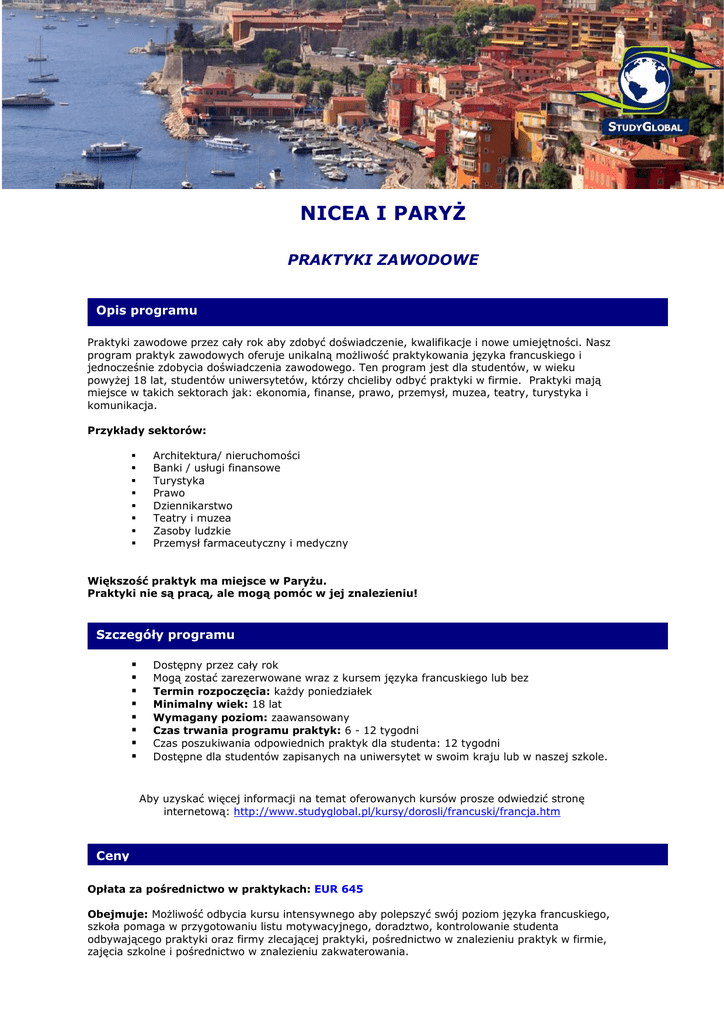 NICEA I PARYŻ PRAKTYKI ZAWODOWE Opis programu Praktyki zawodowe przez cały rok aby zdobyć doświadczenie, kwalifikacje i nowe umiejętności. Nasz program praktyk zawodowych oferuje unikalną możliwość praktykowania języka francuskiego i jednocześnie zdobycia doświadczenia zawodowego. Ten program jest dla studentów, w wieku powyżej 18 lat, studentów uniwersytetów, którzy chcieliby odbyć praktyki w firmie. Praktyki mają miejsce w takich sektorach jak: ekonomia, finanse, prawo, przemysł, muzea, teatry, turystyka i komunikacja. Przykłady sektorów: Architektura/ nieruchomości Banki / usługi finansowe Turystyka Prawo Dziennikarstwo Teatry i muzea Zasoby ludzkie Przemysł farmaceutyczny i medyczny Większość praktyk ma miejsce w Paryżu. Praktyki nie są pracą, ale mogą pomóc w jej znalezieniu! Szczegóły programu Dostępny przez cały rok Mogą zostać zarezerwowane wraz z kursem języka francuskiego lub bez Termin rozpoczęcia: każdy poniedziałek Minimalny wiek: 18 lat Wymagany poziom: zaawansowany Czas trwania programu praktyk: 6 - 12 tygodni Czas poszukiwania odpowiednich praktyk dla studenta: 12 tygodni Dostępne dla studentów zapisanych na uniwersytet w swoim kraju lub w naszej szkole. Aby uzyskać więcej informacji na temat oferowanych kursów prosze odwiedzić stronę internetową: http://www.studyglobal.pl/kursy/dorosli/francuski/francja.htm Ceny Opłata za pośrednictwo w praktykach: EUR 645 Obejmuje: Możliwość odbycia kursu intensywnego aby polepszyć swój poziom języka francuskiego, szkoła pomaga w przygotowaniu listu motywacyjnego, doradztwo, kontrolowanie studenta odbywającego praktyki oraz firmy zlecającej praktyki, pośrednictwo w znalezieniu praktyk w firmie, zajęcia szkolne i pośrednictwo w znalezieniu zakwaterowania. Nie obejmuje: zakwaterowanie, kurs języka francuskiego, opłata rejestracyjna, opłata rejestracyjna za zakwaterowanie, transfer z lotniska, ubezpieczenie w podróży, usługa ekspresowej poczty, etc. Aby uzyskać więcej informacji na temat cen, prosze odwiedzić stronę internetową: http://www.studyglobal.pl/kursy/dorosli/francuski/francja/paryz/france-langue-paris/ceny.htm Zakwaterowanie (opcjonalnie) Zakwaterowanie podczas trwania kursu i praktyk w Paryżu i Nicei: Rodzina goszcząca Mieszkanie/ rezydencja o o Aby uzyskać więcej informacji na temat zakwaterowania prosze odwiedzić naszą stronę: http://www.studyglobal.pl/kursy/dorosli/francuski/francja/paryz/france-langueparis/zakwaterowanie.htm Wiza Studenci są odpowiedzialni za uzyskanie informacji na temat obowiązków wizowych i przyjazd na miejsce z odpowiednią do tego programu wizą. Aby uzyskać więcej informacji na temat wizy, prosze odwiedzić stronę internetową: http://www.diplomatie.gouv.fr/en/france_159/enteringfrance_2045/index.html