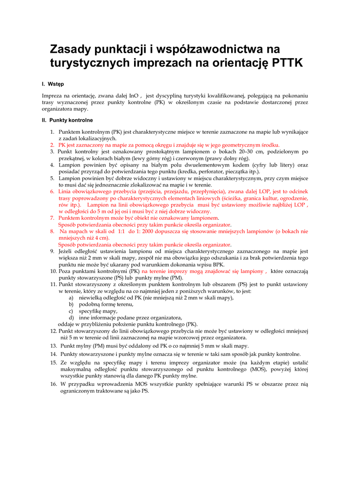 Zasady punktacji i współzawodnictwa na turystycznych imprezach na orientację PTTK I. Wstęp Impreza na orientację, zwana dalej InO , jest dyscypliną turystyki kwalifikowanej, polegającą na pokonaniu trasy wyznaczonej przez punkty kontrolne (PK) w określonym czasie na podstawie dostarczonej przez organizatora mapy. II. Punkty kontrolne 1. Punktem kontrolnym (PK) jest charakterystyczne miejsce w terenie zaznaczone na mapie lub wynikające z zadań lokalizacyjnych. 2. PK jest zaznaczony na mapie za pomocą okręgu i znajduje się w jego geometrycznym środku. 3. Punkt kontrolny jest oznakowany prostokątnym lampionem o bokach 20–30 cm, podzielonym po przekątnej, w kolorach białym (lewy górny róg) i czerwonym (prawy dolny róg). 4. Lampion powinien być opisany na białym polu dwuelementowym kodem (cyfry lub litery) oraz posiadać przyrząd do potwierdzania tego punktu (kredka, perforator, pieczątka itp.). 5. Lampion powinien być dobrze widoczny i ustawiony w miejscu charakterystycznym, przy czym miejsce to musi dać się jednoznacznie zlokalizować na mapie i w terenie. 6. Linia obowiązkowego przebycia (przejścia, przejazdu, przepłynięcia), zwana dalej LOP, jest to odcinek trasy poprowadzony po charakterystycznych elementach liniowych (ścieŜka, granica kultur, ogrodzenie, rów itp.). Lampion na linii obowiązkowego przebycia musi być ustawiony moŜliwie najbliŜej LOP , w odległości do 5 m od jej osi i musi być z niej dobrze widoczny. 7. Punktem kontrolnym moŜe być obiekt nie oznakowany lampionem. Sposób potwierdzania obecności przy takim punkcie określa organizator. 8. Na mapach w skali od 1:1 do 1: 2000 dopuszcza się stosowanie mniejszych lampionów (o bokach nie mniejszych niŜ 4 cm). Sposób potwierdzania obecności przy takim punkcie określa organizator. 9. JeŜeli odległość ustawienia lampionu od miejsca charakterystycznego zaznaczonego na mapie jest większa niŜ 2 mm w skali mapy, zespół nie ma obowiązku jego odszukania i za brak potwierdzenia tego punktu nie moŜe być ukarany pod warunkiem dokonania wpisu BPK. 10. Poza punktami kontrolnymi (PK) na terenie imprezy mogą znajdować się lampiony , które oznaczają punkty stowarzyszone (PS) lub punkty mylne (PM). 11. Punkt stowarzyszony z określonym punktem kontrolnym lub obszarem (PS) jest to punkt ustawiony w terenie, który ze względu na co najmniej jeden z poniŜszych warunków, to jest: a) niewielką odległość od PK (nie mniejszą niŜ 2 mm w skali mapy), b) podobną formę terenu, c) specyfikę mapy, d) inne informacje podane przez organizatora, oddaje w przybliŜeniu połoŜenie punktu kontrolnego (PK). 12. Punkt stowarzyszony do linii obowiązkowego przebycia nie moŜe być ustawiony w odległości mniejszej niŜ 5 m w terenie od linii zaznaczonej na mapie wzorcowej przez organizatora. 13. Punkt mylny (PM) musi być oddalony od PK o co najmniej 5 mm w skali mapy. 14. Punkty stowarzyszone i punkty mylne oznacza się w terenie w taki sam sposób jak punkty kontrolne. 15. Ze względu na specyfikę mapy i terenu imprezy organizator moŜe (na kaŜdym etapie) ustalić maksymalną odległość punktu stowarzyszonego od punktu kontrolnego (MOS), powyŜej której wszystkie punkty stanowią dla danego PK punkty mylne. 16. W przypadku wprowadzenia MOS wszystkie punkty spełniające warunki PS w obszarze przez nią ograniczonym traktowane są jako PS. III. Trasy Turystyczne imprezy na orientację przeprowadzane są na trasach z podziałem na: 1. stopień zaawansowania (bez względu na wiek) uczestnika: a) początkujący (TP), b) niezaawansowani (TT), c) średnio zaawansowani (TU), d) zaawansowani (TZ) 2. dyscypliny turystyczne: a) piesza, b) rowerowa (TR), c) kajakowa (TK), d) narciarska (TN), e) motorowa (TMot), f) inne 3. inne kryteria: a) rodzinna/familijna (TF), b) krajoznawcza (TKr), c) rekreacyjna (RK), d) turystyczno – rekreacyjna (TRInO) e) szkoleniowa (SZ), f) otwarta (TO), g) inne IV. Kategorie wiekowe Imprezy na orientację (decyduje rok urodzenia): mogą być przeprowadzane z podziałem na kategorie wiekowe a) dzieci do lat 13 (TD), b) młodzieŜ od 14 do 16 lat (TM), c) juniorzy od 17 do 20 lat (TJ), d) seniorzy od lat 21 (TS), e) weterani od lat 50 (TW). V. Czas przebycia i zalecana skala trudności trasy 1. 2. W turystycznych imprezach na orientację szybkość przebycia trasy nie jest punktowana. Czas przeznaczony przez organizatora na pokonanie trasy nazywa się limitem podstawowym i jest on ustalony tak, aby przeciętny uczestnik mógł przebyć całą trasę w tempie turystycznym: a) na pokonanie pieszo 1 km trasy na pełnej mapie, mierzonej w linii prostej między startem, poszczególnymi punktami kontrolnymi i metą, z uwzględnieniem linii obowiązkowego przebycia (LOP), z ominięciem przeszkód terenowych takich jak: rzeka, jezioro, teren zamknięty, przeznacza się dla poszczególnych tras i kategorii minimalną liczbę minut wg poniŜszej tabeli: Trasy krajoznawcza (TKr) rekreacyjna (RK) szkoleniowa (SZ) Kategorie Skala trudności bez ograniczeń mapa pełna Impreza dzienna Impreza nocna zastosowanie limitu do decyzji organizatora początkujący (TP) dzieci (TD) rodzinna/familijna (TF) młodzieŜ (TM) niezaawansowani (TT) juniorzy (TJ) średnio zaawansowani (TU) seniorzy (TS) zaawansowani (TZ) co najmniej 90% PK w planie mapy 27,5 min 32,5 min co najmniej 75% PK w planie mapy 25 min 30 min co najmniej 50% PK w planie mapy 22,5 min 27,5 min co najmniej 30% PK w planie mapy 20 min 25 min b) za zgodą organizatora istnieje moŜliwość startu na trasie z klasyfikacją w wyŜszej kategorii wiekowej, c) etapy dzienne muszą rozpoczynać się najwcześniej o wschodzie słońca, a kończyć najpóźniej o zachodzie słońca, z uwzględnieniem limitów spóźnień, d) etapy nocne muszą rozpoczynać się nie wcześniej niŜ 1 godzinę po zachodzie słońca i kończyć nie później niŜ 1 godzinę przed wschodem słońca, z uwzględnieniem limitów spóźnień, e) ze względ