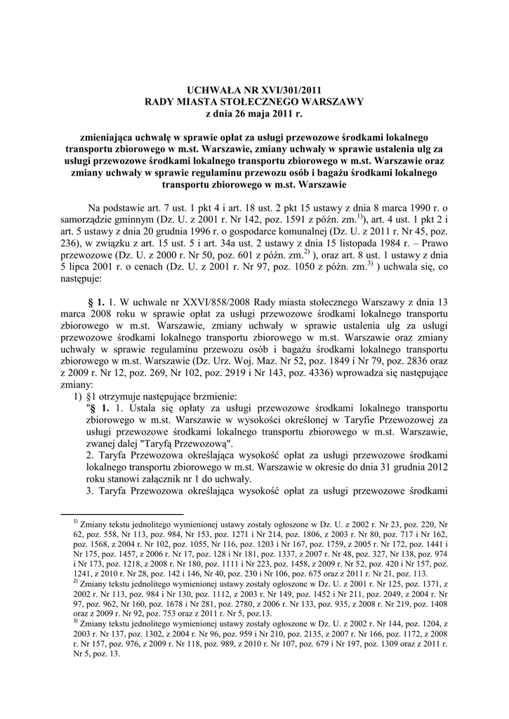 UCHWAŁA NR XVI/301/2011 RADY MIASTA STOŁECZNEGO WARSZAWY z dnia 26 maja 2011 r. zmieniająca uchwałę w sprawie opłat za usługi przewozowe środkami lokalnego transportu zbiorowego w m.st. Warszawie, zmiany uchwały w sprawie ustalenia ulg za usługi przewozowe środkami lokalnego transportu zbiorowego w m.st. Warszawie oraz zmiany uchwały w sprawie regulaminu przewozu osób i bagażu środkami lokalnego transportu zbiorowego w m.st. Warszawie Na podstawie art. 7 ust. 1 pkt 4 i art. 18 ust. 2 pkt 15 ustawy z dnia 8 marca 1990 r. o samorządzie gminnym (Dz. U. z 2001 r. Nr 142, poz. 1591 z późn. zm.1)), art. 4 ust. 1 pkt 2 i art. 5 ustawy z dnia 20 grudnia 1996 r. o gospodarce komunalnej (Dz. U. z 2011 r. Nr 45, poz. 236), w związku z art. 15 ust. 5 i art. 34a ust. 2 ustawy z dnia 15 listopada 1984 r. – Prawo przewozowe (Dz. U. z 2000 r. Nr 50, poz. 601 z późn. zm.2) ), oraz art. 8 ust. 1 ustawy z dnia 5 lipca 2001 r. o cenach (Dz. U. z 2001 r. Nr 97, poz. 1050 z późn. zm.3) ) uchwala się, co następuje: § 1. 1. W uchwale nr XXVI/858/2008 Rady miasta stołecznego Warszawy z dnia 13 marca 2008 roku w sprawie opłat za usługi przewozowe środkami lokalnego transportu zbiorowego w m.st. Warszawie, zmiany uchwały w sprawie ustalenia ulg za usługi przewozowe środkami lokalnego transportu zbiorowego w m.st. Warszawie oraz zmiany uchwały w sprawie regulaminu przewozu osób i bagażu środkami lokalnego transportu zbiorowego w m.st. Warszawie (Dz. Urz. Woj. Maz. Nr 52, poz. 1849 i Nr 79, poz. 2836 oraz z 2009 r. Nr 12, poz. 269, Nr 102, poz. 2919 i Nr 143, poz. 4336) wprowadza się następujące zmiany: 1) §1 otrzymuje następujące brzmienie: "§ 1. 1. Ustala się opłaty za usługi przewozowe środkami lokalnego transportu zbiorowego w m.st. Warszawie w wysokości określonej w Taryfie Przewozowej za usługi przewozowe środkami lokalnego transportu zbiorowego w m.st. Warszawie, zwanej dalej "Taryfą Przewozową". 2. Taryfa Przewozowa określająca wysokość opłat za usługi przewozowe środkami lokalnego transportu zbiorowego w m.st. Warszawie w okresie do dnia 31 grudnia 2012 roku stanowi załącznik nr 1 do uchwały. 3. Taryfa Przewozowa określająca wysokość opłat za usługi przewozowe środkami 1) Zmiany tekstu jednolitego wymienionej ustawy zostały ogłoszone w Dz. U. z 2002 r. Nr 23, poz. 220, Nr 62, poz. 558, Nr 113, poz. 984, Nr 153, poz. 1271 i Nr 214, poz. 1806, z 2003 r. Nr 80, poz. 717 i Nr 162, poz. 1568, z 2004 r. Nr 102, poz. 1055, Nr 116, poz. 1203 i Nr 167, poz. 1759, z 2005 r. Nr 172, poz. 1441 i Nr 175, poz. 1457, z 2006 r. Nr 17, poz. 128 i Nr 181, poz. 1337, z 2007 r. Nr 48, poz. 327, Nr 138, poz. 974 i Nr 173, poz. 1218, z 2008 r. Nr 180, poz. 1111 i Nr 223, poz. 1458, z 2009 r. Nr 52, poz. 420 i Nr 157, poz. 1241, z 2010 r. Nr 28, poz. 142 i 146, Nr 40, poz. 230 i Nr 106, poz. 675 oraz z 2011 r. Nr 21, poz. 113. 2) Zmiany tekstu jednolitego wymienionej ustawy zostały ogłoszone w Dz. U. z 2001 r. Nr 125, poz. 1371, z 2002 r. Nr 113, poz. 984 i Nr 130, poz. 1112, z 2003 r. Nr 149, poz. 1452 i Nr 211, poz. 2049, z 2004 r. Nr 97, poz. 962, Nr 160, poz. 1678 i Nr 281, poz. 2780, z 2006 r. Nr 133, poz. 935, z 2008 r. Nr 219, poz. 1408 oraz z 2009 r. Nr 92, poz. 753 oraz z 2011 r. Nr 5, poz.13. 3) Zmiany tekstu jednolitego wymienionej ustawy zostały ogłoszone w Dz. U. z 2002 r. Nr 144, poz. 1204, z 2003 r. Nr 137, poz. 1302, z 2004 r. Nr 96, poz. 959 i Nr 210, poz. 2135, z 2007 r. Nr 166, poz. 1172, z 2008 r. Nr 157, poz. 976, z 2009 r. Nr 118, poz. 989, z 2010 r. Nr 107, poz. 679 i Nr 197, poz. 1309 oraz z 2011 r. Nr 5, poz. 13. lokalnego transportu zbiorowego w m.st. Warszawie w okresie od dnia 1 stycznia 2013 roku do dnia 31 grudnia 2013 roku stanowi załącznik nr 2 do uchwały. 4. Taryfa Przewozowa określająca wysokość opłat za usługi przewozowe środkami lokalnego transportu zbiorowego w m.st. Warszawie w okresie od dnia 1 stycznia 2014 roku stanowi załącznik nr 3 do uchwały. 5. Do stref, o których mowa w Taryfie Przewozowej mają zastosowanie odpowiednio przepisy uchwały nr VI/106/2011 Rady miasta stołecznego Warszawy z dnia 13 stycznia 2011 r. w sprawie ustalenia granic strefy biletowej 1. (Dz. Urz. Woj. Maz. Nr 13, poz. 477)."; 2) Uchyla się załącznik do uchwały. § 2. Załączniki o numerach 1-3, o których mowa w §1ust. 2-4 uchwały zmienianej w §1 w brzmieniu nadanym niniejszą uchwałą stanowią załączniki o numerach odpowiednio 1-3 do niniejszej uchwały. § 3. Wykonanie uchwały powierza się Prezydentowi m.st. Warszawy. § 4. Uchwała podlega ogłoszeniu w Dzienniku Urzędowym Województwa Mazowieckiego i wchodzi w życie z dniem 16 sierpnia 2011 r. Przewodnicząca Rady m. st. Warszawy Ewa Malinowska-Grupińska Załącznik nr 1 do uchwały nr XVI/301/2011 Rady Miasta Stołecznego Warszawy z dnia 26 maja 2011 r. TARYFA PRZEWOZOWA określająca wysokość opłat za usługi przewozowe środkami lokalnego transportu zbiorowego w m.st. Warszawie obowiązująca do dnia 31 grudnia 2012 roku Tytuł I Rodzaje biletów i opłat (w zł) BILETY OBOWIĄZUJĄCE WYŁĄCZNIE W STREFIE 1 50% I. Bilety jednorazowe / na okaziciela / 1. Bilet jednorazowy uprawniający do przejazdu jednym środkiem transportu od momentu skasowania, nie dłużej jednak niż przez 120 min. NORMALNY 3,60 1,80 1. Bilet dobowy uprawniający do nieograniczonej liczby przejazdów w ciągu 24 h od momentu skasowania 12,00 6,00 2. Bilet 3-dniowy uprawniający do nieograniczonej liczby przejazdów od momentu skasowania do godziny 23.59 trzeciego dnia terminu ważności 24,00 12,00 1. Bilet 30-dniowy imienny uprawniający do nieograniczonej liczby przejazdów od momentu skasowania do godziny 23.59 trzydziestego dnia terminu ważności 90,00 45,00 2. Bilet 90-dniowy imienny uprawniający do nieograniczonej liczby przejazdów od momentu skasowania do godziny 23.59 dziewięćdziesiątego dnia terminu ważności 220,00 110,00 II. Bilety krótkookresowe / na ok