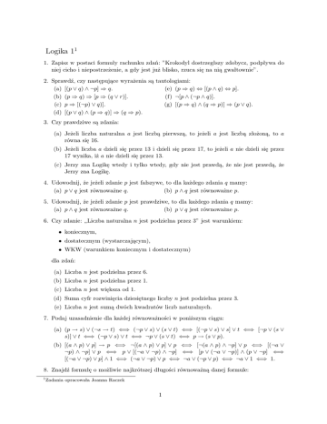Logika 11 1. Zapisz w postaci formuły rachunku zdań: ”Krokodyl dostrzegłszy zdobycz, podpływa do niej cicho i niepostrzeżenie, a gdy jest już blisko, rzuca się na nią gwałtownie”. 2. Sprawdź, czy następujące wyrażenia są tautologiami: (a) [(p ∨ q) ∧ ¬p] ⇒ q. (e) (p ⇒ q) ⇔ [(p ∧ q) ⇔ p]. (b) (p ⇒ q) ⇒ [p ⇒ (q ∨ r)]. (f) ¬[p ∧ (¬p ∧ q)]. (c) p ⇒ [(¬p) ∨ q)]. (g) [(p ⇒ q) ∧ (q ⇒ p)] ⇒ (p ∨ q). (d) [(p ∨ q) ∧ (p ⇒ q)] ⇒ (q ⇒ p). 3. Czy prawdziwe są zdania: (a) Jeżeli liczba naturalna a jest liczbą pierwszą, to jeżeli a jest liczbą złożoną, to a równa się 16. (b) Jeżeli liczba a dzieli się przez 13 i dzieli się przez 17, to jeżeli a nie dzieli się przez 17 wynika, iż a nie dzieli się przez 13. (c) Jerzy zna Logikę wtedy i tylko wtedy, gdy nie jest prawdą, że nie jest prawdą, że Jerzy zna Logikę. 4. Udowodnij, że jeżeli zdanie p jest fałszywe, to dla każdego zdania q mamy: (a) p ∨ q jest równoważne q. (b) p ∧ q jest równoważne p. 5. Udowodnij, że jeżeli zdanie p jest prawdziwe, to dla każdego zdania q mamy: (a) p ∧ q jest równoważne q. (b) p ∨ q jest równoważne p. 6. Czy zdanie: „Liczba naturalna n jest podzielna przez 3” jest warunkiem: • koniecznym, • dostatecznym (wystarczającym), • WKW (warunkiem koniecznym i dostatecznym) dla zdań: (a) Liczba n jest podzielna przez 6. (b) Liczba n jest podzielna przez 1. (c) Liczba n jest większa od 1. (d) Suma cyfr rozwinięcia dziesiętnego liczby n jest podzielna przez 3. (e) Liczba n jest sumą dwóch kwadratów liczb naturalnych. 7. Podaj uzasadnienie dla każdej równoważności w poniższym ciągu: (a) (p → s) ∨ (¬s → t) ⇐⇒ (¬p ∨ s) ∨ (s ∨ t) ⇐⇒ [(¬p ∨ s) ∨ s] ∨ t ⇐⇒ [¬p ∨ (s ∨ s)] ∨ t ⇐⇒ (¬p ∨ s) ∨ t ⇐⇒ ¬p ∨ (s ∨ t) ⇐⇒ p → (s ∨ p). (b) [(a ∧ p) ∨ p] → p ⇐⇒ ¬[(a ∧ p) ∨ p] ∨ p ⇐⇒ [¬(a ∧ p) ∧ ¬p] ∨ p ⇐⇒ [(¬a ∨ ¬p) ∧ ¬p] ∨ p ⇐⇒ p ∨ [(¬a ∨ ¬p) ∧ ¬p] ⇐⇒ [p ∨ (¬a ∨ ¬p)] ∧ (p ∨ ¬p] ⇐⇒ [(¬a ∨ ¬p) ∨ p] ∧ 1 ⇐⇒ (¬a ∨ ¬p) ∨ p ⇐⇒ ¬a ∨ (¬p ∨ p) ⇐⇒ ¬a ∨ 1 ⇐⇒ 1. 8. Znajdź formułę o możliwie najkrótszej długości równoważną danej formule: 1 Zadania opracowała Joanna Raczek 1 (a) (p ∧ q ∧ s) ∨ (p ∧ ¬q ∧ ¬r) ∨ (p ∧ q ∧ ¬s) ∨ ¬(p ∧ r ⇒ q); (b) ¬p ⇒ ¬¬q; 9. Znajdź kontrprzykłady na następujące stwierdzenia: (a) 2n − 1 jest liczbą pierwszą dla każdego n 2. (b) 2n + 3n jest liczbą pierwszą dla każdego n ∈ N. (c) (x + 1)2 x2 dla każdego x ∈ R. (d) 2n + n jest liczbą pierwszą dla każdej nieparzystej dodatniej liczby n. 10. Podaj zdanie odwrotne i przeciwstawne dla (a) Jeśli x + y 1, to x2 + y 2 1. (d) (b) Jeśli 10 + 3 = 30, to 3 + 5 = 8. (e) 2 (c) Jeśli x > 0, to x > 0. (f) każdego ze zdań. Określ ich prawdziwość. x2 = 1 ⇒ x = ±1. ab = 0 ⇒ a = 0 ∨ b = 0. 4ABC jest prostokštny ⇒ a2 + b2 = c2 . 11. Dane jest zdanie: „Trójmian kwadratowy nie posiada pierwiastków, jeśli jego wyróżnik nie jest nieujemny”. Zbuduj zdanie odwrotne, przeciwstawne oraz zdanie odwrotne do przeciwstawnego. Określ ich prawdziwość. 12. Określ wartość logiczną zdań: (a) jeśli 2 + 2 = 4, to 2 + 4 = 8; (b) jeśli 2 + 2 = 4, to 2 + 4 = 6; (c) jeśli 2 + 2 = 5, to 2 + 4 = 8; (d) jeśli 2 + 2 = 5, to 2 + 4 = 6. 13. Załóżmy, że ktoś stwierdza: ”kocham Barbarę lub Joannę óraz ”jeśli kocham Barbarę, to kocham Joannę”. Czy z tego wynika, że kocha Joannę? 14. Przeanalizuj następujące zdania i odpowiedz, czy Jan jest, czy nie jest piosenkarzem rockowym: (a) ”Jan jest nauczycielem”; (b) nie jest prawdą, że ”Jan jest nauczycielem”i ”Jan jest bogaty”; (c) jeśli Jan jest piosenkarzem rockowym, to Jan jest bogaty”. 15. Wykazać metodą ńie wprost”, że następujace zdania są tautologiami: (a) [(α ∧ β) ⇒ γ] ⇒ [α ⇒ (β ⇒ γ)]; (b) [(p ⇒ q) ∧ (q ⇒ r)] ⇒ (p ⇒ r); (c) (p ∨ p) ⇒ p; (d) (p ∧ p) ⇔ p. 16. Udowodnij każde z następujących stwierdzeń lub wykaż, że jest ono nieprawdziwe. (a) Iloczyn dwóch liczb parzystych jest liczbą podzielną przez 4. (b) Suma dwóch liczb nieparzystych jest liczbą nieparzystą. (c) Suma dwóch liczb pierwszych nigdy nie jest liczbą pierwszą. (d) Suma trzech kolejnych liczb całkowitych jest podzielna przez 3. 2 (e) Suma czterech kolejnych liczb całkowitych jest podzielna przez 4. (f) Jeżeli a jest parzystą liczbą całkowitą to 12 a jest liczbą parzystą. (g) Dla każdej liczby rzeczywistej x istnieje liczna rzeczywista y taka, że xy = 1. (h) Liczba całkowita n jest parzysta wtedy i tylko wtedy, gdy n2 jest parzysta. 17. Kreska Sheffera (NAND) jest to spójnik | zdefiniowany następująco: p 0 0 1 1 q 0 1 0 1 p|q 1 1 1 0 Zatem p|q ⇐⇒ ¬(p∧q). Wszystkie zdania złożone są równoważne ze zdaniami, w których występuje tylko spójnik |. (a) Pokaż, że ¬p ⇐⇒ p|p. (b) Znajdź zdanie równoważne zdaniu p ∧ q, w którym występuje tylko |. (c) Zrób to zamo ze zdaniem p ⇒ q. 18. Rozważmy założenia: Jeśli pojadę autobusem lub metrem to spóźnię się na spotkanie. Jeśli pojadę taksówką, to nie spóźnię się na spotkanie, ale zbankrutuję. Nie spóźnię się na spotkanie. Które z poniższych wniosków mogą być wyprowadzone z założeń? Odpowiedź uzasadnij. (a) Pojadę taksówką. (d) Jeśli zbankrutowałem, to pojechałem metrem. (b) Zbankrutuję. (e) Jeśli pojadę autobusem, to nie zbankrutuję. (c) Nie pojadę metrem. 19. Znajdz wykresy funkcji zdaniowych, jeżeli x, y ∈ R: (a) x = 2y; (d) ∼ (x + y = 1 ∨ x 6= y); 1 (b) |x| > 2 y; (e) x − 12 ⇒ |x| + |y| ¬ 1. (c) x + y = 0 ∨ x 4y + 1; (f) x + y 0 ⇒ x2 − y = 3. 20. Korzystając z praw arytmetyki liczb rzeczywistych oraz rachunku zdań znajdź rozwiązanie nierówności: 2 2 −16 (a) xx2 −4 (b) xx2 −x+2 < 
