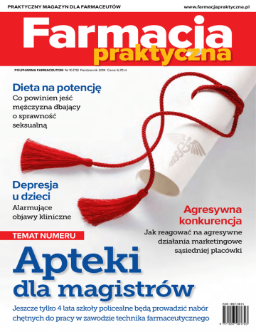 PRAKTYCZNY MAGAZYN DLA FARMACEUTÓW www.farmacjapraktyczna.pl Farmacja praktyczna POLPHARMA FARMACEUTOM Nr 10 (79) Październik 2014 Cena: 6,70 zł Dieta na potencję Co powinien jeść mężczyzna dbający o sprawność seksualną Depresja u dzieci Alarmujące objawy kliniczne temat numeru Apteki Agresywna konkurencja Jak reagować na agresywne działania marketingowe sąsiedniej placówki dla magistrów Jeszcze tylko 4 lata szkoły policealne będą prowadzić nabór chętnych do pracy w zawodzie technika farmaceutycznego spis treści Aktualności 4wielkie święto aptekarzy 6Informacje/ciekawostki 12 RAPORT: Apteki dla Szanowni Państwo! mgr farm. Barbara Misiewicz-Jagielak Redaktor Merytoryczna „Farmacji Praktycznej” magistrów 14Sonda: technik w aptece Rok szkolny 2018/2019 będzie ostatnim, w którym odbędzie się nabór do 2-letnich szkół policealnych kształcących techników farmaceutycznych. Osoby, które wcześniej rozpoczną naukę, będą mogły ją dokończyć, a technicy, którzy zdobyli lub zdobędą w tym czasie kwalifikacje do wykonywania zawodu, nadal będą mogli pracować w swojej profesji. Decyzję w tej sprawie podjęło Ministerstwo Edukacji Narodowej, czyli organ nadzorujący edukację techników, zaś wnioskodawcą zmian był resort zdrowia, który sprawuje pieczę nad magisterskimi studiami farmaceutycznymi. W tych staraniach ministerstwo wspierali przedstawiciele wydziałów farmaceutycznych, Polskie Towarzystwo Farmaceutyczne oraz Naczelna Izba Aptekarska, która od lat forsowała takie rozwiązanie. Sprawie tej poświęcamy październikowy raport i sondę – znajdą w nich Państwo szereg sądów i statystyk, które stały się koronnymi argumentami w dyskusji między przeciwnikami i zwolennikami zawodu technika farmaceutycznego. Zapraszamy do komentowania naszych artykułów – zarówno na stronie internetowej naszego magazynu, jak i na facebookowym fanpage’u „Farmacji Praktycznej”. 30 Jak utrzymać płynność finansową w aptece? REKLAMA Utrzymywanie lub utrata płynności finansowej to kluczowe elementy do oceny sytuacji każdej firmy, ale i komfort lub dyskomfort pracy – zarówno menedżera/kierownika jak i całego zespołu Farmacja Praktyczna® Redaktor Merytoryczna: Barbara Misiewicz-Jagielak Redaguje Zespół: Dominika Bandurska, Dagmara Bąk, Michał Borysiuk, Anna Cielemęcka, Marta Gawrylik, Justyna Grudniak, Monika Jasłowska, Magdalena Kochańska, Marcin Lewandowski, Barbara Misiewicz-Jagielak, Joanna Ordańska-Kucińska, Paulina Pol, Bożenna Płatos, Anna Robak-Reczek, Patryk Starak, Wiktor Zajchowski. – za czy przeciw? Prawo 16rozporządzenie w sprawie recept 19zapytaj eksperta Op ieka farmaceutyczna 22dieta na potencję 24podrażnienie gardła i krtani u dzieci 26zawodowe płaskostopie 28psychologia: jak budować wizerunek doradcy, a nie sprzedawcy? Prowadzenie apteki 30jak utrzymać płynność finansową w aptece? 32agresywna konkurencja Nauka 36depresja u dzieci Życie jest piękne 40pewna siebie Z pirolam szampon 42Zielnik apteczny 44z życia farmaceuty 46kuchnia farmaceutyczna 48k ultura 49rozmowa z tomaszem kotem, odtwórcą roli prof. zbigniewa religi w filmie „bogowie” 50krzyżówka Na zlecenie: Polpharma Biuro Handlowe Sp. z o.o., ul. Bobrowiecka 6, 00-728 Warszawa Wydawca: Valkea Media SA, ul. Elbląska 15/17, 01-747 Warszawa Redaktor naczelny: Łukasz Kuźmiński Dyrektor projektu: Tomasz Opiela Projekt graficzny: Krzysztof Pietrasik farmacja praktyczna 10/2014 3 informacje Wielkie święto aptekarzy Atmosferę tegorocznych obchodów Ogólnopolskiego Dnia Aptekarza przepełniła moc serdeczności, życzeń i gorących podziękowań kierowanych pod adresem całej farmaceutycznej braci. relacja: Łukasz Kuźmiński red. nacz. „Farmacji Praktycznej” W tym roku centralne uroczystości upamiętniające Świętych Kosmę i Damiana – duchowych patronów farmaceutów, zorganizowano 24 września br. w Sali Kameralnej Filharmonii Narodowej w Warszawie. Na obchody Ogólnopolskiego Dnia Aptekarza tłumnie zjechali przedstawiciele terenowych oddziałów samorządu aptekarskiego. Oficjalne w swym tonie święto przybrało jak zawsze niezwykle miły, towarzyski charakter. Spotkaniom z niewidzianymi od dawna przyjaciółmi i kolegami po fachu towarzyszyły radość i wzruszenie. Tuż po wejściu do Filharmonii przybyłych gości witała miła niespodzianka. Sponsor główny uroczystości, Grupa Polpharma – producent leku Acard (acidum acetylsalicylicum) i inicjator kampanii „Ciśnienie na życie”, Na zdjęciu (od lewej): Eugeniusz Jarosik – Rzecznik Prasowy NIA, dr n. farm. Grzegorz Kucharewicz – Prezes NRA, mgr farm. Barbara Misiewicz-Jagielak – Redaktor Merytoryczna „Farmacji Praktycznej” oraz dr n. farm. Marek Jędrzejczak – Wiceprezes NRA postanowił zadbać o zdrowie świętujących farmaceutów. Przy stoiskach oznaczonych logiem kampanii można było zmierzyć ciśnienie tętnicze oraz zbadać wiek serca. Chętnych do skorzystania z badań nie brakowało. Oficjalną część uroczystości rozpoczął dr n. farm. Grzegorz Kucharewicz, Prezes Naczelnej Rady Aptekarskiej, witając przybyłych do gmachu Filharmonii przedsta- Jak co roku aptekarze odebrali z rąk Prezesa NRA nagrody państwowe i samorządowe 4 farmacja praktyczna 10/2014 www.farmacjapraktyczna.pl informacje fot. arch. NIA / Tomasz Baj / Izabela Podolec Wykład na temat patriotyzmu gospodarczego wygłosił Marcin Smoliński, Dyrektor ds. Sprzedaży i Dystrybucji oraz Działu Sprzedaży Aptecznej, Marketingu Handlowego, Mass Market i Telemarketingu Polpharmy wicieli samorządu aptekarskiego, sejmu, resortu zdrowia, Naczelnej Izby Lekarskiej, Polskiego Towarzystwa Farmaceutycznego, towarzystw medycznych i przemysłu farmaceutycznego. W swoim wystąpieniu dr Kucharewicz zwrócił uwagę na pogarszającą się sytuację aptekarzy, a polski rynek apteczny określił jako wyspę skończonych szans i nadziei. Zaznaczył, że w sytuacji siln