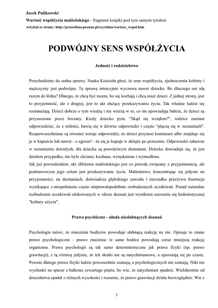 Jacek Pulikowski Wartość współżycia małżeńskiego - fragment książki pod tym samym tytułem Artykuł ze strony: http://jerozolima.poznan.pl/czytelnia/wartosc_wspol.htm PODWÓJNY SENS WSPÓŁŻYCIA Jedność i rodzicielstwo Przechodzimy do sedna sprawy. Nauka Kościoła głosi, że sens współżycia, zjednoczenia kobiety i mężczyzny jest podwójny. Tę sprawę intuicyjnie wyczuwa nawet dziecko. Bo dlaczego oni idą razem do łóżka? Dlatego, że chcą być razem, bo się kochają i chcą mieć dzieci. Z jednej strony, jest to przyjemność, ale z drugiej, jest to akt służący przekazywaniu życia. Tak właśnie ludzie się rozmnażają. Dzieci dobrze o tym wiedzą i nie wierzą w to, co im opowiadają babcie, że dzieci są przynoszone przez bociany. Kiedy dziecko pyta: "Skąd się wziąłem?", rodzice zamiast odpowiedzieć, że z miłości, bawią się w dziwne odpowiedzi i często "plączą się w zeznaniach". Rozpowszechniane są również wersje odpowiedzi, że dzieci przynosi kominiarz albo znajduje się je w kapuście lub nawet - o zgrozo! - że się je kupuje w sklepie po przecenie. Odpowiedzi zabawne w rozumieniu dorosłych, dla dziecka są prawdziwym dramatem. Dziecko dowiaduje się, że jest dziełem przypadku, nie było chciane, kochane, wytęsknione i wymodlone. Jak już powiedziałem, akt zbliżenia małżeńskiego jest co prawda związany z przyjemnością, ale podstawowym jego celem jest przekazywanie życia. Małżeństwo, koncentrując się jedynie na przyjemności, na doznaniach, doświadcza głębokiego zawodu i nierzadko przeżywa frustracje wynikające z niespełnienia często nieprawdopodobnie rozbudzonych oczekiwań. Ponad naturalne rozbudzenie oczekiwań ulokowanych w sferze doznań jest wynikiem szerzenia się hedonistycznej "kultury użycia". Prawa psychiczne - ułuda niesłabnących doznań Psychologia mówi, że mnożenie bodźców powoduje słabnącą reakcję na nie. Opisuje to znane prawo psychologiczne - prawo znużenia: te same bodźce powodują coraz mniejszą reakcję organizmu. Prawa psychologii są tak samo deterministyczne jak prawa fizyki (np. prawo grawitacji), z tą różnicą jedynie, że ich skutki nie są natychmiastowe, a ujawniają się po czasie. Pewnie dlatego prawa fizyki ludzie powszechnie szanują, a psychologicznych nie szanują. Nikt nie wychodzi na spacer z balkonu czwartego piętra, bo wie, że natychmiast spadnie. Wielokrotnie od dzieciństwa spadał z różnych wysokości i rozumie, że prawo grawitacji działa bezwzględnie. Wie z 1 doświadczenia, że im wyższa wysokość, z której się spada, tym groźniejsze i boleśniejsze mogą być skutki upadku. Poznał to na własnej skórze. Zauważmy, że obiektywne prawa działają niezależnie od tego, czy ktoś zna wzory je opisujące, czy też nie ma o nich zielonego pojęcia. Wróćmy jednak do prawa znużenia i zażywanych przyjemności seksualnych. Jeżeli nie pojawi się nowa jakość przeżycia, wynikająca z głębi więzi osobowej małżonków, to sama przyjemność będzie nieuchronnie malała. W efekcie przyjemność dość szybko się skończy. Para, nie spodziewając się tego, przeżywa zawód, a nawet dramat. Nie to obiecywała im poprzez media nachalna reklama seksu! Niestety, mimo poczucia, że są oszukani, ludzie szukają dalszej pomocy u oszusta. Kultura (czy raczej "kultura") życzliwie podpowiada: "Chcąc podtrzymać doznania, trzeba poszukać nowych, świeżych bodźców, pobudzeń: 365 pozycji na 365 dni w roku!" Ja złośliwie pytam autorów tych pomysłów: "A co z rokiem przestępnym? Nuda?!" Oczywiście, by uniknąć niepożądanych skutków niefrasobliwych zabaw seksualnych, mamy szeroką ofertę nowoczesnego przemysłu antykoncepcyjnego, a gdy ten zawiedzie - aborcyjnego. Nie koniec na tym. Tworzy się całe podręczniki pobudzania (stymulowania - jak się to obecnie określa). Nie dziwią w tym kontekście rady "autorytetów", że jeżeli z żoną jest nieciekawie, to trzeba zmienić... żonę. Ileż razy pomagałem leczyć rany małżeństwom, którym "postępowy" psycholog zalecał zmianę "partnera" jako sposób na rozwiązanie problemów w dziedzinie współżycia. Osobiście słyszałem w radio, jak pani psycholog, odpowiadając na pytanie słuchaczki, mówiła: "Jeżeli kobieta żyjąca w małżeństwie poznała mężczyznę swego życia, odnalazła prawdziwą miłość, to nieuczciwością byłoby, gdyby nie posłuchała głosu serca i nie poszła za nim. Pozostawienie męża i dzieci jest wówczas koniecznością podyktowaną uczciwością wobec siebie samej". Pozostawię bez komentarza tę wypowiedź. Jeżeli nie pomoże zmiana partnera, to podpowiada się "zabawy zbiorowe". Gdzieś po drodze jest oczywiście pornografia, często ukrywana pod nazwą "erotyka", "sex shopy", tzw. agencje towarzyskie (dawniej mówiło się po prostu burdele). Jeśli to wszystko okaże się nieskuteczne, to może by trzeba spróbować w ramach tej samej płci? "Przecież to żadne zboczenie, to tylko taka inność". W ramach specjalnych atrakcji wykorzystuje się seksualnie nawet kilkuletnie dzieci (pedofilia), zwierzęta (zoofilia) czy zwłoki (nekrofilia). Nawet tak ordynarnych i odpychających zachowań nowoczesny, tolerancyjny (nie zaściankowy) seksuolog nie pozwoli nazwać zboczeniem i w najlepszym razie użyje niewiele mówiącego ogółowi słowa "parafilia". Po polsku brzmiałoby to równie niewinnie - jako "umiłowanie inności". Przepraszam normalnych ludzi, w których powyższe zdania wywołały niesmak (zapewniam, że i pisanie ich nie było przyjemnością), lecz nie był to mój wymysł, a jedynie relacja z szeroko dostępnej "oferty" obecnej we współczesnej kulturze masowej. Ona zaś nie stawia pytania o ważność i miejsce doznań seksualnych w szczęściu osobistym i w relacji osób. Zakłada jako aksjomat, że przyjemność w ogóle, a seksualna w szczególności, jest czymś najważniejszym w życiu. Uznaje ją za wartość sam