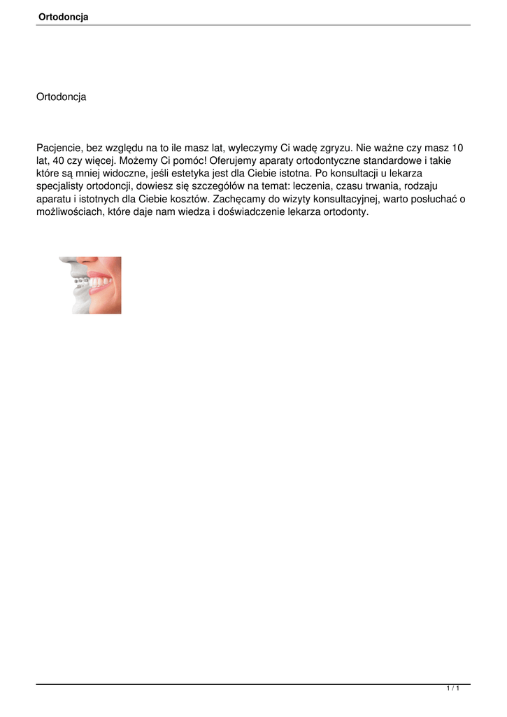 Ortodoncja Ortodoncja Pacjencie, bez względu na to ile masz lat, wyleczymy Ci wadę zgryzu. Nie ważne czy masz 10 lat, 40 czy więcej. Możemy Ci pomóc! Oferujemy aparaty ortodontyczne standardowe i takie które są mniej widoczne, jeśli estetyka jest dla Ciebie istotna. Po konsultacji u lekarza specjalisty ortodoncji, dowiesz się szczegółów na temat: leczenia, czasu trwania, rodzaju aparatu i istotnych dla Ciebie kosztów. Zachęcamy do wizyty konsultacyjnej, warto posłuchać o możliwościach, które daje nam wiedza i doświadczenie lekarza ortodonty. 1/1