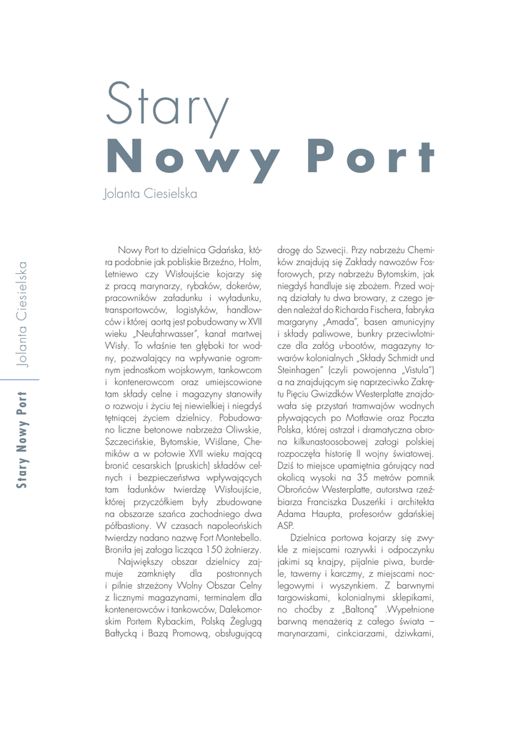Stary Nowy Port Jolanta Ciesielska S tary N o wy Po rt Jolanta Ciesielska Nowy Port to dzielnica Gdańska, która podobnie jak pobliskie Brzeźno, Holm, Letniewo czy Wisłoujście kojarzy się z pracą marynarzy, rybaków, dokerów, pracowników załadunku i wyładunku, transportowców, logistyków, handlowców i której aortą jest pobudowany w XVII wieku „Neufahrwasser”, kanał martwej Wisły. To właśnie ten głęboki tor wodny, pozwalający na wpływanie ogromnym jednostkom wojskowym, tankowcom i kontenerowcom oraz umiejscowione tam składy celne i magazyny stanowiły o rozwoju i życiu tej niewielkiej i niegdyś tętniącej życiem dzielnicy. Pobudowano liczne betonowe nabrzeża Oliwskie, Szczecińskie, Bytomskie, Wiślane, Chemików a w połowie XVII wieku mającą bronić cesarskich (pruskich) składów celnych i bezpieczeństwa wpływających tam ładunków twierdzę Wisłoujście, której przyczółkiem były zbudowane na obszarze szańca zachodniego dwa półbastiony. W czasach napoleońskich twierdzy nadano nazwę Fort Montebello. Broniła jej załoga licząca 150 żołnierzy. Największy obszar dzielnicy zajmuje zamknięty dla postronnych i pilnie strzeżony Wolny Obszar Celny z licznymi magazynami, terminalem dla kontenerowców i tankowców, Dalekomorskim Portem Rybackim, Polską Żeglugą Bałtycką i Bazą Promową, obsługującą 14 Three dreams Witosław Czerwonka I Tr z y s n y drogę do Szwecji. Przy nabrzeżu Chemików znajdują się Zakłady nawozów Fosforowych, przy nabrzeżu Bytomskim, jak niegdyś handluje się zbożem. Przed wojną działały tu dwa browary, z czego jeden należał do Richarda Fischera, fabryka margaryny „Amada”, basen amunicyjny i składy paliwowe, bunkry przeciwlotnicze dla załóg u-bootów, magazyny towarów kolonialnych „Składy Schmidt und Steinhagen” (czyli powojenna „Vistula”) a na znajdującym się naprzeciwko Zakrętu Pięciu Gwizdków Westerplatte znajdowała się przystań tramwajów wodnych pływających po Motławie oraz Poczta Polska, której ostrzał i dramatyczna obrona kilkunastoosobowej załogi polskiej rozpoczęła historię II wojny światowej. Dziś to miejsce upamiętnia górujący nad okolicą wysoki na 35 metrów pomnik Obrońców Westerplatte, autorstwa rzeźbiarza Franciszka Duszeńki i architekta Adama Haupta, profesorów gdańskiej ASP. Dzielnica portowa kojarzy się zwykle z miejscami rozrywki i odpoczynku jakimi są knajpy, pijalnie piwa, burdele, tawerny i karczmy, z miejscami noclegowymi i wyszynkiem. Z barwnymi targowiskami, kolonialnymi sklepikami, no choćby z „Baltoną” .Wypełnione barwną menażerią z całego świata – marynarzami, cinkciarzami, dziwkami, Jolanta Ciesielska Przy głównym placu dzielnicy noszącym imię księdza Gustkiewicza znajdują się dobrze charakteryzujące dzisiejszy stan dzielnicy instytucje: Centrum Pomocy Kryzysowej, Komisariat Policji i Dom Pomocy Społecznej im Brata Alberta. W dawnym, niegdyś prężnie działającym zwłaszcza na polu muzycznym Morskim Domu Kultury dzisiaj jest siedziba popularnego banku. Dom Kultury Nowy Port przeniesiono bliżej falowca z lat 80tych , na ulicę Wyzwolenia 49. Nową szansą aktywizacji młodzieży ma być otwarte kilka miesięcy temu centrum kultury „Łaźnia 2”, w zrewitalizowanej starej łaźni miejskiej ,mieszczącej się przy ulicy Dokerów. Obok sali wystaw, ma się tam znaleźć kino studyjne, biblioteka, hotel dla rezydentów i pomieszczenia przeznaczone na warsztaty plastyczne. Liczmy, że ta potrzebująca wsparcia młodzież, której barwne ślady obecności znajdowaliśmy na wielu ścianach domów i murach ogrodzeniowych w postaci licznych grafitti znajdzie tam dla siebie coś ciekawego, co połączy ich z resztą Trójmiasta, kraju, świata. No i , że mieszkańcy zechcą odbudować tak ważną dla nich własną wspólnotowość, aktywniej zadbają o swój teren i jego rewitalizację. Szkoda bowiem by ta stara dzielnica stanowiąca przez wiele lat bramę morską dla Gdańska ulegała dalszej degradacji. Tam bowiem na oczach umiera historia, a wraz z nią odchodzą ludzie pełni barwnych opowieści o życiu w Porcie Gdańsk. Stary N o wy Po rt gangsterami, drobnymi handlarzami i oczywiście lokalną ludnością. Te wszystkie kultowe miejsca jak „Wiking” ,”Oaza” czy „Szkwał” oraz wiele innych barów i pijalni piwa na zawsze odeszły w przeszłość.. Dziś poza jedną pizzerią „Skorpion” oraz jedną niewielką knajpką „Perła Bałtyku” (przy Oliwskiej 85) nie ma gdzie pójść, napić się piwa, potańczyć i posłuchać muzyki czy zjeść kawałek ryby. Nie ma parku, kina, basenu, rybaków ani ryb. Nie ma starych drewnianych domków otoczonych kolorowymi ogródkami, podwórek z sielską domową atmosferą, ze starymi gruszami, kasztanowcami, bzami, z suszącą się bielizną, uganiającymi się pomiędzy stolikami z obiadem dziećmi i psami. Nie ma świetlicy, gdzie by ci starzy, niepotrzebni nikomu ludzie mogliby powspominać stare dobre czasy dzielnicy, w której mieszały się opowieści z całego świata i mówiono wieloma językami. Wraz z likwidacją Stoczni Gdańskiej (ostatnią jednostkę tam wyprodukowaną zwodowano 1 marca tego roku) i zmianami w strukturze zatrudnienia dzielnica opustoszała, zszarzała i bardzo posmutniała. Zamknięto browar produkujący chwalone nie tylko w Trójmieście, ale i w różnych krajach Europy Zachodniej piwo i nie zastąpiono nowym, a dworek Fischera (z końca XVIII w) – właściciela lokalnego browaru i kilku pijalni piwa, dobroczyńcy dzielnicy, który w połowie XIX wieku skanalizował wiele ulic, zbudował wodociągi, położył kamienne nawierzchnie stoi pusty, podparty kilkoma deskami i grozi zawaleniem. Podobny stan ma wiele starych stu i dwustuletnich budynków drewnianych stojących przy ulicy Władysława IV ,Wiślnej, Wilków Morskich. Gdańsk, marzec 2013 Tr z y s n y I Three dreams Witosław Czerwonka 15