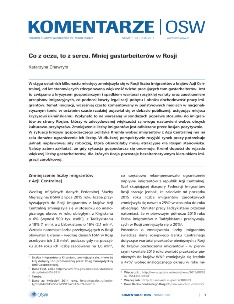 Ośrodek Studiów Wschodnich im. Marka Karpia NUMER 183 | 18.09.2015 www.osw.waw.pl Co z oczu, to z serca. Mniej gastarbeiterów w Rosji Katarzyna Chawryło W ciągu ostatnich kilkunastu miesięcy zmniejszyła się w Rosji liczba imigrantów z krajów Azji Centralnej, od lat stanowiących zdecydowaną większość wśród pracujących tam gastarbeiterów. Jest to związane z kryzysem gospodarczym i spadkiem wartości rosyjskiej waluty oraz zaostrzeniem przepisów imigracyjnych, co podnosi koszty legalizacji pobytu i obniża dochodowość pracy imigrantów. Temat imigracji, wcześniej często komentowany w państwowych mediach w nacjonalistycznym tonie, w ostatnim czasie rzadziej pojawiał się w debacie publicznej, ustępując miejsca kryzysowi ukraińskiemu. Wpłynęło to na wyrażaną w sondażach poprawę stosunku do imigrantów ze strony Rosjan, którzy w zdecydowanej większości są wrogo nastawieni wobec obcych kulturowo przybyszów. Zmniejszenie liczby imigrantów jest odbierane przez Rosjan pozytywnie. W sytuacji kryzysu gospodarczego polityka Kremla wobec imigrantów z Azji Centralnej ma na celu doraźne ograniczenie ich liczby. W dłuższej perspektywie rosyjski rynek pracy potrzebuje jednak napływowej siły roboczej, która obsadziłaby mniej atrakcyjne dla Rosjan stanowiska. Należy zatem zakładać, że gdy sytuacja gospodarcza się unormuje, Kreml dopuści do wjazdu większej liczby gastarbeiterów, dla których Rosja pozostaje bezalternatywnym kierunkiem imigracji zarobkowej. Zmniejszenie liczby imigrantów z Azji Centralnej Według oficjalnych danych Federalnej Służby Migracyjnej (FSM) z lipca 2015 roku liczba przybywających do Rosji imigrantów z krajów Azji Centralnej zmniejszyła się w stosunku do analogicznego okresu w roku ubiegłym: z Kirgistanu o 6% (wynosi 500 tys. osób1), z Tadżykistanu o 18% (1 mln), a z Uzbekistanu o 16% (2,1 mln)2. Wzrosła natomiast liczba przebywających w Rosji obywateli Ukrainy – według danych FSM w Rosji przebywa ich 2,6 mln3, podczas gdy na początku 2014 roku ich liczbę szacowano na 1,6 mln4, Liczba imigrantów z Kirgistanu zmniejszyła się, mimo że kraj dołączył do promowanej przez Rosję Eurazjatyckiej Unii Gospodarczej. 2 Dane FSM, zob.: http://www.fms.gov.ru/about/statistics/ data/details/54891/ 3 Tamże. 4 Dane za kwiecień 2014 roku, http://top.rbc.ru/society/09/04/2015/5523d9919a7947ec74afd619 1 co częściowo rekompensowało ograniczenie napływu imigrantów z republik Azji Centralnej. Szef skupiającej diaspory Federacji Imigrantów Rosji szacuje jednak, że zaledwie od początku 2015 roku liczba imigrantów zarobkowych zmniejszyła się nawet o 25%5 w stosunku do roku ubiegłego. Minister pracy Tadżykistanu przyznał natomiast, że w pierwszym półroczu 2015 roku liczba imigrantów z Tadżykistanu przebywających w Rosji zmniejszyła się o 20%6. Pośrednio o zmniejszeniu liczby imigrantów świadczą dane rosyjskiego Banku Centralnego dotyczące wartości przekazów pieniężnych z Rosji do krajów pochodzenia imigrantów – w pierwszym kwartale 2015 roku wartość przekazów pieniężnych do krajów WNP zmniejszyła się średnio o 47%7 wobec analogicznego okresu w roku mi Więcej zob.: http://www.gazeta.ru/social/news/2015/08/26 /n_7514393.shtml 6 Więcej zob.: http://rusnovosti.ru/posts/380389 7 Dane Banku Centralnego Rosji http://www.cbr.ru/statistics 5 KOMENTARZE OSW NUMER 183 1 nionym. W pierwszym kwartale 2015 roku wartość przekazów do Uzbekistanu zmniejszyła się o 49%, Tadżykistanu o 44%, Kirgistanu o 41% w porównaniu z pierwszym kwartałem roku ubiegłego8. Zmniejszyła się także średnia suma jednorazowego przekazu pieniężnego do krajów WNP – z 422 USD w drugim kwartale 2014 roku do 345 USD w drugim kwartale 2015 roku. Przyczyny zmniejszenia imigracji zarobkowej Na zmniejszenie liczby imigrantów z krajów WNP może mieć wpływ kilka czynników. Urzędnicy i zbliżeni do Kremla eksperci wskazują, że główną przyczyną są wprowadzane sukcesywnie ograniczenia prawne i zaostrzone kontrole związane z napływem i obecnością w Rosji imigrantów zarobkowych. Wśród nich obowiązujący od stycznia 2015 roku wymóg posiadania specjalnego patentu (zezwolenia na podjęcie pracy, opłacanego co miesiąc przez samego imigranta), umożliwiającego podjęcie legalnej pracy. Uzyskanie patentu jest dla przybyszów bardzo kosztowne i żmudne9. Co więcej, według funkcjonariuszy FSM spadek liczby imigrantów to owoc efektywniejszej pracy tej służby. Jak zapewnia jej szef Konstantin Romadanowski, skutecznym straszakiem dla imigrantów nielegalnie przebywających w Rosji jest zakaz wjazdu do kraju przez 10 lat w przypadku złamania przepisów imigracyjnych, który stał się podstawowym instrumentem stosowanym do walki z nielegalnymi imigrantami. Według słów Romadanowskiego, dzięki wysiłkom FSM mamy obecnie do czynienia z „cywilizowaną imigracją, a nie zalaniem terytorium Federacji Rosyjskiej przez obywateli innych państw”10. Dane Banku Centralnego za: http://migrant.ferghana.ru Szczegółowe dane: http://www.cbr.ru/statistics/print.aspx?file=CrossBorder/Rem_countries_15-1.htm&pid=svs&sid=TGO_sp_post 9 Więcej zob.: http://www.osw.waw.pl/pl/publikacje/analizy/2014-11-26/rosja-nowe-zasady-zatrudniania-gastarbeiterow-z-wnp 10 Więcej zob.: http://www.vedomosti.ru/politics/news/2015 /04/23/direktor-fms-podtverdil-chto-v-moskve-stalo-menshe-migrantov 8 Należy jednak wziąć pod uwagę, że wobec pojawiających się od ubiegłego roku spekulacji na temat możliwej likwidacji FSM i przekazania jej kompetencji Ministerstwu Spraw Wewnętrznych11, sama służba jest zainteresowana rozpowszechnianiem takiej narracji, która uwiarygodniałaby jej skuteczność w obecnej formie. Wydaje się, że najważniejszą przyczyną ograniczenia napływu imigrantów do Rosji nie są jednak bariery prawne, ale znaczący spadek wartości rubla12 i pogorszenie warunków na rosyjskim rynku pracy z powo