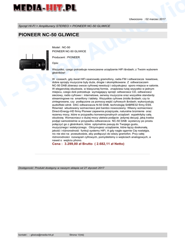 o i d d i V Utworzono : 02 marzec 2017 Sprzęt HI-FI > Amplitunery STEREO > PIONEER NC-50 GLIWICE PIONEER NC-50 GLIWICE Model : NC-50 PIONEER NC-50 GLIWICE p le Producent : PIONEER Opis: u A k S Wszystko, czego potrzebuje nowoczesne urządzenie HiFi – z Twoim wyborem głośników! l p W czasach, gdy świat HiFi opanowały gramofony, radia FM i odtwarzacze kasetowe, dobre sprzęty muzyczne były duże, drogie i skomplikowane. Z odtwarzaczem NC-50 DAB zbierasz owoce cyfrowej rewolucji i odzyskujesz sporo miejsca w salonie. W eleganckiej obudowie, w klasycznej formie, znajdziesz tutaj wszystko w jednym miejscu, czego dziś potrzebuje wymagający sprzęt: odtwarzacz CD, odtwarzacz sieciowy, radio cyfrowe i internetowe, serwisy muzyczne oraz wszystkie standardy streamingowe na smartfony i tablety. Wszystkie cyfrowe źródła – czy to zintegrowane, czy podłączone za pomocą wejść cyfrowych – wykorzystują audiofilski silnik DAC odtwarzacza N-50 DAB, technologię SABRE32 firmy ESS. Również wbudowany wzmacniacz jest bardzo nowoczesny: Własny wzmacniacz Direct-Energy-HD firmy Pioneer zapewnia przejrzyste, naturalne brzmienie oraz rezerwy mocy, które w przypadku konwencjonalnych urządzeń wypełniłyby całą obudowę. Wzmacniacz o dużej mocy ułatwia podjęcie jedynej decyzji, jaką trzeba podjąć samodzielnie w przypadku odtwarzacza NC-50 DAB: wystarczy po prostu połączyć go z głośnikami, które optymalnie pasują do Twojego gustu, muzycznego i estetycznego. Otrzymujesz urządzenie, które łączy doskonałą jakość i różnorodność funkcji systemu HiFi. A gdy nagle ogarnie Cię nostalgia, nic nie stoi na przeszkodzie, aby podłączyć do wieży gramofon. Przy całej różnorodności rozwiązań cyfrowych, pomyśleliśmy o wejściach analogowych, a nawet o wejściu phono. Cena : 3.299,00 zł Brutto ( 2.682,11 zł Netto) Dostępność: Produkt dostępny w naszym sklepie od 27 styczeń 2017 kontakt : - [email protected] Strona 1/{nb}