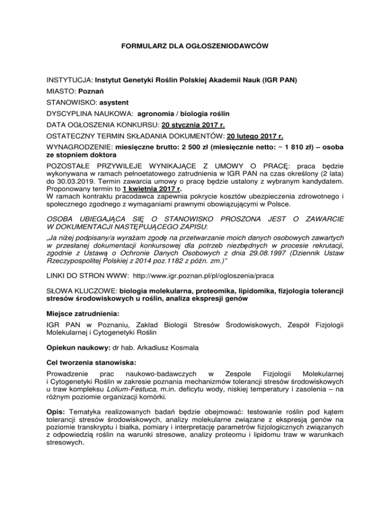 FORMULARZ DLA OGŁOSZENIODAWCÓW INSTYTUCJA: Instytut Genetyki Roślin Polskiej Akademii Nauk (IGR PAN) MIASTO: Poznań STANOWISKO: asystent DYSCYPLINA NAUKOWA: agronomia / biologia roślin DATA OGŁOSZENIA KONKURSU: 20 stycznia 2017 r. OSTATECZNY TERMIN SKŁADANIA DOKUMENTÓW: 20 lutego 2017 r. WYNAGRODZENIE: miesięczne brutto: 2 500 zł (miesięcznie netto: ~ 1 810 zł) – osoba ze stopniem doktora POZOSTAŁE PRZYWILEJE WYNIKAJĄCE Z UMOWY O PRACĘ: praca będzie wykonywana w ramach pełnoetatowego zatrudnienia w IGR PAN na czas określony (2 lata) do 30.03.2019. Termin zawarcia umowy o pracę będzie ustalony z wybranym kandydatem. Proponowany termin to 1 kwietnia 2017 r. W ramach kontraktu pracodawca zapewnia pokrycie kosztów ubezpieczenia zdrowotnego i społecznego zgodnego z wymaganiami prawnymi obowiązującymi w Polsce. OSOBA UBIEGAJĄCA SIĘ O STANOWISKO W DOKUMENTACJI NASTĘPUJĄCEGO ZAPISU: PROSZONA JEST O ZAWARCIE „Ja niżej podpisany/a wyrażam zgodę na przetwarzanie moich danych osobowych zawartych w przesłanej dokumentacji konkursowej dla potrzeb niezbędnych w procesie rekrutacji, zgodnie z Ustawą o Ochronie Danych Osobowych z dnia 29.08.1997 (Dziennik Ustaw Rzeczypospolitej Polskiej z 2014 poz.1182 z późn. zm.)” LINKI DO STRON WWW: http://www.igr.poznan.pl/pl/ogloszenia/praca SŁOWA KLUCZOWE: biologia molekularna, proteomika, lipidomika, fizjologia tolerancji stresów środowiskowych u roślin, analiza ekspresji genów Miejsce zatrudnienia: IGR PAN w Poznaniu, Zakład Biologii Stresów Środowiskowych, Zespół Fizjologii Molekularnej i Cytogenetyki Roślin Opiekun naukowy: dr hab. Arkadiusz Kosmala Cel tworzenia stanowiska: Prowadzenie prac naukowo-badawczych w Zespole Fizjologii Molekularnej i Cytogenetyki Roślin w zakresie poznania mechanizmów tolerancji stresów środowiskowych u traw kompleksu Lolium-Festuca, m.in. deficytu wody, niskiej temperatury i zasolenia – na różnym poziomie organizacji komórki. Opis: Tematyka realizowanych badań będzie obejmować: testowanie roślin pod kątem tolerancji stresów środowiskowych, analizy molekularne związane z ekspresją genów na poziomie transkryptu i białka, pomiary i interpretację parametrów fizjologicznych związanych z odpowiedzią roślin na warunki stresowe, analizy proteomu i lipidomu traw w warunkach stresowych. Wymagania: • stopień doktora nauk rolniczych lub biologicznych; • znajomość zagadnień z zakresu mechanizmów tolerancji stresów abiotycznych i biotycznych u traw; • biegłość w stosowaniu technik molekularnych, w tym technik związanych z analizą ekspresji genów; • doświadczenie w pracach z zakresu proteomiki i lipidomiki roślin; • doświadczenie w pracach polowych, w tym w pracach związanych z testowaniem tolerancji stresów środowiskowych u roślin; • umiejętność pracy zespołowej; • znajomość podstaw analizy statystycznej; • dobra znajomość języka angielskiego. Zakres obowiązków: Prowadzenie badań na wysokim poziomie naukowym, publikowanie wyników w renomowanych czasopismach naukowych, rozwijanie współpracy z innymi ośrodkami naukowymi. Wykaz dokumentów wymaganych od kandydata: 1) 2) 3) List motywacyjny; CV kandydata, a w szczególności: - wykaz publikacji (z wyszczególnieniem publikacji w tematyce badań proponowanych do realizacji na stanowisku konkursowym); - wykaz wykonywanych/kierowanych projektów badawczych; - wykaz doniesień konferencyjnych i in. aktywności naukowych. Odpis(y) dyplomu(ów). Dokumenty prosimy składać osobiście lub mailem z tytułem "Konkurs asystent Biologia Stresów" w Dziale Kadr, pok. 125 (email: [email protected]) z kopią do dr hab. Arkadiusza Kosmali (email: [email protected]) lub też listownie pod adresem: Instytut Genetyki Roślin PAN, ul. Strzeszyńska 34, 60-479 Poznań. Termin rozstrzygnięcia konkursu i ogłoszenia wyników Nie później niż 1 miesiąc po zamknięciu naboru.