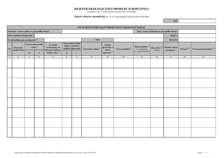 REJESTR EKOLOGICZNEJ PRODUKCJI ROŚLINNEJ na podstawie art. 72 rozporządzenia Komisji (WE) nr 889/2008 Rejestr zbiorów (produkcji) (art. 72 lit. d rozporządzenia Komisji (WE) nr 889/2008) Rok: DANE IDENTYFIKUJĄCE PRODUCENTA EKOLOGICZNEGO Nazwisko / nazwa pełna (w przypadku firmy): Imię / nazwa skrócona (w przypadku firmy): Adres siedziby producenta: PESEL: 1) NIP: Nr identyfikacyjny producenta : Oznaczenie Lp. działki rolnej 1. 2. Powierzchnia działki rolnej 2) ha a Nr działki ewidencyjnej, na której jest położona 3) działka rolna 3. 4. 5. Powierzchnia działki rolnej w granicach działki ewidencyjnej ha a 6. 7. Uprawiana roślina 8. Opracowano w Głównym Inspektoracie Jakości Handlowej Artykułów Rolno-Spożywczych, wersja z dnia 06.10.2014 r. 4) REGON: Roślina uprawiana w plonie 5) głównym 9. Nazwa produktu 10. 6) Status produktu 7) E - ekologiczny K - z okresu konwersji 11. Data zbioru 8) Wielkość zbioru (dd-mm) (produkcji) 9) 12. 13. Wariant 14. 10) Przeznaczenie produktu 15. Strona ..... z ...... 11) Objaśnienia: 1) Należy wpisać numer identyfikacyjny producenta, nadany na podstawie przepisów ustawy z dnia 18 grudnia 2003 r. o krajowym systemie ewidencji producentów, ewidencji gospodarstw rolnych oraz ewidencji wniosków o przyznanie płatności (Dz. U. z 2012 r. poz. 86 poz. 86 oraz z 2013 r. poz. 1537). W przypadku braku numeru identyfikacyjnego, należy podać w odpowiednim polu numer PESEL lub NIP lub REGON. 2) Należy wpisać dla każdej działki rolnej powierzchnię upraw spełniającą wymogi produkcji w rolnictwie ekologicznym, o których mowa w rozporządzeniu Rady (WE) nr 834/2007 z dnia 28 czerwca 2007 r. w sprawie produkcji ekologicznej i znakowania produktów ekologicznych i uchylającego rozporządzenie (EWG) nr 2092/91 (Dz. Urz. UE L 189 z 20.07.2007, str. 1, z późn. zm.), zwanego dalej „rozporządzeniem Rady (WE) nr 834/2007”. 3) Należy wpisać numer działki ewidencyjnej, na której położona jest dana działka rolna lub jej część. W przypadku, gdy działka rolna jest położona na kilku działkach ewidencyjnych, numery działek ewidencyjnych należy podać w odrębnych wierszach. 4) Należy wpisać nazwę rośliny uprawianej. W przypadku, gdy na danej działce rolnej uprawiano więcej niż jedną roślinę, to nazwy tych roślin należy podać w odrębnych wierszach. 5) Należy wpisać „X” w odpowiednim polu, w przypadku rośliny uprawianej w plonie głównym. 6) Należy wpisać nazwę produktu uzyskanego z rośliny, o której mowa w kolumnie 8. W przypadku, gdy z danej działki rolnej uzyskano więcej niż jeden produkt to nazwy tych produktów należy podać w odrębnych wierszach. Należy podać nazwę produktu, który nie został poddany jakiejkolwiek obróbce wywołującej zasadniczą zmianę jej stanu pierwotnego, przy czym uważa się, że zasadniczej zmiany nie wywołują w szczególności czynności takie jak: dzielenie, porcjowanie, odcinanie, obcinanie, okrawanie, obieranie, rozdrabnianie, krojenie, czyszczenie, głębokie mrożenie, zamrażanie, schładzanie, mielenie, pakowanie lub rozpakowywanie. 7) Należy wpisać „E” w przypadku statusu ekologicznego lub ,,K" w przypadku statusu w okresie konwersji. Możliwe jest wpisanie tylko jednego ze statusów produktu. Status produktu musi być potwierdzony certyfikatem, o którym mowa w art. 29 rozporządzenia Rady (WE) nr 834/2007. 8) W przypadku, gdy zbioru dokonywano w ciągu kilku dni, daty poszczególnych dni zbioru należy podać w odrębnych wierszach. 9) Wielkość zbioru (produkcji) produktów, o których mowa w kolumnie 10, należy wpisać w tonach z dokładnością do trzeciego miejsca po przecinku lub w sztukach (wraz z podaniem jednostki miary). W przypadku roślin uprawianych w ramach wariantów 2.3 i 2.4, o których mowa w rozporządzeniu Ministra Rolnictwa i Rozwoju Wsi z dnia 13 marca 2013 r. w sprawie szczegółowych warunków i trybu przyznawania pomocy finansowej w ramach działania „Program rolnośrodowiskowy” objętego Programem Rozwoju Obszarów Wiejskich na lata 2007–2013 , wielkość zbioru (produkcji) należy wpisać w tonach z dokładnością do drugiego miejsca po przecinku (wraz z podaniem jednostki miary). 10) Można wpisać numer wariantu zgodnie z pakietem 2. Rolnictwo ekologiczne określonym zgodnie z przepisami rozporządzenia Ministra Rolnictwa i Rozwoju Wsi z dnia 13 marca 2013 r. w sprawie szczegółowych warunków i trybu przyznawania pomocy finansowej w ramach działania „Program rolnośrodowiskowy” objętego Programem Rozwoju Obszarów Wiejskich na lata 2007 – 2013 oraz zgodnie ze złożonym przez producenta do ARiMR wnioskiem o przyznanie płatności rolnośrodowiskowej w danym roku (w przypadku złożenia przez producenta takiego wniosku). 11) Należy wpisać „wprowadzenie na rynek", co oznacza posiadanie żywności lub pasz w celu sprzedaży, z uwzględnieniem oferowania do sprzedaży lub innej formy dysponowania, bezpłatnego lub nie oraz sprzedaż, dystrybucję i inne formy dysponowania lub „na własny użytek", co oznacza produkcję podstawową na własny użytek lub do domowego przygotowania, obróbki lub przechowywania do własnego spożycia lub wykorzystania na paszę lub zasiew. W przypadku, gdy część produktu z danej działki przeznaczona jest na wprowadzenie na rynek a reszta na własny użytek, różne przeznaczenie produktu należy podać w odrębnych wierszach. X E K wprowadzenie na rynek na własny użytek Opracowano w Głównym Inspektoracie Jakości Handlowej Artykułów Rolno-Spożywczych, wersja z dnia 06.10.2014 r.
