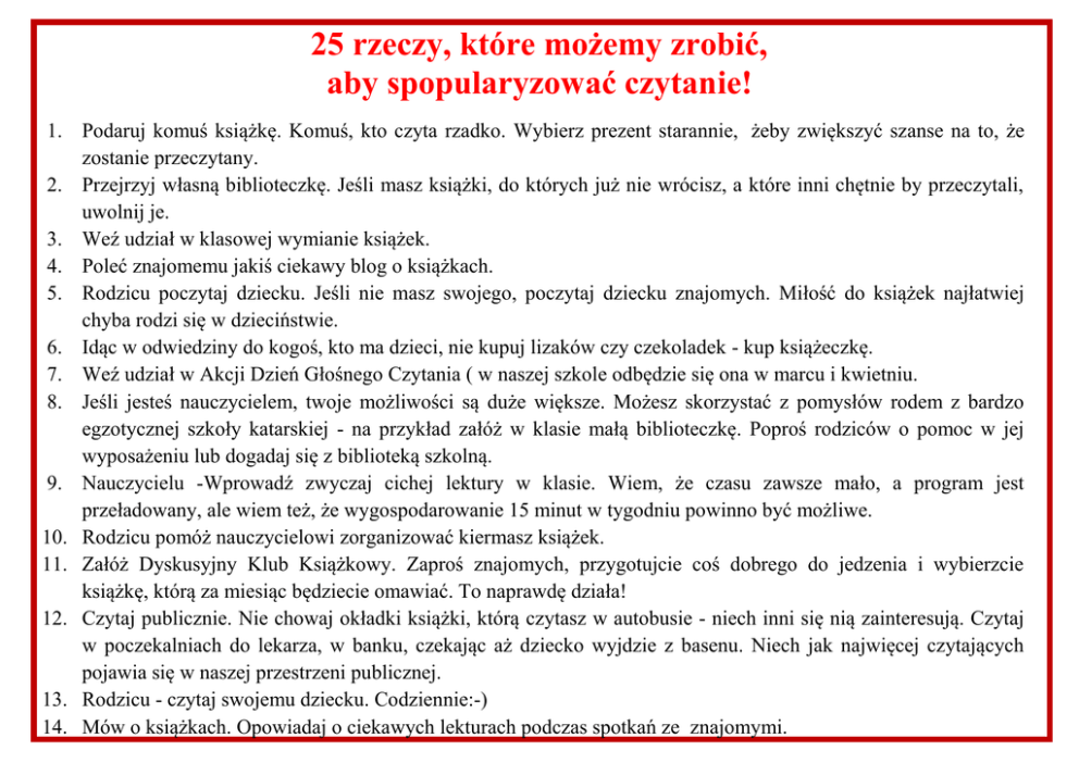 25 rzeczy, które możemy zrobić, aby spopularyzować czytanie! 1. Podaruj komuś książkę. Komuś, kto czyta rzadko. Wybierz prezent starannie, żeby zwiększyć szanse na to, że zostanie przeczytany. 2. Przejrzyj własną biblioteczkę. Jeśli masz książki, do których już nie wrócisz, a które inni chętnie by przeczytali, uwolnij je. 3. Weź udział w klasowej wymianie książek. 4. Poleć znajomemu jakiś ciekawy blog o książkach. 5. Rodzicu poczytaj dziecku. Jeśli nie masz swojego, poczytaj dziecku znajomych. Miłość do książek najłatwiej chyba rodzi się w dzieciństwie. 6. Idąc w odwiedziny do kogoś, kto ma dzieci, nie kupuj lizaków czy czekoladek - kup książeczkę. 7. Weź udział w Akcji Dzień Głośnego Czytania ( w naszej szkole odbędzie się ona w marcu i kwietniu. 8. Jeśli jesteś nauczycielem, twoje możliwości są duże większe. Możesz skorzystać z pomysłów rodem z bardzo egzotycznej szkoły katarskiej - na przykład załóż w klasie małą biblioteczkę. Poproś rodziców o pomoc w jej wyposażeniu lub dogadaj się z biblioteką szkolną. 9. Nauczycielu -Wprowadź zwyczaj cichej lektury w klasie. Wiem, że czasu zawsze mało, a program jest przeładowany, ale wiem też, że wygospodarowanie 15 minut w tygodniu powinno być możliwe. 10. Rodzicu pomóż nauczycielowi zorganizować kiermasz książek. 11. Załóż Dyskusyjny Klub Książkowy. Zaproś znajomych, przygotujcie coś dobrego do jedzenia i wybierzcie książkę, którą za miesiąc będziecie omawiać. To naprawdę działa! 12. Czytaj publicznie. Nie chowaj okładki książki, którą czytasz w autobusie - niech inni się nią zainteresują. Czytaj w poczekalniach do lekarza, w banku, czekając aż dziecko wyjdzie z basenu. Niech jak najwięcej czytających pojawia się w naszej przestrzeni publicznej. 13. Rodzicu - czytaj swojemu dziecku. Codziennie:-) 14. Mów o książkach. Opowiadaj o ciekawych lekturach podczas spotkań ze znajomymi. 15. Uczniowie - obecnie modne są tzw. Flash moby. Jeśli masz czytających znajomych, zorganizujcie czytelniczy flash mob. Pojawcie się znienacka w miejscu publicznym, wyciągnijcie książki i zacznijcie czytać. Wydrukujcie karteczki z ciekawymi, prowokującymi cytatami i rozdajcie je ludziom na ulicy. Jeśli zdecydujecie się na taką akcję, zawiadomcie panią Jolantę Jarzembińską lub panią Elżbietę Mionskowską. One pomogą Wam zorganizować całe przedsięwzięcie. 16. Rodzicu - chodź z dzieckiem do księgarni. Uczyń z tego przygodę lub rytuał. Niech księgarnia jawi mu się jako miejsce pełne fantastycznych rzeczy czekających na odkrycie. Pozwól dziecku wybrać, co kupicie. 17. Rodzicu, nauczycielu - opowiadaj o książkach swojego dzieciństwa. Dzieci uwielbiają słuchać historii o tym, jak mama i tata byli małymi dziećmi. Zróbcie to tak, żeby dziecko poczuło, że czytanie to przygoda. 18. Zamieszczaj na swoim profilu na Facebooku zabawne obrazki popularyzujące czytanie. 19. Kup sobie jakiś gadżet popularyzujący czytanie, np. torbę z zabawnym hasłem, koszulkę z cytatem lub wisiorek w kształcie książki. 20. Gdy natrafisz na dobrą lekturę, opowiedz o niej znajomym. 21. Nie zapominaj, że każdego mogą zachwycić inne książki. Wybierając książkę dla, powiedzmy, nastolatki, nie pomijaj książek, które są na topie, choć mogą nieco rozmijać się z twoim gustem czytelniczym. W końcu to nie ty będziesz je czytać. 22. Umieszczaj listy swoich ulubionych książek w sieci. 23. Pomysł rodem z Wielkiej Brytanii. Zapytaj posła ze swojego okręgu, co zrobił dla kultury w waszym mieście czy regionie. Jeden taki list zostanie zapewne zignorowany, jeśli jednak pojawi się ich kilkadziesiąt, mogą wzbudzić pewne zaniepokojenie. 24. Czasem do książek dochodzi się powoli. Jeśli twoje dziecko, twój uczeń, czy ktoś inny, kogo chciałbyś zarazić czytaniem, nie może się przekonać do książek, może lepiej mu pójdzie z czasopismami? 25. I najważniejsze: zawsze bądź taktowny. Nie jesteś lepszy przez to, że czytasz. Nie chcesz nikogo nawracać czy zbawiać. Próbuj delikatnie zarażać ludzi swoją pasją, jednak nie rób tego na siłę, nachalnie czy bezustannie. Uszanuj, jeśli ktoś nie chce z tobą rozmawiać o książkach lub jeśli da ci do zrozumienia, że książka była chybionym pomysłem. Przy opracowaniu listy skorzystano z materiałów zawartych w tekstach blogów internetowych