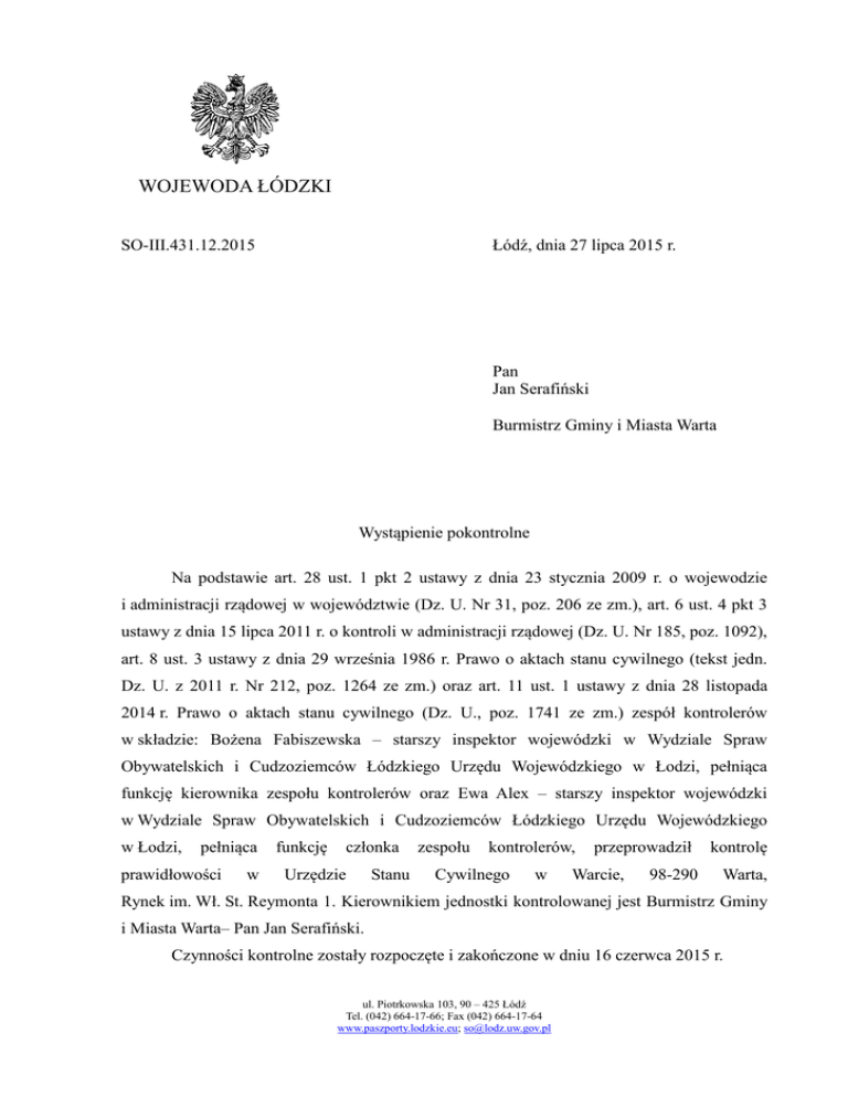 WOJEWODA ŁÓDZKI Łódź, dnia 27 lipca 2015 r. SO-III.431.12.2015 Pan Jan Serafiński Burmistrz Gminy i Miasta Warta Wystąpienie pokontrolne Na podstawie art. 28 ust. 1 pkt 2 ustawy z dnia 23 stycznia 2009 r. o wojewodzie i administracji rządowej w województwie (Dz. U. Nr 31, poz. 206 ze zm.), art. 6 ust. 4 pkt 3 ustawy z dnia 15 lipca 2011 r. o kontroli w administracji rządowej (Dz. U. Nr 185, poz. 1092), art. 8 ust. 3 ustawy z dnia 29 września 1986 r. Prawo o aktach stanu cywilnego (tekst jedn. Dz. U. z 2011 r. Nr 212, poz. 1264 ze zm.) oraz art. 11 ust. 1 ustawy z dnia 28 listopada 2014 r. Prawo o aktach stanu cywilnego (Dz. U., poz. 1741 ze zm.) zespół kontrolerów w składzie: Bożena Fabiszewska – starszy inspektor wojewódzki w Wydziale Spraw Obywatelskich i Cudzoziemców Łódzkiego Urzędu Wojewódzkiego w Łodzi, pełniąca funkcję kierownika zespołu kontrolerów oraz Ewa Alex – starszy inspektor wojewódzki w Wydziale Spraw Obywatelskich i Cudzoziemców Łódzkiego Urzędu Wojewódzkiego w Łodzi, pełniąca prawidłowości w funkcję członka Urzędzie Stanu zespołu kontrolerów, Cywilnego w przeprowadził Warcie, 98-290 kontrolę Warta, Rynek im. Wł. St. Reymonta 1. Kierownikiem jednostki kontrolowanej jest Burmistrz Gminy i Miasta Warta– Pan Jan Serafiński. Czynności kontrolne zostały rozpoczęte i zakończone w dniu 16 czerwca 2015 r. ul. Piotrkowska 103, 90 – 425 Łódź Tel. (042) 664-17-66; Fax (042) 664-17-64 www.paszporty.lodzkie.eu; [email protected] 2 Kontrola objęła swym zakresem przestrzeganie przepisów prawa w zakresie prowadzenia przez kierownika i zastępcę kierownika urzędu stanu cywilnego rejestracji stanu cywilnego oraz sprawdzenie sposobu przechowywania i zabezpieczenia ksiąg stanu cywilnego, w okresie od dnia 1 stycznia 2014 r. do dnia 31 grudnia 2014 r. Kontroli zostały poddane następujące zagadnienia: sposób prowadzenia ksiąg stanu cywilnego oraz sporządzania aktów stanu cywilnego, sposób gromadzenia akt zbiorowych, sposób przechowywania i zabezpieczenia ksiąg stanu cywilnego. Mając na uwadze dokonane podczas kontroli ustalenia stwierdzono, że wszystkie zagadnienia objęte kontrolą były realizowane zgodnie z przepisami zawartymi w ustawie Prawo o a.s.c. W zakresie sposobu prowadzenia ksiąg stanu cywilnego kontroli poddano wszystkie księgi stanu cywilnego. Księgi prowadzone są zgodnie z obowiązującymi w tym zakresie przepisami. W zakresie sposobu sporządzania aktów stanu cywilnego oraz sposobu gromadzenia akt zbiorowych kontroli poddano: - 30% sporządzonych aktów urodzeń, tj. 3 akty urodzeń o nr 2, 3, 6 (numery aktów wytypowane losowo na stronie www.losowo.pl); - 30% sporządzonych aktów małżeństw, tj. 19 aktów małżeństw o nr 8, 10, 17, 21, 22, 28, 29, 30, 31, 32, 36, 44, 45, 46, 47, 55, 56, 60, 63 (numery aktów wytypowane losowo na stronie www.losowo.pl); - 30 % sporządzonych aktów zgonów, tj. 21 aktów zgonów o nr 3, 6, 10, 11, 18, 20, 34, 36, 40, 41, 43, 45, 47, 49, 51, 54, 56, 57, 58, 62, 64 (numery aktów wytypowane losowo na stronie www.losowo.pl). Sposób sporządzenia wszystkich skontrolowanych aktów urodzenia, małżeństwa i zgonu oraz gromadzenia akt zbiorowych nie budzi zastrzeżeń. Sposób gromadzenia dokumentacji do zawarcia małżeństwa lub wydania zaświadczenia określonego w art. 4¹ K.r.io. jest prawidłowy. Z zestawienia dat wpływu zaświadczeń i dat sporządzenia aktów małżeństwa wynika, że nie doszło do naruszenia przepisu art. 8 § 2 i 3 K.r.io. W zakresie sposobu przechowywania i zabezpieczenia ksiąg stanu cywilnego stwierdzić należy, iż księgi przechowywane są zgodnie z wymogami wynikającymi z przepisu § 22 ust. 1 i 2 rozporządzenia Ministra Spraw Wewnętrznych i Administracji z dnia 26 października 1998 r. w sprawie szczegółowych zasad sporządzania aktów stanu cywilnego, sposobu prowadzenia ksiąg stanu cywilnego, ich kontroli, przechowywania i zabezpieczania oraz wzorów aktów stanu cywilnego, ich odpisów, zaświadczeń i protokołów (Dz. U. Nr 136, 3 poz. 884 ze zm.). Wobec powyższego działalność Kierownika i Zastępcy Kierownika Urzędu Stanu Cywilnego w Warcie w kontrolowanym okresie oceniono pozytywnie. Z up. WOJEWODY ŁÓDZKIEGO Jacek Winiarski DYREKTOR WYDZIAŁU SPRAW OBYWATELSKICH I CUDZOZIEMCÓW