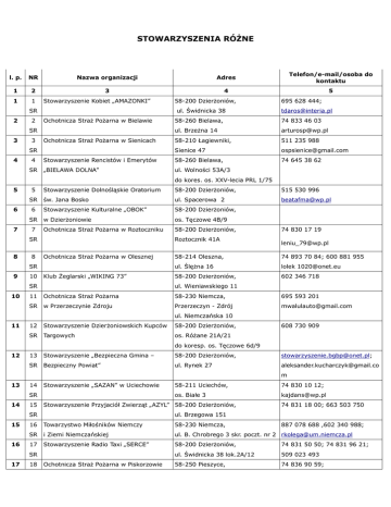 STOWARZYSZENIA RÓŻNE l. p. NR Nazwa organizacji Adres Telefon/e-mail/osoba do kontaktu 1 2 3 4 5 1 1 Stowarzyszenie Kobiet „AMAZONKI” SR 2 2 ul. Świdnicka 38 Ochotnicza Straż Pożarna w Bielawie 3 4 SR [email protected] 74 833 46 03 ul. Brzeżna 14 [email protected] 58-210 Łagiewniki, 511 235 988 Sienice 47 [email protected] Stowarzyszenie Rencistów i Emerytów 58-260 Bielawa, 74 645 38 62 „BIELAWA DOLNA” ul. Wolności 53A/3 Ochotnicza Straż Pożarna w Sienicach SR 4 695 628 444; 58-260 Bielawa, SR 3 58-200 Dzierżoniów, do kores. os. XXV-lecia PRL 1/75 5 5 SR 6 6 SR 7 7 Stowarzyszenie Dolnośląskie Oratorium 58-200 Dzierżoniów, 515 530 996 św. Jana Bosko ul. Spacerowa 2 [email protected] Stowarzyszenie Kulturalne „OBOK” 58-200 Dzierżoniów, w Dzierżoniowie os. Tęczowe 4B/9 Ochotnicza Straż Pożarna w Roztoczniku 58-200 Dzierżoniów, SR 8 8 Roztocznik 41A Ochotnicza Straż Pożarna w Olesznej SR 9 10 Klub Żeglarski „WIKING 73” SR 10 74 830 17 19 [email protected] 58-214 Oleszna, 74 893 70 84; 600 881 955 ul. Ślężna 16 lolek [email protected] 58-200 Dzierżoniów, 602 346 718 ul. Wieniawskiego 11 11 Ochotnicza Straż Pożarna 58-230 Niemcza, 695 593 201 SR w Przerzeczynie Zdroju Przerzeczyn - Zdrój [email protected] ul. Niemczańska 10 11 12 Stowarzyszenie Dzierżoniowskich Kupców 58-200 Dzierżoniów, SR Targowych os. Różane 21A/21 608 730 909 do koresp. os. Tęczowe 6d/9 12 13 Stowarzyszenie „Bezpieczna Gmina – 58-200 Dzierżoniów, [email protected]; SR Bezpieczny Powiat” ul. Rynek 27 [email protected] m 13 14 Stowarzyszenie „SAZAN” w Uciechowie SR 14 15 16 os. Białe 3 [email protected] 74 831 18 00; 663 503 750 ul. Brzegowa 151 16 Towarzystwo Miłośników Niemczy 58-230 Niemcza, SR i Ziemi Niemczańskiej ul. B. Chrobrego 3 skr. poczt. nr 2 [email protected] 17 Stowarzyszenie Radio Taxi „SERCE” 58-200 Dzierżoniów, 74 831 50 50; 74 831 96 21; ul. Świdnicka 38 lok.2A/12 509 023 493 58-250 Pieszyce, 74 836 90 59; SR 17 74 830 10 12; Stowarzyszenie Przyjaciół Zwierząt „AZYL” 58-200 Dzierżoniów, SR 15 58-211 Uciechów, 18 Ochotnicza Straż Pożarna w Piskorzowie 887 078 688 ,602 340 988; SR 18 19 Ochotnicza Straż Pożarna w Jaźwinie Piskorzów 45 [email protected] 58-212 Jaźwina 75 600 347 083 SR 19 [email protected] 20 Stowarzyszenie Klubu Abstynenta 58-200 Dzierżoniów, 74 832 36 18; SR „Na Pawłowym Wzgórzu” Wzgórze Ojca Św. Jana Pawła II 1 669 094 250; [email protected] [email protected] 20 21 Towarzystwo Przyjaciół Bielawy SR 21 22 Ochotnicza Straż Pożarna w Gilowie SR 22 23 Ochotnicza Straż Pożarna w Łagiewnikach SR 58-260 Bielawa, 697 778 677 os. Włókniarzy 10 [email protected] 58-230 Niemcza, 662 646 000 Gilów 43 [email protected] 58-210 Łagiewniki, 74 893 94 97; 74 893 90 62; ul. Lipowa 4 0698 207 75; [email protected] 23 24 24 Stowarzyszenie Taksówkarzy 58-200 Dzierżoniów, SR Dzierżoniowskich „Radio Taxi BIS” ul. Strumykowa 1 25 Ochotnicza Straż Pożarna w Niemczy 58-230 Niemcza, 663 306 713; ul. Ogrodowa 1 505 083 262 SR 74 821 5252; 74831 80 00 [email protected] 25 26 27 28 29 26 Ochotnicza Straż Pożarna w Ligocie 58-210 Łagiewniki, SR Wielkiej Ligota Wielka 56B 27 Stowarzyszenie Sudecka Agencja 58-260 Bielawa, SR Artystyczna „SART” ul. Piastowska 18 28 Stowarzyszenie Wędkarskie „SUDETY” 58-260 Bielawa, SR w Bielawie ul. Wysoka 1 29 Towarzystwo Turystyczno-Narciarskie 58-200 Dzierżoniów, SR „POTOCZEK” os. Różane 3B/12 31 Towarzystwo Miłośników Dzierżoniowa 58-200 Dzierżoniów, SR ul. Świdnicka 30 74 893 76 36; 660 021 218 693 421 947 74 833 68 96 74 831 71 78 74 645 17 16; 698 249 839; [email protected] [email protected] 30 32 Stowarzyszenie „Nasz Krzyż” SR 31 58-200 Dzierżoniów, 74 645 66 67 ul. Nowa 1C/7 33 Stowarzyszenie Obrony Bezrobotnych 58-200 Dzierżoniów, 509 944 391; SR „GODNOŚĆ” ul. Świdnicka 38/ lokal ul. 518 037 740 Diorowska, inkubator 1 32 35 Stowarzyszenie Dzierżoniów XXI Wiek SR 33 36 ul. Kościelna 4 Związek Harcerstwa Wiejskiego SR 34 58-200 Dzierżoniów, 58-241 Piława Dolna 74 837 00 98; 692 777 555 ul. Główna 77 [email protected] 37 Stowarzyszenie Na Rzecz Rozwoju 58-200 Dzierżoniów, 74 831 24 20;881 487 553 SR i Integracji „UŚMIECH” ul. Miernicza 2 [email protected] [email protected] 35 38 Stowarzyszenie Klub Abstynenta 58-200 Dzierżoniów, 504 439 720 SR „KALENICA” ul. Rynek 36 [email protected] 36 39 Klub Osób Niewidomych, 58-230 Niemcza, SR Niepełnosprawnych, Emerytów ul. Rynek 14 74 837 61 27 i Rencistów „RADOŚĆ” w Niemczy 37 38 40 Stowarzyszenie Społeczno - Kulturalne SR „Za Miastem” 41 Ochotnicza Straż Pożarna w Tuszynie 58-262 Owiesno 96 [email protected] 58-203 Tuszyn SR 39 40 42 43 44 45 74 830 28 77 [email protected] 42 Stowarzyszenie „LEPSZE JUTRO” SR w Pieszycach 43 Stowarzyszenie „EDUKACJA I RODZINA” SR 41 74 831 90 47, 606 120 090 58-250 Pieszyce, 74 836 52 23; ul. Ogrodowa 81 [email protected] 58-200 Dzierżoniów, 692 526 913; ul. Wrocławska 51 [email protected] 44 Towarzystwo Miast Partnerskich 58-200 Dzierżoniów, 600 554 605; SR Dzierżoniowskich ul. Bat. Chłopskich 19 [email protected] 45 Stowarzyszenie „Partnerstwo na Rzecz 58-240 Piława Górna, 531 908 020 SR Piławy” ul. Zielona 9 46 Stowarzyszenie „Obywatelski Blok 58-200 Dzierżoniów, SR Samorządowy” ul. Rynek 47 47 Stowarzyszenie Tekstylne Ziemi 58-260 Bielawa, SR Dzierżoniowskiej ul. Waryńskiego 15A 48 Stowarzyszenie na Rzecz Remontu 58-200 Dzierżoniów, SR i Renowacji Zabytkowego Kościoła ul. Miodowa 3 74 645 68 86; 515 190 836; [email protected] 601 540 733 p.w. św. Jerzego 46 47 48 49 50 50 Stowarzyszenie Pomocy Honorowym 58-200 Dzierżoniów, 667 113 201 SR Dawcom Krwi ul. Ząbkowicka 55 [email protected] 52 Sudeckie Towarzystwo Opieki nad 58-200 Dzierżoniów, SR Zwierzętami os. Różane 22A/6 53 Stowarzyszenie Taksówkarzy 58-260 Bielawa, 74 833 35 55; 607 209 685; SR „