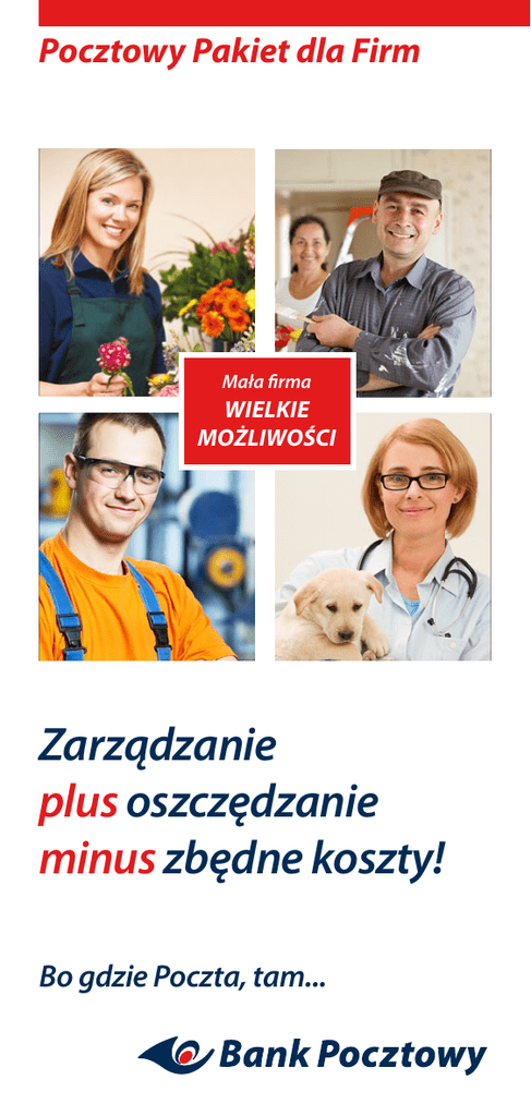 Pocztowy Pakiet dla Firm Mała firma Wielkie możliwości Zarządzanie plus oszczędzanie minus zbędne koszty! Bo gdzie Poczta, tam... Pocztowy Pakiet dla Firm Chcesz płynnie zarządzać finansami swojej firmy bez ponoszenia niepotrzebnych kosztów? Bank Pocztowy rozumie Cię doskonale. Dlatego oferujemy Ci proste i wygodne konta, z którymi prowadzenie firmy będzie łatwiejsze – a ich obsługa jest dostępna na każdej Poczcie! Pocztowe Konto Firmowe i Firmowe Konto Oszczędnościowe to idealne połączenie bieżącej obsługi finansowej firmy i sposobu na korzystne lokowanie nadwyżek finansowych. Pocztowe Konto Firmowe Firmowe Konto Oszczędnościowe to możliwość zarabiania na nadwyżkach finansowych bez ich zamrażania na lokacie: 0 zł za otwarcie i prowadzenie korzystne oprocentowanie porównywalne do oprocentowania lokat bankowych wpłacasz, ile i kiedy chcesz wypłacasz pieniądze bez utraty odsetek wypłata trzy razy w miesiącu bez opłat (raz w formie wypłaty gotówkowej, raz w formie przelewu zewnętrznego i raz wewnętrznego) to łatwe, tanie i wygodne zarządzanie finansami firmy na co dzień: 0 zł za otwarcie i prowadzenie 0 zł za bankowość internetową Pocztowy24 0 zł za wszystkie przelewy internetowe, w tym do ZUS i US 0 zł za wypłaty kartą z bankomatów w Polsce i za granicą Pocztowe Konto Firmowe oraz Firmowe Konto Oszczędnościowe założysz na każdej Poczcie, w placówkach Banku Pocztowego lub na www.pocztowy.pl a dodatkowo: dostęp do sieci wpłatomatów Euronet w całej Polsce obsługa przez Internet, telefon i na każdej Poczcie – gdziekolwiek jesteś w interesach! infolinia 801 100 500 www.pocztowy.pl Pozostałe produkty dla firm Zapytaj także o inne produkty Banku Pocztowego, stworzone z myślą o wielkich możliwościach Twojej firmy! Pocztowe Lokaty pozwolą Ci pomnażać oszczędności na korzystnych warunkach. Założysz je przez Internet, na każdej Poczcie oraz w każdej placówce Banku. Linia kredytowa w Pocztowym Koncie Firmowym zapewni Ci łatwy dostęp do gotówki na bieżące potrzeby i utrzymanie płynności finansowej Twojej firmy. Ekspresowy Kredyt Ratalny to kredyt, który możesz przeznaczyć na dowolny cel. Otrzymasz go szybko, bez uciążliwych formalności. Pieczątka placówki/Doradcy infolinia 801 100 500 52 34 99 499 z telefonów komórkowych opłaty zgodne z taryfą operatora www.pocztowy.pl