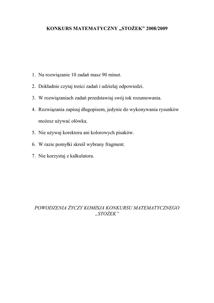 KONKURS MATEMATYCZNY „STOŻEK” 2008/2009 1. Na rozwiązanie 10 zadań masz 90 minut. 2. Dokładnie czytaj treści zadań i udzielaj odpowiedzi. 3. W rozwiązaniach zadań przedstawiaj swój tok rozumowania. 4. Rozwiązania zapisuj długopisem, jedynie do wykonywania rysunków możesz używać ołówka. 5. Nie używaj korektora ani kolorowych pisaków. 6. W razie pomyłki skreśl wybrany fragment. 7. Nie korzystaj z kalkulatora. POWODZENIA ŻYCZY KOMISJA KONKURSU MATEMATYCZNEGO „STOŻEK” ZADANIA Zadanie 1 Zegarek spóźnia się x sekund w ciągu każdych y godzin, x<60, y≥1. Dziś o ósmej rano wskazywał dokładny czas. Ile minut wyniesie spóźnienie zegarka po upływie 2 tygodni? Zadanie 2 Ile boków ma wielokąt foremny, którego każdy z kątów wewnętrznych ma miarę 1620? Zadanie 3 Starszy brat idzie z domu do szkoły 30 minut, a młodszy 40 minut. Po ilu minutach starszy brat dogoni młodszego brata, który wyruszył do szkoły 5 minut wcześniej? Zadanie 4 Co ile minut długa wskazówka zegara dogania krótką. Zadanie 5 Jaka jest reszta dzielenia liczby 32008 przez 5? Zadanie 6 Rozszyfruj działanie 4*KLMNP4=4KLMNP. Zadanie 7 Dwa okręgi o promieniach 10cm są styczne zewnętrznie. Ze środka lewego okręgu poprowadzono styczne do prawego okręgu. Jakie jest pole obszaru oznaczonego na rysunku literką P? P Zadanie 8 Stopiono dwa różne stopy cyny i ołowiu. Otrzymano 12 kg stopu, zawierającego 37,5% cyny. Ile kilogramów ważył pierwszy stop, jeżeli stosunek wagowy cyny do ołowiu w pierwszym stopie wynosił 2:3, a w drugim 3:7. Zadanie 9 Wykaż, że różnica czwartych potęg dwóch liczb całkowitych różniących się o 2 jest podzielna przez 8. Zadanie 10 W trójkącie prostokątnym punkt styczności okręgu wpisanego dzieli jedną z przyprostokątnych na odcinki 5 cm i 7 cm. Znaleźć długości drugiej przyprostokątnej i przeciwprostokątnej tego trójkąta. ROZWIĄZANIA (propozycja punktacji) Zadanie 1. x sekund y x w ciągu 2-ch tygodni spóźnienie wyniesie 336 sekund y 336 x 28 x czyli = ⋅ minut 60 y 5 y Zadanie 2. W ciągu jednej godziny zegarek spóźnia się o Analiza zadania (np. rysunek) – 2pkt – 2 pkt - 1 pkt – 1pkt Obliczenie miary kąta między ramionami trójkąta równoramiennego , z jakich składa się wielokąt 1800-1620=180 3600:180= 20 – ilość boków wielokąta - 3 pkt Poprawna odpowiedź - 1 pkt Zadanie 3. Analiza zadania (np. rysunek) s – odległość z domu braci do szkoły Ułożenie równania i prawidłowe rozwiązanie s s s ⋅x = + ⋅ x; 30 8 40 – 1 pkt – 3 pkt x = 15 Poprawna odpowiedź – 1 pkt Zadanie 4. Analiza zadania (np. rysunek) – 1 pkt Minutowa wskazówka w ciągu godziny zakreśla kąt 3600, czyli w ciągu 1 min. - 60 Godzinowa wskazówka w ciągu godziny zakreśla kąt 300, czyli w ciągu 1 min. – 0,50 Obie wskazówki pokryją się, gdy różnica kątów wyniesie 3600 – 1 pkt Rozwiązując równanie 6t-0,5t=3600 ; t - szukany czas 5 Otrzymujemy t= 65 ≈ 65 minut 11 Poprawna odpowiedź – 1 pkt – 1 pkt – 1 pkt Zadanie 5. 31=3 32=9 33=27 34=81 35=…3 Ostania cyfra potęgowania 3 to kolejno: 3, 9, 7, 1, 3,…itd. 2008:4=502 reszty 0, czyli ostatnia cyfra tej liczby to 1, toteż reszta z dzielenia przez 5 wynosi 1 Zadanie 6 Zadanie rozwiązujemy stosując zapis pisemny mnożenia 4*KLMNP4=4KLMNP, z którego wynika P=6, bo 4*4=16 i 1 przechodzi dalej toteż N=5, bo 4*6=24 4+1=5 i 2 przechodzi dalej - 2 pkt - 1 pkt - 1pkt – 1 pkt 1 pkt W analogiczny sposób wyznaczamy kolejne literki Ostatecznie: K=1, L=0, M=2, N=5, P=6 Wyznaczenie poprawne wszystkich liter 4 pkt Jeżeli sposób myślenia jest poprawny, tylko występują błędy obliczeniowe 3 pkt Zadanie 7 Analiza - 1 pkt P A O1 O2 B C O1O2 = 20 O2 C = 10 stąd wycinki AO1B i AO2C stanowią ∠O1O2 C = 60 0 Zatem pole zacieniowanego obszaru wynosi: 1 1 i kół odpowiednio. – 2pkt 12 6 1 202 3 1 1 P = PO1O2C − PAO1B − PAO2C = ⋅ − π ⋅102 − π ⋅102 = 2 4 12 6 = 50 3 − 25π = 25(2 3 − π ) Poprawna odpowiedź i obliczenia pkt -2 Zadanie 8 x – waga I stopu, y – waga II stopu 2:5=0,4=40% - zawartość cyny w I stopie 3:10=0,3=30% - zawartość cyny w II stopie – 1 pkt x+y=12 0,4x+0,3y=0,375*12 – 2 pkt ułożenie równań Rozwiązanie układu równań i podanie poprawnej odpowiedzi x=9kg, y=3kg – 2 pkt Zadanie 9 Założenie: n∈C – całkowitych Teza: n4 – (n-2)4 dzieli się przez 8 – 2 pkt Po obliczeniach otrzymujemy 8(n-2)(n2-2n+2), czyli liczba ta jest podzielna przez 8 – 3 pkt Zadanie 10 Odpowiedni rysunek 12cm – I przyprostokątna 5+x - II przyprostokątna 7+x - przeciwprostokątna 7cm – 1 pkt 7cm X 5cm X 5cm 2 2 Wykorzystanie twierdzenia Pitagorasa: 12 +(5+x) =(7+x) Obliczenie x=30 Podanie długości boków trójkąta 12cm, 35cm, 37cm 2 - 2 pkt – 1 pkt – 1 pkt Prawidłowo zrobione zadanie punktujemy maksymalnie (5 pkt) bez względu na metodę rozwiązania.