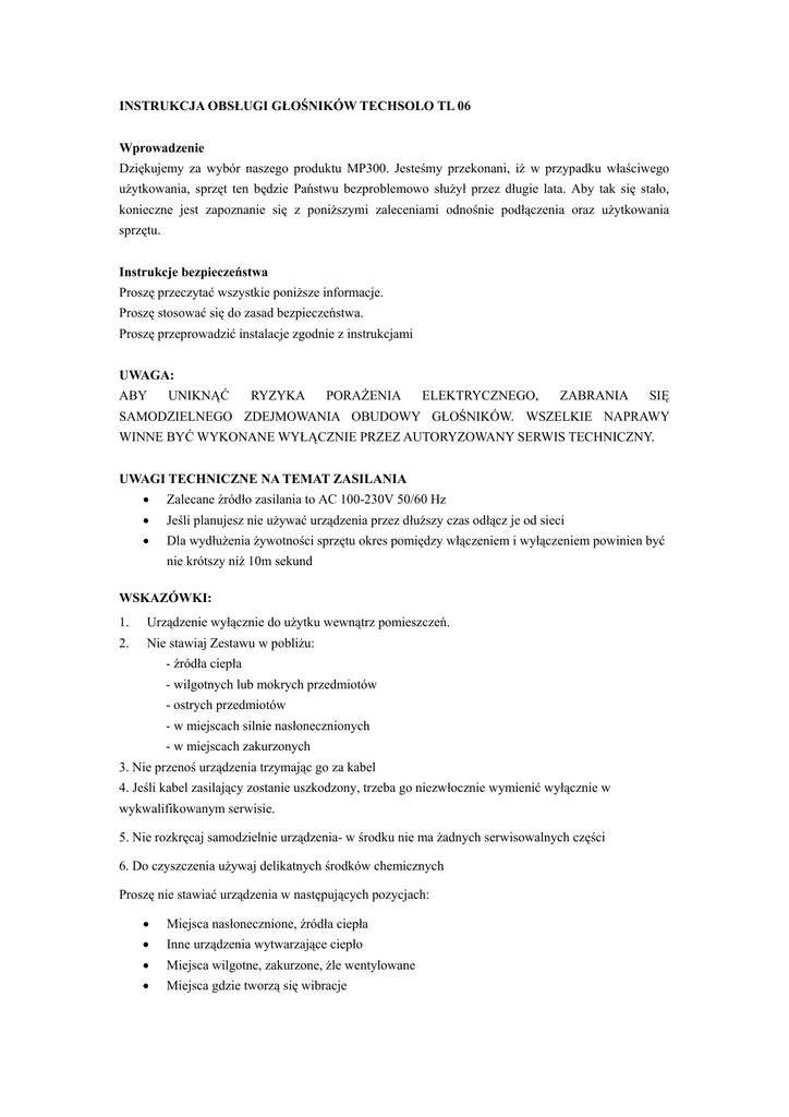 INSTRUKCJA OBSŁUGI GŁOŚNIKÓW TECHSOLO TL 06 Wprowadzenie Dziękujemy za wybór naszego produktu MP300. Jesteśmy przekonani, iż w przypadku właściwego użytkowania, sprzęt ten będzie Państwu bezproblemowo służył przez długie lata. Aby tak się stało, konieczne jest zapoznanie się z poniższymi zaleceniami odnośnie podłączenia oraz użytkowania sprzętu. Instrukcje bezpieczeństwa Proszę przeczytać wszystkie poniższe informacje. Proszę stosować się do zasad bezpieczeństwa. Proszę przeprowadzić instalacje zgodnie z instrukcjami UWAGA: ABY UNIKNĄĆ RYZYKA PORAŻENIA ELEKTRYCZNEGO, ZABRANIA SIĘ SAMODZIELNEGO ZDEJMOWANIA OBUDOWY GŁOŚNIKÓW. WSZELKIE NAPRAWY WINNE BYĆ WYKONANE WYŁĄCZNIE PRZEZ AUTORYZOWANY SERWIS TECHNICZNY. UWAGI TECHNICZNE NA TEMAT ZASILANIA • Zalecane źródło zasilania to AC 100-230V 50/60 Hz • Jeśli planujesz nie używać urządzenia przez dłuższy czas odłącz je od sieci • Dla wydłużenia żywotności sprzętu okres pomiędzy włączeniem i wyłączeniem powinien być nie krótszy niż 10m sekund WSKAZÓWKI: 1. Urządzenie wyłącznie do użytku wewnątrz pomieszczeń. 2. Nie stawiaj Zestawu w pobliżu: - źródła ciepła - wilgotnych lub mokrych przedmiotów - ostrych przedmiotów - w miejscach silnie nasłonecznionych - w miejscach zakurzonych 3. Nie przenoś urządzenia trzymając go za kabel 4. Jeśli kabel zasilający zostanie uszkodzony, trzeba go niezwłocznie wymienić wyłącznie w wykwalifikowanym serwisie. 5. Nie rozkręcaj samodzielnie urządzenia- w środku nie ma żadnych serwisowalnych części 6. Do czyszczenia używaj delikatnych środków chemicznych Proszę nie stawiać urządzenia w następujących pozycjach: • Miejsca nasłonecznione, źródła ciepła • Inne urządzenia wytwarzające ciepło • Miejsca wilgotne, zakurzone, żle wentylowane • Miejsca gdzie tworzą się wibracje OTWARCIE PUDEŁKA Z PRODUKTEM W przypadku stwierdzenia niezgodności produktu lub braku niezbędnych części lub uszkodzenia, prosimy niezwłocznie skontaktować się ze sprzedawcą. ZAWARTOŚĆ OPAKOWANIA: 1 x Sub Woofer 2 x Głośniki satelity (z kablami) 1x AC Adapter 2 x Kabel Audio 1 x Instrukcja obsługi WIDOK TYLNEGO PANELU PODŁĄCZENIE Podłącz głośniki satelitarne rys, nr.(2) do gniazda SPEAKER. Proszę zawsze podłączać WSZELKIE WTYCZKI DELIKATNIE. 1. Podłącz kabel Audio (1), jeden koniec do gniazda Line In; drugi do urządzenia audio- tj. notebooka, komputera, wieży, MP3 itd.. 2. Podłącz zasilacz (4) do gniazda DC IN (3). Po wykonaniu tych czynności system jest gotowy do użytku i pozostaje w trybie standby. ODTWARZANIE Rysunek głośnika satelitarnego: UWAGA: Na górze głośnika umieszczone są przyciski Volume UP (+) i DOWN (-), po naciśnięciu jednego z nich uruchamia się system. Aby przejść do opcji Standby (Uśpienie), Proszę przycisnąć jednocześnie przyciski Volume UP (+) i DOWN (-), Aby wyjść z opcji uśpienia, należy wcisnąć obydwa przyciski ponownie. Kiedy system zostanie zaktywowany: Proszę wcisnąć przycisk (+) lub (-) aby ustawić rządany poziom głośności. Gdy system jest w trybie standby, dioda LED na subwooferze będzie migać pulsacyjnie. ROZWIĄZYWANIE PROBLEMÓW 1. Brak dźwięku z któregokolwiek głośnika? 2. Czy system jest podłączony do zasilania?- sprawdź to.- jeśli tak powinna palić się niebieska dioda. 3. Czy przyciski ustawienia głośności nie są wyciszone?- sprawdź. Sprawdź czy wewnętrzny system do obsługi audio w twoim komputerze nie jest wyciszony? 4. Upewnij się czy głośniki nie są w fazie wyciszenia (jednoczesne przyciśnięcie przycisków głośności uruchamia lub wyłącza tą opcje). 5. Sprawdź czy niebieska dioda subwoofera pali się światłem ciągłym, czy pulsacyjnym. Światło ciągłe oznacza, iż system NIE znajduje się w opcji wyciszenia (MUTE). 6. Czy kable są właściwie podłączone? 7. Sprawdź czy do głośników dociera sygnał audio- w tym celu podłącz inne niż obecne źródło odtwarzania (CD, MP3 itd) Dźwięk tylko z części systemu? Proszę upewnić się czy wtyczka "S" łącząca obydwa głośniki satelity, jest wpięta do odpowiedniego gniazda na podstawie subwoofera. Jeśli w dalszym ciągu nie ma odpowiedniego sygnału, podłącz inne urządzenie audio ( discman, odtwarzacz CD itd.) Jeśli system zadziała poprawnie- to oznacza, iż pierwotne urządzenie audio jest uszkodzone. Podczas odtwarzania CD na komputerze może okazać się, że gra tylko jeden głośnik- takie sytuacje zdarzają się przy nowych komputerach. Podczas odtwarzania muziki gra tylko jedna satelita- ale podczas gry, lub odtwarzania formatu WAV, wszystko gra prawidłowo? Powodem jest brak połączenia CD Romu z kartą dźwiękową lub został źle podłączony. Proszę użyć instrukcji CD Romu- aby podłączyć porawnie urządzenie. Osłona magnetyczna głośników To pojęcie oznacza, iż głośniki zostały tak skonstruowane żeby wytwarzać jak najmniejsze pole magnetyczne, które w zbyt dużym natężeniu może spowodować zakłócenia pracy Np monitora. Minimalna odległość od monitora powinna wynosić od 0,2- 1 m. SPECYFIKACJA TECHNICZNA: Moc wyjściowa: RMS 2.5W×2+9W (THD=10%) Skuteczność (Amplifier): > 85dBA > 5KOhm Wejście Impedance: Input Sensitivity: Auto-Intelligent Sensitivity Adjustment Wejście- Port: 3.5mm Stereo Jack. Zakres częstotliwości : Bass - Subwoofer: Satelity: 75Hz-20kHz 2" woofer heat treated paper voice coil , 4Ohm, Magnetically Shielded 1.5" M.F./ H.F . with heat treated paper voice coil , 4Ohm, Magnetically Shielded Wymiary- Subwoofer: 260 (W)×84 (H)× 59 (D) mm Satelity: 57 (W) × 63(H) × 57(D) mm Waga: Ok .4 Kg Zasilanie: DC 12 Volt AC Zasilacz: 220V-240V ~, 50/60Hz (for ModelEuropean/ China/Korea/South America, etc.) 100V-120V ~, 50/60Hz (for Model USA/Canada/Japan ) Do użytku z: Laptop, Telefony komórkowe, Komputery multimedialne (2 kanałowa karta dźwiękowa), Odtwarzacze CD, Discma