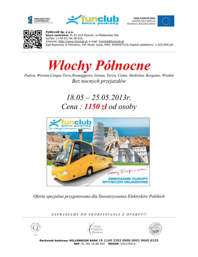 FUNCLUB Sp. z o.o. biuro centralne: PL 61-614 Poznań, ul.Mołdawska 30a tel/fax: (+48 61) 66 28 616 Internet: http://www.funclub.pl; e-mail: [email protected] Sąd Rejonowy w Poznaniu, XXI Wydz. Gosp. KRS: 0000007210; Kapitał zakładowy: 1.025.000 pln Włochy Północne Padwa, Werona,Cinque Terre,Riomaggiore, Genua, Turyn, Como, Mediolan, Bergamo, Wiedeń Bez nocnych przejazdów 18.05 – 25.05.2013r. Cena : 1150 zł od osoby Oferta specjalna przygotowana dla Stowarzyszenia Elektryków Polskich Z A P R A S Z A M Y D O S K O R Z Y S T A N I A Z O F E R T Y !!! Rachunek bankowy: MILLENNIUM BANK 19 1160 2202 0000 0001 9665 6225 NIP: PL 781 16 89 453 REGON: 634176314 FUNCLUB Sp. z o.o. biuro centralne: PL 61-614 Poznań, ul.Mołdawska 30a tel/fax: (+48 61) 66 28 616 Internet: http://www.funclub.pl; e-mail: [email protected] Sąd Rejonowy w Poznaniu, XXI Wydz. Gosp. KRS: 0000007210; Kapitał zakładowy: 1.025.000 pln W cenie zapewniamy: Zakwaterowanie w pokojach 2, 3 osobowych 7 noclegów w hotelach**/*** 7 śniadań Ubezpieczenie KL, NW Zwiedzanie Włoch wg programu Transport autokarem Royal Opieka pilota. Class (barek, klimatyzacja, DVD, toaleta), Dodatkowo płatne obowiązkowo: Dopłata do wyżywienia HB (6 obiadokolacji) – 60 euro płatne w autokarze Bilety wstępu do zwiedzanych obiektów, zestawy słuchawkowe, wjazdy do miast oraz miejscowi przewodnicy około 80 euro/os Zakwaterowanie: W trakcie zwiedzania zakwaterowanie w hotelach**/***. W każdym z hoteli zakwaterowanie w pokojach 2, 3 osobowych z łazienkami. Wyżywienie: W cenie 7 śniadań kontynentalnych serwowanych. Obiadokolacje serwowane, dwudaniowe. Napoje do obiadokolacji dodatkowo płatne. Transport: Transport autokarem z Polski (wyjazd z Kalisza – miejsce i dokładna godzina zbiórki do ustalenia) Przejazd przez Czechy, Austrię i Włochy. Przyjazd do Włoch w godzinach późno wieczornych. Program ramowy: 1 dzień (sobota) - wyjazd z Polski (Kalisz) około godziny 5 – 6 rano. Przejazd na nocleg w okolice Padwy. 2 dzień (niedziela) – śniadanie, przejazd na zwiedzanie Padwy, urokliwego miasta uniwersyteckiego, które przez około 600 lat, wykształciło niezliczone włoskie umysły. Dante, Petrarka i Galileusz to tylko trzy nazwiska spośród 40 000 poprzedników studentów, którzy dziś ożywiają to niewielkie miasteczko. W programie zwiedzania: wizyta w bazylice św. Antoniego, spacer po historycznym centrum i Piazza delle Erbe. Następnie przejazd na zwiedzanie Werony, która swoją popularność zdobyła dzięki roli w sztuce angielskiego dramaturga Wiliama Szekspira – „Romeo i Julii”. Dom Julii, a w szczególności jej balkon, to jeden z najbardziej znanych zabytków we Włoszech. W trakcie zwiedzania planowany jest spacer od rzymskiego amfiteatru Arena przez Piazza dei Signori do Casa Capuletti. Przejazd do hotelu na obiadokolację i nocleg. 3 dzień (poniedziałek) - po śniadaniu wyjazd na zwiedzanie Cinque Terre i rozpoczęcie jednej z najpiękniejszych Z A P R A S Z A M Y D O S K O R Z Y S T A N I A Z O F E R T Y !!! Rachunek bankowy: MILLENNIUM BANK 19 1160 2202 0000 0001 9665 6225 NIP: PL 781 16 89 453 REGON: 634176314 FUNCLUB Sp. z o.o. biuro centralne: PL 61-614 Poznań, ul.Mołdawska 30a tel/fax: (+48 61) 66 28 616 Internet: http://www.funclub.pl; e-mail: [email protected] Sąd Rejonowy w Poznaniu, XXI Wydz. Gosp. KRS: 0000007210; Kapitał zakładowy: 1.025.000 pln przygód, jakimi uraczyć może Italia. Ludzie, tradycja, krajobraz, architektura zawieszonych lub wciętych w klify kolorowych wiosek. To wszystko zostało wpisane na listę UNESCO jako obszar chroniony krajobrazu kulturowego. W programie przejazd pociagiem lub statkiem do Riomaggiore, znanego z wielu cudownych pocztówek, następnie spacer Drogą Miłości do Manaroli. Czas wolny na kąpiel i plażowanie. Przejazd na obiadokolację i nocleg w okolicach Genui. 4 dzień (wtorek) - po śniadaniu zwiedzanie Genui, największego z włoskich portów, jednego z najbogatszych miast. W programie zwiedzanie gotyckiej katedry San Lorenzo, spacer obok domu Krzysztofa Kolumba na Piazza Ferrari, via Garibaldi z pięknymi pałacami, cmentarz Stajen. Po zwiedzaniu przejazd do Turynu jednego z najważniejszych centrów przemysłowych Włoch. Mimo przemysłowego charakteru miasta, zachowało się wiele zabytków - przede wszystkim kościołów i pałaców. Zwiedzimy m.in. :kościół San Domenico z I połowie XIV w., barokowe kościoły San Carlo i San Lorenzo w XVII w. Wśród licznych pałaców miasta najpiękniejszymi obiektami są: Pałac Królewski z XVII w., Palazzo dell'Academia delle Scienze z XVII w., Palazzo Madama z XII-XV w., ze zbiorami Muzeum Sztuki Antycznej. Najcenniejszą kolekcję spośród muzeów miasta posiada Muzeum Egipskie, którego zbiory ustępują jedynie Muzeum Kairskiemu. Park miejski (Parco del Valentino) jest jednocześnie skansenem wsi piemonckiej. Przejazd do hotelu, obiadokolacja, nocleg. 5 dzień (środa) - po śniadaniu przejazd na zwiedzanie Como. Swego czasu Madonna wpadała tu w odwiedziny do Gianniego Versace, a teraz Brad Pitt chętnie odwiedza swojego przyjaciela George'a Clooneya. Como to porośnięty palmami raj na ziemi. W programie: spacer po centrum, rejs statkiem z Lezzeno do kolorowych grot i nad wodospad Nesso. Czas wolny, odpoczynek na plaży. Woda jest tak czysta, że widać, jak pływają w niej metrowej długości ryby, zaś wysoka temperatura przy brzegu zachęca do kąpieli. Przejazd do hotelu, obiadokolacja, nocleg. 6 dzień (czwartek) - po śniadaniu przejazd na zwiedzanie Mediolanu – w programie m.in. : Plac Katedralny i Katedra Duomo - jedna z trzech największych katedr na świecie ,Pałac Królewski (Palazzo Reale) - była rezydencja królewska ,La Scala - najsłynniejsza opera świata ,Narodowe Muzeum Nauki i Techniki - poświęcone wynalazkom Leonarda da Vinci .Bazylika Św. Ambrożego - jeden z najpiękniejszych kościołów romańskich. Galeria Vittorio Emanuele - najstarsze i n