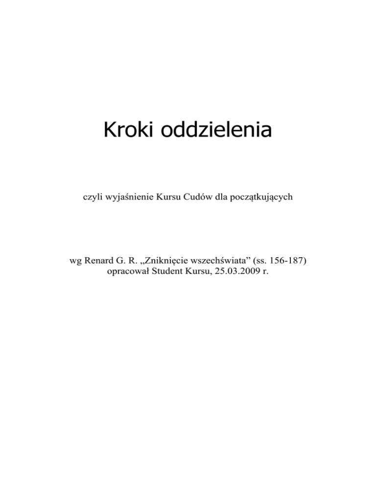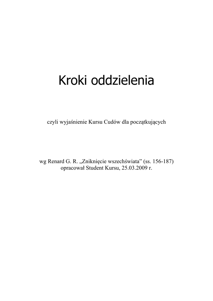 Kroki oddzielenia czyli wyjaśnienie Kursu Cudów dla początkujących wg Renard G. R. „Zniknięcie wszechświata” (ss. 156-187) opracował Student Kursu, 25.03.2009 r. Spis treści Wstęp - Wieczna Jednia Ojca i Syna .................................................................... 3 1. Pierwszy krok oddzielenia - pojawienie się indywidualności .......................... 5 a) Idea odosobnienia .......................................................................................... 5 b) Oddzielenie jest pozorne ............................................................................... 7 c) Nondualizm.................................................................................................... 7 d) Pojawienie się świadomości .......................................................................... 9 2. Drugi krok oddzielenia – pojawienie się wyboru między Duchem św. a ego 10 3. Trzeci krok oddzielenia – utożsamienie z ego ................................................ 12 a) Trzy kroki oddzielenia w skrócie ................................................................ 12 Pierwszy krok................................................................................................... 12 Drugi krok ........................................................................................................ 13 Trzeci krok ....................................................................................................... 13 b) Jak możliwy jest błąd popełniony przez Boga? .......................................... 13 c) Krok trzeci oddzielenia - ciąg dalszy........................................................... 15 d) Trzy kroki oddzielenia w dużym skrócie .................................................... 15 4. Czwarty krok oddzielenia – pojawienie się świata ......................................... 15 5. Piąty krok oddzielenia – pojawienie się ciała ................................................. 20 6. Wszechświat i ciało ......................................................................................... 21 2 Wstęp - Wieczna Jednia Ojca i Syna Zastanów się, czym jesteś i skąd przyszedłeś, a potem będziesz mógł zdecydować, jak szybko chcesz się dostać tam, dokąd w rzeczywistości zmierzasz. Zaczniemy od krótkiej historii, której — gdyby nie informacje w KURSIE — pozostawałbyś niepomny. Nie oszukuj siebie; to twój przywilej uczyć się o tych sprawach. Bez Autora pozostałyby na zawsze nieuświadomione. Choć o nich usłyszysz, nadal będą pozostawać przeważ- nie nieuświadomione. Gdy będziemy iść naprzód, będziesz miał przynajmniej szansę odnaleźć z pomocą Ducha Świętego swoją powrotną drogę przez zasłony zapomnienia; tam, gdzie rzeczywiście jest twoje miejsce. Symbole naprawdę nie są w stanie wyrazić tego, co na pozór poprzedziło uczynienie wszechświata. Ogrom ponadczasowego umysłu jest dalece zbyt wielki, by wyrazić go słowami. Jednak możemy dać ci przebłysk tego, co rzeczywiście kryje się za tak zwanym upadkiem człowieka, który wielu nazwało grzechem pierworodnym. Możemy ci powiedzieć, czym było coś, co doprowadziło do tego, co nazywasz Wielkim Wybuchem. Żaden naukowiec nigdy nie będzie zdolny odtworzyć niczego przed nim inaczej niż teoretycznie. Lecz można przypomnieć sobie sam początek i zmienić swoje myślenie o nim. Jednak nie jest konieczne, byś przypomniał sobie sam początek, ponieważ w rzeczywistości zmienisz swoje myślenie przebaczając symbole tego początku. Tak więc twoje zbawienie zawsze zależało i będzie zależeć od decyzji, które podejmujesz właśnie teraz. Przed początkiem, nie było początków ani końców; było tylko wieczne Zawsze, które wciąż jest i zawsze będzie. Było jedynie uprzytamnianie sobie nieskazitelnej jedności, a ta jedność była tak zupełna, tak przejmująca nabożną czcią i nieograniczona w swym radosnym szerzeniu, że dla czegokolwiek byłoby niemożliwe uprzytomnić sobie coś innego, co nie byłoby Nią Samą. Był i jest jedynie Bóg w tej rzeczywistości, którą nazywamy Niebem. Co Bóg tworzy w Swoim Siebie Samego szerzeniu, jest nazywane Chrystusem. Lecz Chrystus nie jest w jakikolwiek sposób osobny czy różny od Boga. Jest dokładnie tym samym. Chrystus nie jest częścią Boga, Jest rozszerzeniem tego, 3 co całe. Rzeczywista Miłość musi być podzielana i doskonała Miłość podzielana w Bożym Wszechświecie przekracza jakiekolwiek ludzkie pojmowanie. Jedyna możliwa różnica między Chrystusem a Bogiem — gdyby takowa różnica była możliwa, byłaby taka, że Bóg stworzył Chrystusa; On jest Autorem, Chrystus nie stworzył Boga ani Siebie. Ze względu na ich doskonałą jedność, nie ma to żadnego znaczenia w Niebie. Bóg stworzył Chrystusa, by był dokładnie jak Bóg i podzielał Jego wieczną Miłość oraz radość w stanie niczym nie skrępowanej, niezmiernej i niewyobrażalnej ekstazy. W odróżnieniu od konkretnego, szczególnego świata, w którym wydajesz się być teraz, ten stały i fascynujący stan uprzytamniania sobie jest zupełnie abstrakcyjny, wieczny, nie zmieniający się i zjednoczony. Chrystus też szerzy Siebie tworząc nowe Stworzenia lub jednoczesne rozszerzenia tego, co całe, które również są dokładnie takie same w swojej doskonałej jedności z Bogiem i Chrystusem. W ten sposób Chrystus, jak Bóg, również tworzy, ponieważ To jest dokładnie takie samo jak Bóg. Te rozszerzenia nie są tworzone do wewnątrz czy na zewnątrz, ponieważ w Niebie nie ma pojęcia przestrzeni; jest jedynie „wszędzie". Wynikiem tego wszystkiego jest przekraczające rozumienie, nie kończące się podzielanie doskonałej Miłości. 4 1. Pierwszy krok oddzielenia - pojawienie się indywidualności a) Idea odosobnienia Raptem coś wydaje się dziać, jak we śnie — nie zdarza się rzeczywiście — po prostu wydaje się zdarzać. Przez chwilę, tylko je