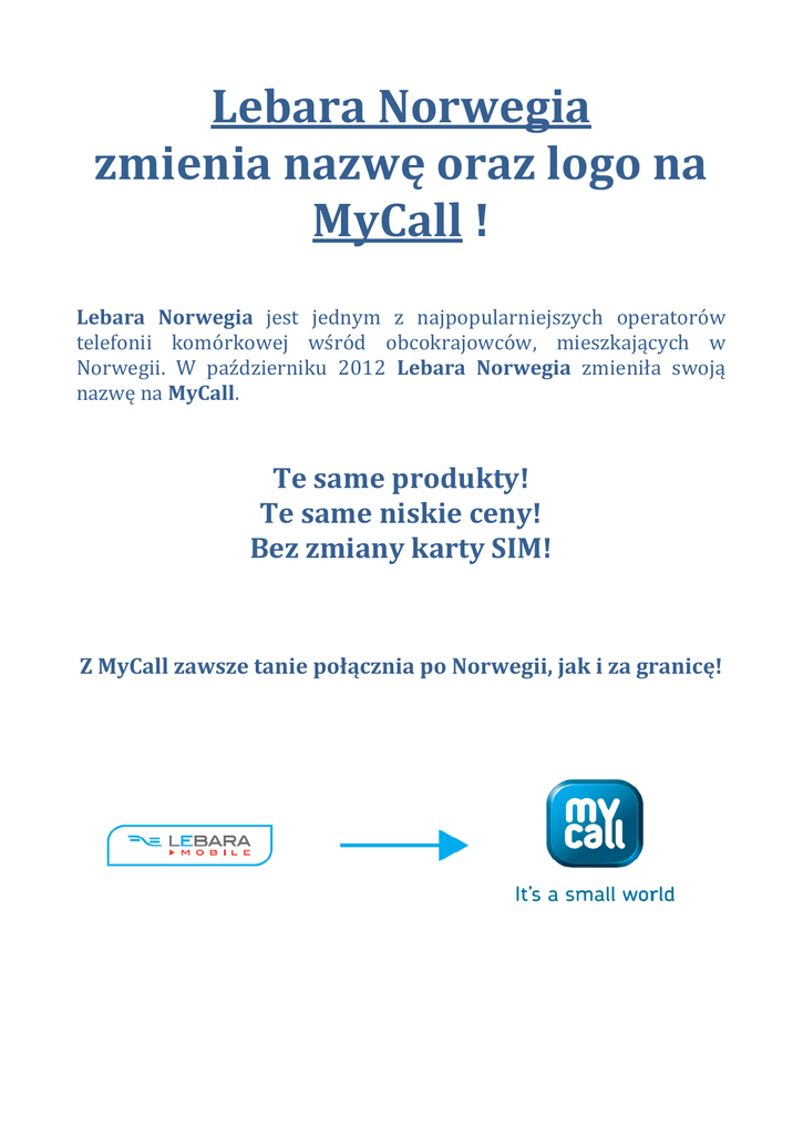 Lebara Norwegia zmienia nazwę oraz logo na MyCall ! Lebara Norwegia jest jednym z najpopularniejszych operatorów telefonii komórkowej wśród obcokrajowców, mieszkających w Norwegii. W październiku 2012 Lebara Norwegia zmieniła swoją nazwę na MyCall. Te same produkty! Te same niskie ceny! Bez zmiany karty SIM! Z MyCall zawsze tanie połącznia po Norwegii, jak i za granicę! Karta prepaid – MyCall Venner Kontant Karta startowa MyCall Venner Kontant kosztuje 49 kr. Na koncie jest już 25 kr do wykorzystania. Kartę MyCall Venner Kontant można kupić w jednym z naszych punktów sprzedaży, zamówić na stronie internetowej MyCall www.MyCall.no, a także znaleźć na portalu aukcyjnym www.allegro.pl. Należy pamiętać, iż prawo norweskie nakazuje rejestrację każdej karty prepaid. Posiadając norweski numer personalny ID, można dokonać rejestracji na stronie www.MyCall.no, dzwoniąc do Biura Obslugi Klienta na nr 06160 lub wysyłając SMS na nr 06160 o tresci: NAME + imię i nazwisko + norweski numer personalny (11 cyfr). Np.: NAME Jan Kowalski 30097877135. Ci, którzy nie posiadają norweskiego ID, mogą zarejestrować kartę MyCall Venner Kontant, wypełniając formularz dostępny w punkcie zakupu karty. Rodzaje doładowań – jaki wybrać? Będąc użytkownikiem MyCall Venner Kontant, możesz wybrać taryfę, dopasowując ją do swoich potrzeb. W każdej chwili możesz zmienić taryfę, doładowując swoje konto innym rodzajem doładowania Ladekort. Możesz wybrać jedną z dwóch opcji: Ladekort WORLD – dla dzwoniących w większości za granicę. Ladekort NORDEN – dla dzwoniących w większości po Noregii oraz krajach nordyckich. Bez względu na wybraną taryfę, masz do wykorzystania 300 bezpłatnych minut Venner każdego mięsiąca, na połącznienia MyCall – MyCall. Pamiętaj, że za każdym razem doładowując swoje konto na stronie www.MyCall.no, otrzymujesz aż do 15% extra! Abonament miesięczny – MyCall Fastpris+ Karta kredytowa czy Faktura? Płać jak ci wygodnie! Wybór należy do ciebie! • • • • • Darmowe minuty po Norwegii Darmowe minuty do ponad 100 krajów Darmowe SMS po Norwegii, jak i za granicę Darmowe MMS po Norwegii, jak i za granicę Darmowe MB Bez umów wiążących na kilka lat! Możesz sam wybrać metodę płatności: Faktura Karta kredytowa – bez wymaganej zdolności kredytowej! Zamów łatwo i szybko! Nasze abonamenty możesz zamówić na naszej stronie www.MyCall.no lub dzwoniąc na nasze Biuro Obsługi Klienta na nr 06160. Nasze Biuro Obsługi Klienta oferuje pomoc w ponad 20 językach! Przenieś się do MyCall, zatrzymując jednocześnie swój dotychczasowy numer telefonu! Jeżeli posiadasz już norweski numer telefonu, w każdej chwili możesz go przenieść do MyCall, otrzymując jednocześnie BONUS 100 nok! Więcej informacji na ten temat można znaleźć na stronie www.MyCall.no lub dzwoniąc do nas na nr 06160. Gdzie można znaleźć produkty MyCall? Online na www.MyCall.no Sklep MyCall – Brugata 1, Oslo Punkty sprzedaży MyCall: Informujemy, że tylko Lebara Norwegia zmieniła nazwę oraz logo na MyCall. Firma Lebara nadal istnieje w pozostałych krajach, tj.: UK, Niemcy, Dania, Francja, Holandia, Hiszpania,l Szwajcaria oraz Australia.