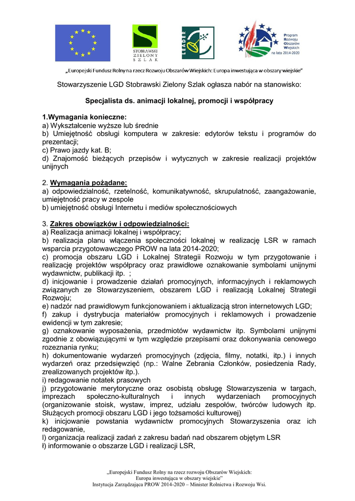 Stowarzyszenie LGD Stobrawski Zielony Szlak ogłasza nabór na stanowisko: Specjalista ds. animacji lokalnej, promocji i współpracy 1.Wymagania konieczne: a) Wykształcenie wyższe lub średnie b) Umiejętność obsługi komputera w zakresie: edytorów tekstu i programów do prezentacji; c) Prawo jazdy kat. B; d) Znajomość bieżących przepisów i wytycznych w zakresie realizacji projektów unijnych 2. Wymagania pożądane: a) odpowiedzialność, rzetelność, komunikatywność, skrupulatność, zaangażowanie, umiejętność pracy w zespole b) umiejętność obsługi Internetu i mediów społecznościowych 3. Zakres obowiązków i odpowiedzialności: a) Realizacja animacji lokalnej i współpracy; b) realizacja planu włączenia społeczności lokalnej w realizację LSR w ramach wsparcia przygotowawczego PROW na lata 2014-2020; c) promocja obszaru LGD i Lokalnej Strategii Rozwoju w tym przygotowanie i realizację projektów współpracy oraz prawidłowe oznakowanie symbolami unijnymi wydawnictw, publikacji itp. ; d) inicjowanie i prowadzenie działań promocyjnych, informacyjnych i reklamowych związanych ze Stowarzyszeniem, obszarem LGD i realizacją Lokalnej Strategii Rozwoju; e) nadzór nad prawidłowym funkcjonowaniem i aktualizacją stron internetowych LGD; f) zakup i dystrybucja materiałów promocyjnych i reklamowych i prowadzenie ewidencji w tym zakresie; g) oznakowanie wyposażenia, przedmiotów wydawnictw itp. Symbolami unijnymi zgodnie z obowiązującymi w tym względzie przepisami oraz dokonywania cenowego rozeznania rynku; h) dokumentowanie wydarzeń promocyjnych (zdjęcia, filmy, notatki, itp.) i innych wydarzeń oraz przedsięwzięć (np.: Walne Zebrania Członków, posiedzenia Rady, zrealizowanych projektów itp.). i) redagowanie notatek prasowych j) przygotowanie merytoryczne oraz osobistą obsługę Stowarzyszenia w targach, imprezach społeczno-kulturalnych i innych wydarzeniach promocyjnych (organizowanie stoisk, wystaw, imprez, udziału zespołów, twórców ludowych itp. Służących promocji obszaru LGD i jego tożsamości kulturowej) k) inicjowanie powstania wydawnictw promocyjnych Stowarzyszenia oraz ich redagowanie, l) organizacja realizacji zadań z zakresu badań nad obszarem objętym LSR ł) informowanie o obszarze LGD i realizacji LSR, „Europejski Fundusz Rolny na rzecz rozwoju Obszarów Wiejskich: Europa inwestująca w obszary wiejskie” Instytucja Zarządzająca PROW 2014-2020 – Minister Rolnictwa i Rozwoju Wsi. m) współpraca z innymi lokalnymi grupami działania/organizacjami w celu znalezienia partnera do wspólnej realizacji projektu/ów współpracy oraz innych działań promocyjnych, n) przygotowywanie wniosków o przyznanie pomocy finansowej PROW oraz innych organizacji i instytucji udzielających dotacji, grantów w ramach ogłoszonych konkursów, o) bieżący monitoring zapisanych w LSR wskaźników produktu, rezultatu i oddziaływania dotyczących projektów współpracy oraz innych działań, p) przygotowanie wniosków o płatność i końcowego rozliczenia projektów współpracy, r) realizacja umów i monitorowanie wydatków związanych realizacją projektów współpracy oraz innych działań, s) sumienne prowadzenie dokumentacji dotyczącej realizowanych na stanowisku zadań, t) zabezpieczenie i dbałość o przestrzeganie danych i tajemnic ustawowo chronionych, u) terminowe załatwianie spraw w) prowadzenie doradztwa dla beneficjentów w sprawie warunków i możliwości otrzymania dofinansowania x) obsługa Stobrawskiego Centrum Produktu Turystycznego i Kulturowego utworzonego w ramach projektu współpracy y) inne zadania wynikające z bieżących potrzeb biura 4. Warunki zatrudnienia: a) wymiar czasu pracy – pełen etat 5. Miejsce pracy: Stowarzyszenie Lokalna Grupa Działania Stobrawski Zielony Szlak ul. Sienkiewicza 8, 46-034 Pokój 6. Etapy naboru: a) złożenie dokumentów przez kandydatów – ocena formalna b) zaproszenie na rozmowę kwalifikacyjną c) ogłoszenie o wyborze kandydata 7. Wymagane dokumenty: a) życiorys (CV), z uwzględnieniem dotychczasowego przebiegu kariery, b) kserokopie dyplomów, świadectw pracy oraz innych dokumentów potwierdzających posiadanie kwalifikacje i umiejętności, c) oświadczenie o niekaralności za przestępstwa umyślne, d) kwestionariusz osobowy Wymagane dokumenty aplikacyjne należy składać osobiście w siedzibie Biura Stowarzyszenia ul. Sienkiewicza 8, 46-034 Pokój w zamkniętej kopercie z dopiskiem: „Dotyczy naboru na stanowisko Specjalista ds. animacji lokalnej, promocji i współpracy w terminie do dnia 16.01.2017 r. „Europejski Fundusz Rolny na rzecz rozwoju Obszarów Wiejskich: Europa inwestująca w obszary wiejskie” Instytucja Zarządzająca PROW 2014-2020 – Minister Rolnictwa i Rozwoju Wsi. Aplikacje, które wpłyną do Biura Stowarzyszenia po wyżej określonym terminie nie będą rozpatrywane. Informacja o wynikach naboru będzie umieszczona na stronie internetowej www.stobrawskiszlak.pl Wymagane dokumenty aplikacyjne: list motywacyjny, szczegółowe CV (z uwzględnieniem dokładnego przebiegu kariery zawodowej), powinny być opatrzone klauzulą: Wyrażam zgodę na przetwarzanie moich danych osobowych zawartych w ofercie pracy dla potrzeb niezbędnych do realizacji procesu rekrutacji zgodnie z ustawą z dnia 29 sierpnia 1997r. o ochronie danych osobowych (Dz.U.z 2002r. Nr 101,poz. 926 z późn. zm.) oraz podpisane. Datę, godzinę telefonicznie. i miejsce rozmów kwalifikacyjnych podamy zainteresowanym (-) Kierownik Biura LGD Jadwiga Kulczycka „Europejski Fundusz Rolny na rzecz rozwoju Obszarów Wiejskich: Europa inwestująca w obszary wiejskie” Instytucja Zarządzająca PROW 2014-2020 – Minister Rolnictwa i Rozwoju Wsi.