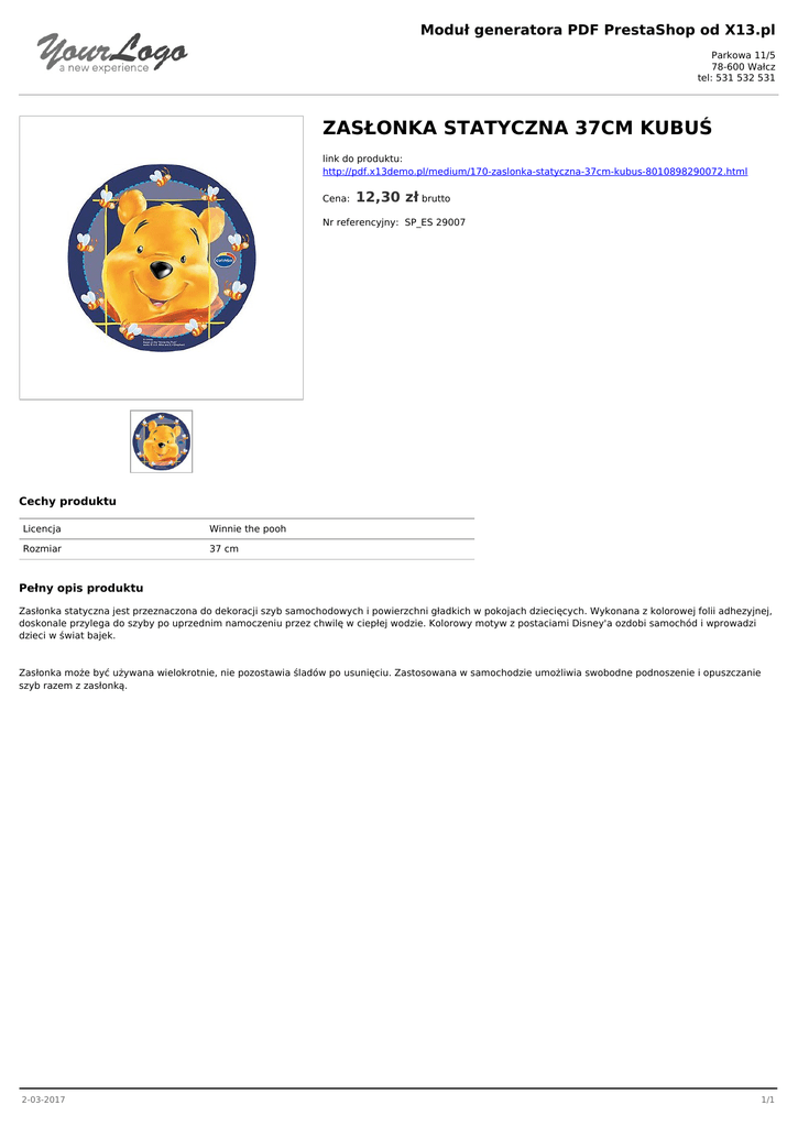 Moduł generatora PDF PrestaShop od X13.pl Parkowa 11/5 78-600 Wałcz tel: 531 532 531 ZASŁONKA STATYCZNA 37CM KUBUŚ link do produktu: http://pdf.x13demo.pl/medium/170-zaslonka-statyczna-37cm-kubus-8010898290072.html Cena: 12,30 zł brutto Nr referencyjny: SP_ES 29007 Cechy produktu Licencja Winnie the pooh Rozmiar 37 cm Pełny opis produktu Zasłonka statyczna jest przeznaczona do dekoracji szyb samochodowych i powierzchni gładkich w pokojach dziecięcych. Wykonana z kolorowej folii adhezyjnej, doskonale przylega do szyby po uprzednim namoczeniu przez chwilę w ciepłej wodzie. Kolorowy motyw z postaciami Disney'a ozdobi samochód i wprowadzi dzieci w świat bajek. Zasłonka może być używana wielokrotnie, nie pozostawia śladów po usunięciu. Zastosowana w samochodzie umożliwia swobodne podnoszenie i opuszczanie szyb razem z zasłonką. 2-03-2017 1/1