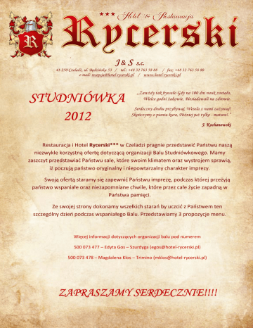 J&S s.c. 41-250 Czeladź, ul. Będzińska 53 / tel.: +48 32 763 58 88 / fax: +48 32 763 58 80 e-mail: [email protected] / www.hotel-rycerski.pl STUDNIÓWKA 2012 ,,Zawżdy tak bywało Gdy na 100 dni nauk zostało, Wielce godni żakowie, Biesiadowali na zdrowie. Serdeczny druhu przybywaj, Wesela z nami zażywaj! Skończymy o pianiu kura, Później już tylko - matura!.” J. Kochanowski Restauracja i Hotel Rycerski*** w Czeladzi pragnie przedstawić Państwu naszą niezwykle korzystną ofertę dotyczącą organizacji Balu Studniówkowego. Mamy zaszczyt przedstawiać Państwu sale, które swoim klimatem oraz wystrojem sprawią, iż poczują państwo oryginalny i niepowtarzalny charakter imprezy. Swoją ofertą staramy się zapewnić Państwu imprezę, podczas której przeżyją państwo wspaniałe oraz niezapomniane chwile, które przez całe życie zapadną w Państwa pamięci. Ze swojej strony dokonamy wszelkich starań by uczcić z Państwem ten szczególny dzień podczas wspaniałego Balu. Przedstawiamy 3 propozycje menu. Więcej informacji dotyczących organizacji balu pod numerem 500 073 477 – Edyta Gos – Szurdyga ([email protected]) 500 073 478 – Magdalena Klos – Trimino ([email protected]) ZAPRASZAMY SERDECZNIE!!!! 1 PROPOZYCJA nr 1 OBIAD: ZUPA: Krem pieczarkowy z groszkiem ptysiowym II DANIE: Kotlet de volaille, frytki, surówka z białej kapusty DESER: Szarlotka z sosem czekoladowym ZIMNA PŁYTA: Półmisek wędlin Decha serów Ryba po grecku Sałatka jarzynowa Roladki szynkowe z musem chrzanowym w galarecie Koreczki serowe Koreczki z wędliną Pieczywo Masło KOLACJA: Barszcz czerwony z uszkami NAPOJE: Kawa/herbata w formie bufetu Soki owocowe w dzbankach – 0,7l / osobę Woda niegazowana z cytryną w dzbankach 1l / osobę Napoje gazowane do kupienia dostępne będą u obsługi w cenach promocyjnych. Koszt 1 os. = 100 zł Dodatkowo zachęcamy do zamówienia Bufetu wiejskiego, który kosztuje zaledwie 10 zł/os., a w jego skład wchodzą najwyższej jakości swojskie wyroby: kiełbasa swojska, kaszanka biała/czarna, karkówka pieczona, smalec ze skwarkami ogórki kiszone pikle, twarożek ze szczypiorkiem pieczywo 2 PROPOZYCJA nr 2 OBIAD: ZUPA: Rosół z makaronem II DANIE: Schab z pieczarkami zapiekany serem, ziemniaki pieczone, sałatka z czerwonej kapusty DESER: Lody waniliowe z sosem wiśniowym ZIMNA PŁYTA: Półmisek wędlin Decha serów Bufet wiejski W skład bufetu wchodzi: kiełbasa swojska, kaszanka biała/czarna, karkówka pieczona, smalec ze skwarkami ogórki kiszone pikle, twarożek ze szczypiorkiem, pieczywo Ryba po grecku Sałatka jarzynowa Roladki szynkowe z musem chrzanowym w galarecie Koreczki serowe Koreczki z wędliną Pieczywo Masło KOLACJA: Żurek na białej kiełbasie z jajkiem NAPOJE: Kawa/herbata w formie bufetu Soki owocowe w dzbankach – 0,7l / osobę Woda niegazowana z cytryną w dzbankach 1l / osobę Napoje gazowane do kupienia dostępne będą u obsługi w cenach promocyjnych. Koszt 1 os. = 120 zł 3 PROPOZYCJA nr 3 OBIAD: ZUPA: Krem kalafiorowy z grzankami II DANIE: Filet z kurczaka z ananasem i serem, puree chrzanowe, surówka z marchewki i jabłka DESER: Szarlotka z sosem czekoladowym ZIMNA PŁYTA: Półmisek wędlin Decha serów Bufet wiejski W skład bufetu wchodzi: kiełbasa swojska, kaszanka biała/czarna, karkówka pieczona, smalec ze skwarkami ogórki kiszone pikle, twarożek ze szczypiorkiem, pieczywo Ryba po grecku Sałatka jarzynowa Roladki szynkowe z musem chrzanowym w galarecie Koreczki serowe Koreczki z wędliną Pieczywo Masło KOLACJA: Paluszki schabowe w sosie, kluski białe, sałatka z czerwonej kapusty NAPOJE: Kawa/herbata w formie bufetu Soki owocowe w dzbankach 0,5l / osobę Coca – cola/Fanta/Sprite 0,5l / osobę Woda niegazowana z cytryną w dzbankach – 1l / osobę Koszt 1 os. = 130 zł 4