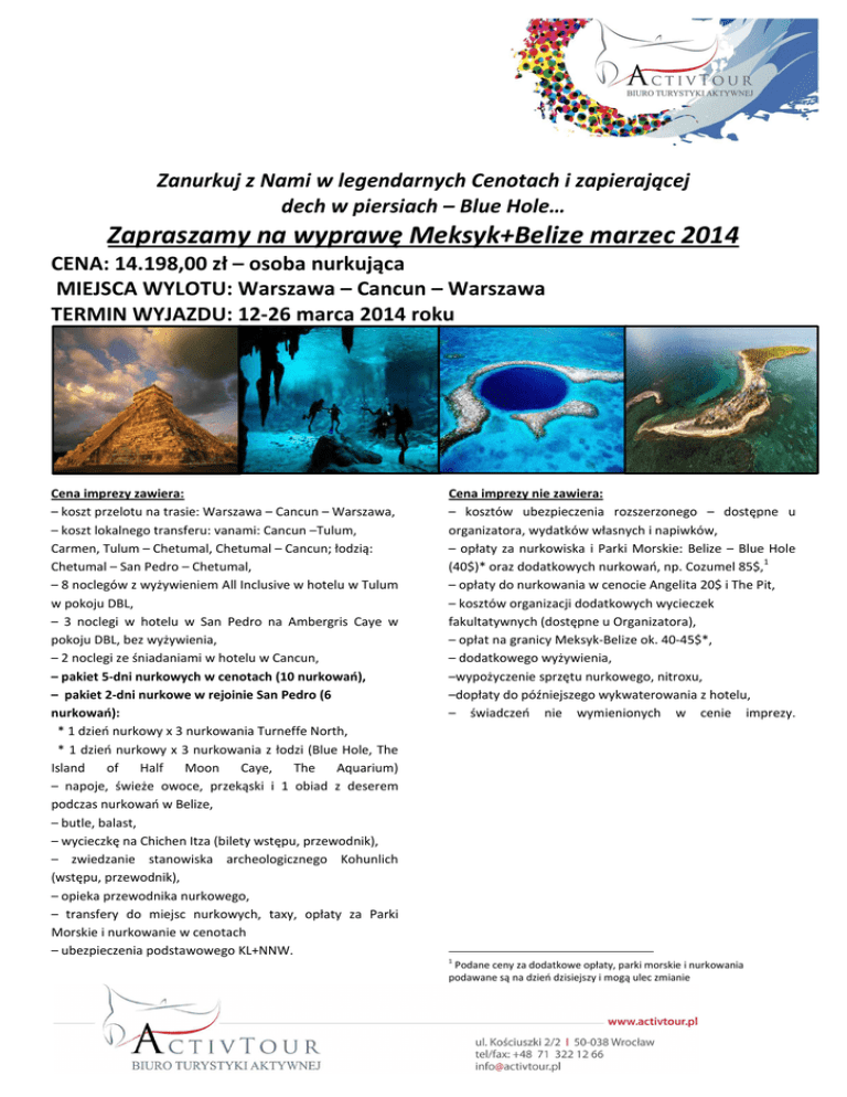 Zanurkuj z Nami w legendarnych Cenotach i zapierającej dech w piersiach – Blue Hole… Zapraszamy na wyprawę Meksyk+Belize marzec 2014 CENA: 14.198,00 zł – osoba nurkująca MIEJSCA WYLOTU: Warszawa – Cancun – Warszawa TERMIN WYJAZDU: 12-26 marca 2014 roku Cena imprezy zawiera: – koszt przelotu na trasie: Warszawa – Cancun – Warszawa, – koszt lokalnego transferu: vanami: Cancun –Tulum, Carmen, Tulum – Chetumal, Chetumal – Cancun; łodzią: Chetumal – San Pedro – Chetumal, – 8 noclegów z wyżywieniem All Inclusive w hotelu w Tulum w pokoju DBL, – 3 noclegi w hotelu w San Pedro na Ambergris Caye w pokoju DBL, bez wyżywienia, – 2 noclegi ze śniadaniami w hotelu w Cancun, – pakiet 5-dni nurkowych w cenotach (10 nurkowań), – pakiet 2-dni nurkowe w rejoinie San Pedro (6 nurkowań): * 1 dzień nurkowy x 3 nurkowania Turneffe North, * 1 dzień nurkowy x 3 nurkowania z łodzi (Blue Hole, The Island of Half Moon Caye, The Aquarium) – napoje, świeże owoce, przekąski i 1 obiad z deserem podczas nurkowań w Belize, – butle, balast, – wycieczkę na Chichen Itza (bilety wstępu, przewodnik), – zwiedzanie stanowiska archeologicznego Kohunlich (wstępu, przewodnik), – opieka przewodnika nurkowego, – transfery do miejsc nurkowych, taxy, opłaty za Parki Morskie i nurkowanie w cenotach – ubezpieczenia podstawowego KL+NNW. Cena imprezy nie zawiera: – kosztów ubezpieczenia rozszerzonego – dostępne u organizatora, wydatków własnych i napiwków, – opłaty za nurkowiska i Parki Morskie: Belize – Blue Hole 1 (40$)* oraz dodatkowych nurkowań, np. Cozumel 85$, – opłaty do nurkowania w cenocie Angelita 20$ i The Pit, – kosztów organizacji dodatkowych wycieczek fakultatywnych (dostępne u Organizatora), – opłat na granicy Meksyk-Belize ok. 40-45$*, – dodatkowego wyżywienia, –wypożyczenie sprzętu nurkowego, nitroxu, –dopłaty do późniejszego wykwaterowania z hotelu, – świadczeń nie wymienionych w cenie imprezy. 1 Podane ceny za dodatkowe opłaty, parki morskie i nurkowania podawane są na dzień dzisiejszy i mogą ulec zmianie Ramowy program wyjazdu: 1 Dzień: 12 marca 2014 Zbiórka na lotnisku w Warszawie w godzinach porannych, ok 2,5 godziny przed wylotem, odprawa paszportowo – bagażowa, wylot do Meksyku, przylot do Meksyku, Transfer do resortu w Tulum, zakwaterowanie, czas wolny. 2 Dzień: 13 marca 2014 Śniadanie, Czas wolny na relaks i wypoczynek, Nocleg. 3-5 Dzień: 14-16 marca 2014 Śniadanie, Spotkanie z Divemasterem o godzinie 8:30, sprawdzenie sprzętu, odprawa, 2 nurkowania w cenotach, czas wolny, wypoczynek. 6 Dzień: 17 marca 2014 Śniadanie, Czas wolny - możliwość dokupienia dodatkowych nurkowań na miejscu. 7-8 Dzień: 18-19 marca 2014 Śniadanie, Spotkanie z Divemasterem o godzinie 8:30, sprawdzenie sprzętu, odprawa, 2 nurkowania w cenotach, czas wolny, wypoczynek. 9 Dzień: 20 marca 2014 Śniadanie, Przejazd do Chetumal, Formalności związane z przekroczeniem granicy z Belize (wypełnienie dokumentów oraz uiszczenie opłaty ok. 4045$), transfer łodzią do San Pedro o godzinie 15:00 (ok. 1 h 45 min do 2 h), przejazd samochodami do hotelu, Zakwaterowanie w resorcie w San Pedro ok. godziny 18:00, czas wolny i wypoczynek. 10 Dzień: 21 marca 2014 Pobudka, O godzinie 5:30 odebranie nurków z resortu i transfer do centrum nurkowego, Śniadanie w centrum nurkowym, sprawdzenie sprzętu, odprawa, Transfer łodzią na miejsce nurkowe – Turnefee North, ! 1, 2 i 3 nurkowanie na Atolu Turnefee, w międzyczasie przerwy z przekąskami, obiadem na łodzi, napojami (kawa, soki, herbata, woda) oraz świeżymi owocami☺ Powrót do resortu po trzech nurkowaniach, czas wolny i wypoczynek. 11 Dzień: 22 marca 2014 Pobudka, O godzinie 5:30 odebranie nurków z resortu i transfer do centrum nurkowego, Śniadanie w centrum nurkowym, sprawdzenie sprzętu, odprawa, Transfer łodzią na pierwsze miejsce nurkowe – zjawiskową Blue Hole, !1 nurkowanie – z użycią dwóch pomocniczych lin, czas trwania nurkowania to ok. 30-35 min, przerwa na powierzchni i tramsfer na drugie miejsce nurkowe, ! 2 nurkowanie – Half Moon Caye – czas trwania nurkowania 45 min – 1 h, Przerwa na powierzchni – odpoczynek na wyspie Half Moon Caye, obiad – tradycyjna belizyjska potrwa: Ryż z fasolką, gulasz z kurczaka i sałatka ziemniaczana☺ Na deser podane będzie domowe, świeżo przyżądzone ciasto kokosowe!:) Odpoczynek na wyspie przeznaczony jest na ok. 1,5 h, zatem wstarczy czasu na zwiedzanie wyspy! Godnym polecenia jest Rezerwat Ptaków, w którym znajduje się Redfooted Booby Bird, „głuptak czerwononogi” który żyje tylko na tej wysepce☺ Po obiedzie wyruszamy na trzecie nurkowanie, ! 3 nurkowanie – w miejscu o nazwie Aquarium, czas trwania nurkowania ok. 1 godziny. Powrót do resortu, czas wolny i wypoczynek. 12 Dzień: 23 marca 2014 Śniadanie, Wykwaterowanie z resortu w godzinach porannych, Transfer łodzią do Chetumal (ok. 2 h), Przejazd do Cancun - po drodze przystanek i zwiedzanie niezywkłego miejsca archeologicznego Kohunlich, Zakwaterowanie w hotelu w godzinach wieczornych. 13 Dzień: 24 marca 2014 Śniadanie, wycieczka fakultatywna: Valladolid – 7 Nowy Cud Świata, Chichen Itza (UNESCO) Ten dzień zapadnie nam na długo w pamięci, zwiedzimy bowiem najbardziej znane zabytki Kultury Majów. Przejazd do wpisanej na Listę Światowego Dziedzictwa Kultury UNESCO strefy archeologicznej w Chichen Itza – zwiedzanie stolicy Nowego Państwa Majów: Pałac Jaguara, Obserwatorium, Rytualne Boisko do gry w Pelote, Pałac Tysiąca Kolumn. Powrót do resortu, czas wolny i wypoczynek. Powrót do resortu, czas wolny. 14 Dzień: 25 marca 2014 Śniadanie, czas wolny, Przejazd na lotnisko i przelot do Polski w godzinach wieczornych. 15 Dzień: 26 marca 2014 Przylot na warszawskie lotnisko popołudniowych, zakończenie imprezy☺ w godzinach Hotel w Tulum Ośrodek ten usytuowany jest 300 metrów od prywatnej plaży nad