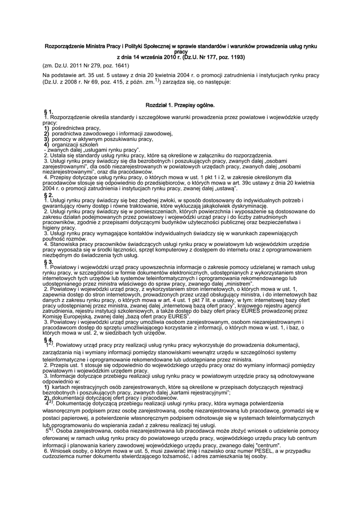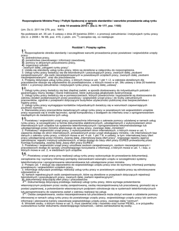 Rozporządzenie Ministra Pracy i Polityki Społecznej w sprawie standardów i warunków prowadzenia usług rynku pracy z dnia 14 września 2010 r. (Dz.U. Nr 177, poz. 1193) (zm. Dz.U. 2011 Nr 279, poz. 1641) Na podstawie art. 35 ust. 5 ustawy z dnia 20 kwietnia 2004 r. o promocji zatrudnienia i instytucjach rynku pracy (Dz.U. z 2008 r. Nr 69, poz. 415, z późn. zm.1)) zarządza się, co następuje: Rozdział 1. Przepisy ogólne. § 1. 1. Rozporządzenie określa standardy i szczegółowe warunki prowadzenia przez powiatowe i wojewódzkie urzędy pracy: 1) pośrednictwa pracy, 2) poradnictwa zawodowego i informacji zawodowej, 3) pomocy w aktywnym poszukiwaniu pracy, 4) organizacji szkoleń - zwanych dalej „usługami rynku pracy”. 2. Ustala się standardy usług rynku pracy, które są określone w załączniku do rozporządzenia. 3. Usługi rynku pracy świadczy się dla bezrobotnych i poszukujących pracy, zwanych dalej „osobami zarejestrowanymi”, dla osób niezarejestrowanych w powiatowych urzędach pracy, zwanych dalej „osobami niezarejestrowanymi”, oraz dla pracodawców. 4. Przepisy dotyczące usług rynku pracy, o których mowa w ust. 1 pkt 1 i 2, w zakresie określonym dla pracodawców stosuje się odpowiednio do przedsiębiorców, o których mowa w art. 39c ustawy z dnia 20 kwietnia 2004 r. o promocji zatrudnienia i instytucjach rynku pracy, zwanej dalej „ustawą”. § 2. 1. Usługi rynku pracy świadczy się bez zbędnej zwłoki, w sposób dostosowany do indywidualnych potrzeb i gwarantujący równy dostęp i równe traktowanie, które wykluczają jakąkolwiek dyskryminację. 2. Usługi rynku pracy świadczy się w pomieszczeniach, których powierzchnia i wyposażenie są dostosowane do zakresu działań podejmowanych przez powiatowy i wojewódzki urząd pracy i do liczby zatrudnionych pracowników, zgodnie z przepisami dotyczącymi budynków użyteczności publicznej oraz bezpieczeństwa i higieny pracy. 3. Usługi rynku pracy wymagające kontaktów indywidualnych świadczy się w warunkach zapewniających poufność rozmów. 4. Stanowiska pracy pracowników świadczących usługi rynku pracy w powiatowym lub wojewódzkim urzędzie pracy wyposaża się w środki łączności, sprzęt komputerowy z dostępem do internetu oraz z oprogramowaniem niezbędnym do świadczenia tych usług. § 3. 1. Powiatowy i wojewódzki urząd pracy upowszechnia informacje o zakresie pomocy udzielanej w ramach usług rynku pracy, w szczególności w formie dokumentów elektronicznych, udostępnianych z wykorzystaniem stron internetowych tych urzędów lub systemów teleinformatycznych i oprogramowania rekomendowanego lub udostępnianego przez ministra właściwego do spraw pracy, zwanego dalej „ministrem”. 2. Powiatowy i wojewódzki urząd pracy, z wykorzystaniem stron internetowych, o których mowa w ust. 1, zapewnia dostęp do stron internetowych, prowadzonych przez urząd obsługujący ministra, i do internetowych baz danych z zakresu rynku pracy, o których mowa w art. 4 ust. 1 pkt 7 lit. e ustawy, w tym: internetowej bazy ofert pracy udostępnianej przez ministra, zwanej dalej „internetową bazą ofert pracy”, krajowego rejestru agencji zatrudnienia, rejestru instytucji szkoleniowych, a także dostęp do bazy ofert pracy EURES prowadzonej przez Komisję Europejską, zwanej dalej „bazą ofert pracy EURES”. 3. Powiatowy i wojewódzki urząd pracy umożliwia osobom zarejestrowanym, osobom niezarejestrowanym i pracodawcom dostęp do sprzętu umożliwiającego korzystanie z informacji, o których mowa w ust. 1, i baz, o których mowa w ust. 2, w siedzibach tych urzędów. § 4. 12). Powiatowy urząd pracy przy realizacji usług rynku pracy wykorzystuje do prowadzenia dokumentacji, zarządzania nią i wymiany informacji pomiędzy stanowiskami wewnątrz urzędu w szczególności systemy teleinformatyczne i oprogramowanie rekomendowane lub udostępniane przez ministra. 2. Przepis ust. 1 stosuje się odpowiednio do wojewódzkiego urzędu pracy oraz do wymiany informacji pomiędzy powiatowym i wojewódzkim urzędem pracy. 3. Informacje dotyczące przebiegu realizacji usług rynku pracy w powiatowym urzędzie pracy są odnotowywane odpowiednio w: 1) kartach rejestracyjnych osób zarejestrowanych, które są określone w przepisach dotyczących rejestracji bezrobotnych i poszukujących pracy, zwanych dalej „kartami rejestracyjnymi”; 2) dokumentacji dotyczącej ofert pracy i pracodawców. 43). Dokumentację dotyczącą przebiegu realizacji usługi rynku pracy, która wymaga potwierdzenia własnoręcznym podpisem przez osobę zarejestrowaną, osobę niezarejestrowaną lub pracodawcę, gromadzi się w postaci papierowej, a potwierdzenie własnoręcznym podpisem odnotowuje się w systemach teleinformatycznych lub oprogramowaniu do wspierania zadań z zakresu realizacji tej usługi. 54). Osoba zarejestrowana, osoba niezarejestrowana lub pracodawca może złożyć wniosek o udzielenie pomocy oferowanej w ramach usług rynku pracy do powiatowego urzędu pracy, wojewódzkiego urzędu pracy lub centrum informacji i planowania kariery zawodowej wojewódzkiego urzędu pracy, zwanego dalej "centrum". 6. Wniosek osoby, o którym mowa w ust. 5, musi zawierać imię i nazwisko oraz numer PESEL, a w przypadku cudzoziemca numer dokumentu stwierdzającego tożsamość, i adres zamieszkania tej osoby. 7. Wniosek pracodawcy, o którym mowa w ust. 5, musi zawierać nazwę i adres pracodawcy, numer telefonu, imię i nazwisko pracodawcy lub pracownika, wskazanego przez tego pracodawcę do kontaktów z urzędem pracy lub centrum, oraz numer identyfikacji podatkowej. 8. Osoba zarejestrowana, osoba niezarejestrowana lub pracodawca, składając wniosek, o którym mowa w ust. 5, lub inny dokument, na którym jest wymagany własnoręczny podpis, może dokonać tego z wykorzystaniem systemów teleinformatycznych wyłącznie za pomocą podpisu, o którym mowa w przepisach dotyczących podpisu elektroniczneg