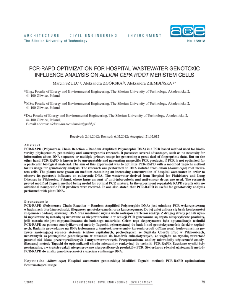 A R C H I T E C T U R E C I V I L E N G I N E E R I N G E N V I R O N M E N T T h e S i l e s i a n U n i v e r s i t y o f Te c h n o l o g y N o. 1 / 2 0 1 2 PCR-RAPD OPTIMIZATION FOR HOSPITAL WASTEWATER GENOTOXIC INFLUENCE ANALYSIS ON ALLIUM CEPA ROOT MERISTEM CELLS Marcin SZULC a, Aleksandra ZGÓRSKA b, Aleksandra ZIEMBIŃSKA c* a Eng.; Faculty of Energy and Environmental Engineering, The Silesian University of Technology, Akademicka 2, 44-100 Gliwice, Poland b MSc; Faculty of Energy and Environmental Engineering, The Silesian University of Technology, Akademicka 2, 44-100 Gliwice, Poland c Dr.; Faculty of Energy and Environmental Engineering, The Silesian University of Technology, Akademicka 2, 44-100 Gliwice, Poland, E-mail address: [email protected] Received: 2.01.2012; Revised: 6.02.2012; Accepted: 21.02.012 Abstract PCR-RAPD (Polymerase Chain Reaction – Random Amplified Polymorphic DNA) is a PCR based method used for biodiversity, phylogenetics, genotoxicity and cancerogenesis research. It possesses several advantages, such as no necessity for information about DNA sequence or multiple primers usage for generating a great deal of fingerprints data. But on the other hand PCR-RAPD is known to be unrepeatable and generating unspecific PCR products, if PCR is not optimized for a particular biological material. The aim of this experiment was to optimize PCR-RAPD with a modified Taguchi method for its usage for genotoxicity analysis. The research was performed on DNA isolated from onion (Allium cepa) root meristem cells. The plants were grown on medium containing an increasing concentration of hospital wastewater in order to observe its genotoxic influence on eukaryotic DNA. The wastewater derived from Hospital for Phthisiatry and Lung Diseases in Pilchowice, Poland, where large amount of anti-tuberculosis and anti-cancer drugs are used. The research proved modified Taguchi method being useful for optimal PCR mixture. In the experiment repeatable RAPD results with no additional nonspecific PCR products were received. It was also stated that PCR-RAPD is useful for genotoxicity analysis performed with plant DNA. Streszczenie PCR-RAPD (Polymerase Chain Reaction – Random Amplified Polymorphic DNA) jest odmianą PCR wykorzystywaną w badaniach bioróżnorodności, filogenezy, genotoksyczności oraz kancerogenezy. Do jej zalet zalicza się brak konieczności znajomości badanej sekwencji DNA oraz możliwość użycia wielu rodzajów starterów reakcji. Z drugiej strony jednak wyniki uzyskiwane tą metodą są uznawane za niepowtarzalne, a w reakcji PCR generowane są często niespecyficzne produkty, jeśli metoda nie jest zoptymalizowana do badanego materiału. Celem tego eksperymentu była optymalizacja techniki PCR-RAPD za pomocą zmodyfikowanej metody Taguchi, wykorzystanej do badań nad genotoksycznością ścieków szpitalnych. Badania prowadzono na DNA izolowanym z komórek merystemów korzenia cebuli (Allium cepa), hodowanych na pożywce zawierającej rosnące stężenia ścieków szpitalnych, pochodzących ze Szpitala Chorób Płuc w Pilchowicach, uznawanych za potencjalnie genotoksyczne w stosunku do komórek eukariotycznych, ze względu na wysoką zawartość pozostałości leków przeciwgruźlicznych i antynowotworowych. Przeprowadzone analizy udowodniły użyteczność zmodyfikowanej metody Taguchi do optymalizacji składu mieszaniny reakcyjnej do techniki PCR-RAPD. Uzyskane wyniki były powtarzalne, a w trakcie reakcji nie generowano niespecyficznych produktów PCR. Stwierdzono również użyteczność metody PCR-RAPD do analiz genotoksyczności z użyciem roślinnego DNA. K e y w o r d s : Allium cepa; Hospital wastewater genotoxicity; Modified Taguchi method; PCR-RAPD optimization; Ecotoxicological usage. 1/2012 ARCHITECTURE CIVIL ENGINEERING ENVIRONMENT 79