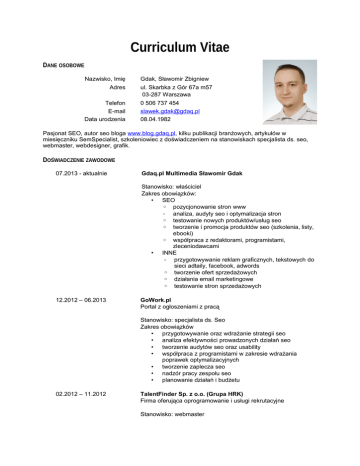 Curriculum Vitae DANE OSOBOWE Nazwisko, Imię Adres Telefon E-mail Data urodzenia Gdak, Sławomir Zbigniew ul. Skarbka z Gór 67a m57 03-287 Warszawa 0 506 737 454 [email protected] 08.04.1982 Pasjonat SEO, autor seo bloga www.blog.gdaq.pl, kilku publikacji branżowych, artykułów w miesięczniku SemSpecialist, szkoleniowiec z doświadczeniem na stanowiskach specjalista ds. seo, webmaster, webdesigner, grafik. DOŚWIADCZENIE ZAWODOWE 07.2013 - aktualnie Gdaq.pl Multimedia Sławomir Gdak Stanowisko: właściciel Zakres obowiązków: • SEO ◦ pozycjonowanie stron www ◦ analiza, audyty seo i optymalizacja stron ◦ testowanie nowych produktów/usług seo ◦ tworzenie i promocja produktów seo (szkolenia, listy, ebooki) ◦ współpraca z redaktorami, programistami, zleceniodawcami • INNE ◦ przygotowywanie reklam graficznych, tekstowych do sieci adtaily, facebook, adwords ◦ tworzenie ofert sprzedażowych ◦ działania email marketingowe ◦ testowanie stron sprzedażowych 12.2012 – 06.2013 GoWork.pl Portal z ogłoszeniami z pracą Stanowisko: specjalista ds. Seo Zakres obowiązków • przygotowywanie oraz wdrażanie strategii seo • analiza efektywności prowadzonych działań seo • tworzenie audytów seo oraz usability • współpraca z programistami w zakresie wdrażania poprawek optymalizacyjnych • tworzenie zaplecza seo • nadzór pracy zespołu seo • planowanie działań i budżetu 02.2012 – 11.2012 TalentFinder Sp. z o.o. (Grupa HRK) Firma oferująca oprogramowanie i usługi rekrutacyjne Stanowisko: webmaster Zakres obowiązków: • prace graficzne i wdrożeniowe przy projekcie TalentFinder • testowanie oprogramowania • pozycjonowanie strony aplikacji internetowej • opracowywanie materiałów graficznych 10.2008 - 01.2012 HRK SA Firma doradztwa personalnego Stanowisko: webmaster Zakres obowiązków: • projektowanie grafiki do stron www • wdrażanie grafiki do projektów w ASP .NET • pisanie stron www (html+css) • projektowanie banerów internetowych • przygotowywanie newsletterów • projektowanie grafiki, cięcie i administracja stronami w systemie Sitefinity • prace graficzne i wdrożeniowe przy projekcie TalentFinder 08.2007 – 09.2008 Perspektywy Press sp. z o.o. Wydawnictwo edukacyjne Stanowisko: grafik komputerowy / web designer Zakres obowiązków: • projektowanie grafiki do stron www • cięcie i kodowanie grafiki do systemu Joomla • pisanie stron www (html+css) • administracja stronami www w systemie Joomla • administracja stron w systemie Joomla • projektowanie banerów internetowych • przygotowywanie newsletterów 03.2006 – 07.2007 Gdaq.pl Multimedia Sławomir Gdak Agencja reklamowa Stanowisko: właściciel Zakres obowiązków: • przygotowywanie folderów reklamowych i wizytówek • projektowanie grafiki do stron www • pisanie stron www (html+css) • administracja stron www • pozycjonowanie i optymalizacja stron www (SEO) • projektowanie banerów internetowych 09.2004 - 12.2006 PLAY Sp. z o.o. Wydawnictwo gier i programów komputerowych Stanowisko: grafik komputerowy Zakres obowiązków: • przygotowywanie do druku okładek gier i programów komputerowych • przygotowywanie materiałów reklamowych dla developerów zagranicznych • utrzymywanie istniejących serwisów internetowych • • • • • • • tworzenie stron internetowych administracja serwisów internetowych testowanie programów użytkowych oraz gier PC pozyskiwanie nowych zespołów developerskich nadzór i prowadzenie projektów gier PC i Java oraz programów lokalizacje gier PC przygotowywanie newsletterów (mailing) 01.04.2004 Wydawnictwo LYNX - SFT Opracowanie graficzne książek, umowa o dzieło 2003 Projektowanie stron www na umowę zlecenie WYKSZTAŁCENIE 2006 - 2008 Internetowa Policealna Szkoła E-biznesu im. Adama Smitha 2001 - 2003 Policealne Studium Plastyczne „COLLAGE” Kierunek: grafika komputerowa 1997 - 2001 Liceum Zawodowe Rzemiosł Artystycznych Kierunek: grawerstwo INFORMACJE DODATKOWE Szkolenia „Pozycjonowanie Zaawansowane” - 06-07.02.2014, Katowice, Xann Internet Solutions „Szkolenie SEO” Silesia SEM 2013 - 29.11.2013, Warszawa, AdMedia.pl „Szkolenie z Google Analytics” - 19.04.2013, Warszawa, MaxRoy „SemCamp” - 07.2012 Warszawa, „Szkolenie SEO Pro: Link Building” - 06.06.2012 Warszawa, MaxROY „Szkolenie z pozycjonowania zaawansowanego” - 09.02.2012 Katowice, Xann Internet Solutions "Szkolenie Usability" - 11.12.2009 Poznań, MaxROY "Szkolenie AdWords - poziom podstawowy – średniozaawansowany" - 24.03.2009 Warszawa, MaxROY "Szkolenie AdWords - poziom zaawansowany" - 25.03.2009 Warszawa, MaxROY Własne publikacje „Seo Guru” - szkolenie video z pozycjonowania „Magiczna siła słowa w pozycjonowaniu” - szkolenie video z seo copywritingu „Pozycjonowanie krok po kroku” - ebook nt. pozycjonowania „Pozycjonowanie dla początkujących” - ebook nt. Pozycjonowania wydany w wydawnictwie Złote Myśli 05.07 Autor w miesięczniku SemSpecialist "Sztuczki i kruczki w umowach agencji seo" "Css czyni cuda? Na pewno ułatwia życie programistom i grafikom" Język obcy Języki programowania Narzędzia Angielski: średnio zaawansowany HTML, CSS Analiza: Ahrefs, SpyWords, Seo SpyGlass, Google Analitycs, Website Auditor, WebTools, SEO Odkurzacz, Screaming Frog Dodawarki: SeoLight, SeoBohater, Publiker, Seo Adder, Scrapebox, Magic Submitter, SickMarketing, KatalogiSubmitter, GSA, ZenBlog, ZenOgloszenia, Inne: Seo Leniviec, eXdomain, SWL-ek, Google AdWords, UltraSEOMaster Hobby, Zainteresowania Prowadzenie własnego bloga nt. seo pod adresem http://www.blog.gdaq.pl Pozycjonowanie i optymalizacja stron WWW, marketing internetowy, grafika komputerowa, motywacja. Wyrażam zgodę na przetwarzanie moich danych osobowych zawartych w mojej ofercie pracy dla potrzeb niezbędnych do realizacji procesu rekrutacji (zgodnie z ustawą z dn.29.08.1997 r. o Ochronie Danych Osobowych, Dz. U. z 2002 nr. 