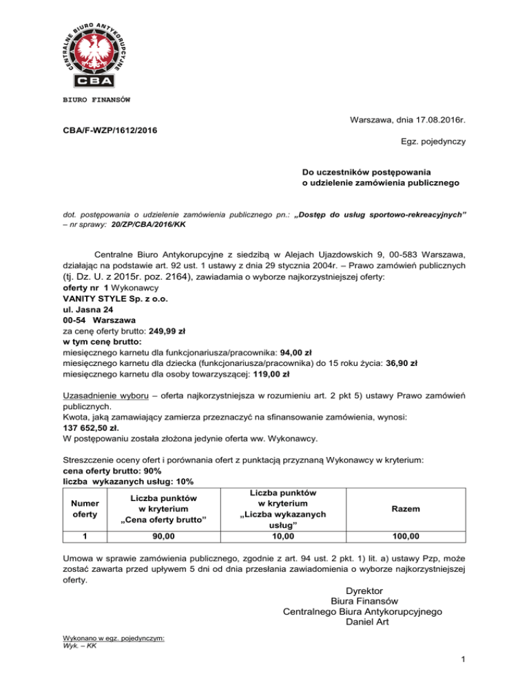 BIURO FINANSÓW Warszawa, dnia 17.08.2016r. CBA/F-WZP/1612/2016 Egz. pojedynczy Do uczestników postępowania o udzielenie zamówienia publicznego dot. postępowania o udzielenie zamówienia publicznego pn.: „Dostęp do usług sportowo-rekreacyjnych” – nr sprawy: 20/ZP/CBA/2016/KK Centralne Biuro Antykorupcyjne z siedzibą w Alejach Ujazdowskich 9, 00-583 Warszawa, działając na podstawie art. 92 ust. 1 ustawy z dnia 29 stycznia 2004r. – Prawo zamówień publicznych (tj. Dz. U. z 2015r. poz. 2164), zawiadamia o wyborze najkorzystniejszej oferty: oferty nr 1 Wykonawcy VANITY STYLE Sp. z o.o. ul. Jasna 24 00-54 Warszawa za cenę oferty brutto: 249,99 zł w tym cenę brutto: miesięcznego karnetu dla funkcjonariusza/pracownika: 94,00 zł miesięcznego karnetu dla dziecka (funkcjonariusza/pracownika) do 15 roku życia: 36,90 zł miesięcznego karnetu dla osoby towarzyszącej: 119,00 zł Uzasadnienie wyboru – oferta najkorzystniejsza w rozumieniu art. 2 pkt 5) ustawy Prawo zamówień publicznych. Kwota, jaką zamawiający zamierza przeznaczyć na sfinansowanie zamówienia, wynosi: 137 652,50 zł. W postępowaniu została złożona jedynie oferta ww. Wykonawcy. Streszczenie oceny ofert i porównania ofert z punktacją przyznaną Wykonawcy w kryterium: cena oferty brutto: 90% liczba wykazanych usług: 10% Liczba punktów Liczba punktów Numer w kryterium w kryterium Razem oferty „Liczba wykazanych „Cena oferty brutto” usług” 1 90,00 10,00 100,00 Umowa w sprawie zamówienia publicznego, zgodnie z art. 94 ust. 2 pkt. 1) lit. a) ustawy Pzp, może zostać zawarta przed upływem 5 dni od dnia przesłania zawiadomienia o wyborze najkorzystniejszej oferty. Dyrektor Biura Finansów Centralnego Biura Antykorupcyjnego Daniel Art Wykonano w egz. pojedynczym: Wyk. – KK 1