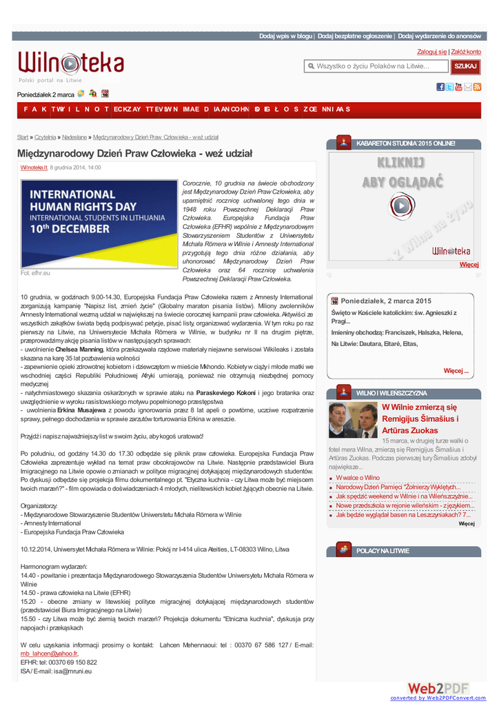 Dodaj wpis w blogu | Dodaj bezpłatne ogłoszenie | Dodaj wydarzenie do anonsów Zaloguj się | Załóż konto Wszystko o życiu Polaków na Litwie... SZUKAJ Poniedziałek 2 marca F A K T WY I L N O T EC KZ AY TT EV LW N IM AE D IA AN CO HN S O EG Ł O S Z OE NN I AA S Start » Czytelnia » Nadesłane » Międzynarodowy Dzień Praw Człowieka - weź udział KABARETON STUDNIA`2015 ONLINE! Międzynarodowy Dzień Praw Człowieka - weź udział Wilnoteka.lt, 8 grudnia 2014, 14:00 Fot. efhr.eu Corocznie, 10 grudnia na świecie obchodzony jest Międzynarodowy Dzień Praw Człowieka, aby upamiętnić rocznicę uchwalonej tego dnia w 1948 roku Powszechnej Deklaracji Praw Człowieka. Europejska Fundacja Praw Człowieka (EFHR) wspólnie z Międzynarodowym Stowarzyszeniem Studentów z Uniwersytetu Michała Römera w Wilnie i Amnesty International przygotują tego dnia różne działania, aby uhonorować Międzynarodowy Dzień Praw Człowieka oraz 64 rocznicę uchwalenia Powszechnej Deklaracji Praw Człowieka. 10 grudnia, w godzinach 9.00-14.30, Europejska Fundacja Praw Człowieka razem z Amnesty International zorganizują kampanię "Napisz list, zmień życie" (Globalny maraton pisania listów). Miliony zwolenników Amnesty International wezmą udział w największej na świecie corocznej kampanii praw człowieka. Aktywiści ze wszystkich zakątków świata będą podpisywać petycje, pisać listy, organizować wydarzenia. W tym roku po raz pierwszy na Litwie, na Uniwersytecie Michała Römera w Wilnie, w budynku nr II na drugim piętrze, przeprowadzimy akcję pisania listów w następujących sprawach: - uwolnienie Chelsea Manning, która przekazywała rządowe materiały niejawne serwisowi Wikileaks i została skazana na karę 35 lat pozbawienia wolności - zapewnienie opieki zdrowotnej kobietom i dziewczętom w mieście Mkhondo. Kobiety w ciąży i młode matki we wschodniej części Republiki Południowej Afryki umierają, ponieważ nie otrzymują niezbędnej pomocy medycznej - natychmiastowego skazania oskarżonych w sprawie ataku na Paraskeviego Kokoni i jego bratanka oraz uwzględnienie w wyroku rasistowskiego motywu popełnionego przestępstwa - uwolnienia Erkina Musajewa z powodu ignorowania przez 8 lat apeli o powtórne, uczciwe rozpatrzenie sprawy, pełnego dochodzenia w sprawie zarzutów torturowania Erkina w areszcie. Przyjdź i napisz najważniejszy list w swoim życiu, aby kogoś uratować! Po południu, od godziny 14.30 do 17.30 odbędzie się piknik praw człowieka. Europejska Fundacja Praw Człowieka zaprezentuje wykład na temat praw obcokrajowców na Litwie. Następnie przedstawiciel Biura Imigracyjnego na Litwie opowie o zmianach w polityce migracyjnej dotykającej międzynarodowych studentów. Po dyskusji odbędzie się projekcja filmu dokumentalnego pt. "Etyczna kuchnia - czy Litwa może być miejscem twoich marzeń?" - film opowiada o doświadczeniach 4 młodych, nielitewskich kobiet żyjących obecnie na Litwie. Organizatorzy: - Międzynarodowe Stowarzyszenie Studentów Uniwerstetu Michała Römera w Wilnie - Amnesty International - Europejska Fundacja Praw Człowieka 10.12.2014, Uniwersytet Michała Römera w Wilnie: Pokój nr I-414 ulica Ateities, LT-08303 Wilno, Litwa Więcej Poniedziałek, 2 marca 2015 Święto w Kościele katolickim: św. Agnieszki z Pragi... Imieniny obchodzą: Franciszek, Halszka, Helena, Na Litwie: Dautara, Eitarė, Eitas, Więcej ... WILNO I WILEŃSZCZYZNA W Wilnie zmierzą się Remigijus Šimašius i Artūras Zuokas 15 marca, w drugiej turze walki o fotel mera Wilna, zmierzą się Remigijus Šimašius i Artūras Zuokas. Podczas pierwszej tury Šimašius zdobył największe... W walce o Wilno Narodowy Dzień Pamięci "Żołnierzy Wyklętych... Jak spędzić weekend w Wilnie i na Wileńszczyźnie... Nowe przedszkola w rejonie wileńskim - z językiem... Jak będzie wyglądał basen na Leszczyniakach? 7... Więcej POLACY NA LITWIE Harmonogram wydarzeń: 14.40 - powitanie i prezentacja Międzynarodowego Stowarzyszenia Studentów Uniwersytetu Michała Römera w Wilnie 14.50 - prawa człowieka na Litwie (EFHR) 15.20 - obecne zmiany w litewskiej polityce migracyjnej dotykającej międzynarodowych studentów (przedstawiciel Biura Imigracyjnego na Litwie) 15.50 - czy Litwa może być ziemią twoich marzeń? Projekcja dokumentu "Etniczna kuchnia", dyskusja przy napojach i przekąskach W celu uzyskania informacji prosimy o kontakt: Lahcen Mehennaoui: tel : 00370 67 586 127 / E-mail: [email protected], EFHR: tel: 00370 69 150 822 ISA / E-mail: [email protected] converted by W eb2PDFConvert.com Gimnazjum im. Jana Pawła II Najweselszą Szkołą Wileńszczyzny! Nadesłane przez Europejską Fundację Praw Człowieka --------------------------------------------------------------------------------------------------------------------------Redakcja Wilnoteki nie ponosi odpowiedzialności za treści artykułów nadesłanych. Wyślij znajomemu Komentarze Dodaj nowy komentarz Gimnazjum im. Jana Pawła II jest najweselszą szkołą polską na Wileńszczyźnie. Studniówkowy kabaret w wykonaniu uczniów tej szkoły zdobył największe... Kabareton "StuDnia'2015" już za... Kabareton StuDnia'2015 na żywo w Wilnotece.... Kabaret Inaczej - gość specjalny Kabaretonu... Konkurs Ortograficzny "Dyktando 2015".... Kabareton "StuDnia’2015" już za tydzień! Więcej Nazwisko lub pseudonim: Anonim LITWA E-mail: Zawartość pola nie będzie udostępniana publicznie. Strona domowa: Konserwatystka i liberał w drugiej turze wyborów uzupełniających do sejmu Konserwatystka Radvilė MorkūnaitėMikulėnienė i liberał Šarūnas Gustainis trafili do drugiej tury wyborów uzupełniających do sejmu w okręgu wyborczym Žirm... Komentarz: * Maria Rekść i Zdzisław Palewicz zachowali... W wyborach samorządowych głosował już co czwarty... Litwa wybiera samorządowców Głosowanie przedterminowe z incydentami w tle W niedzielę mieszkańcy Litwy wybiorą radnych i... Więcej ZA 